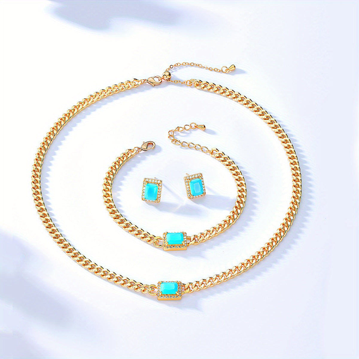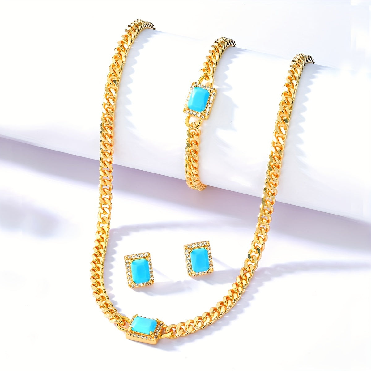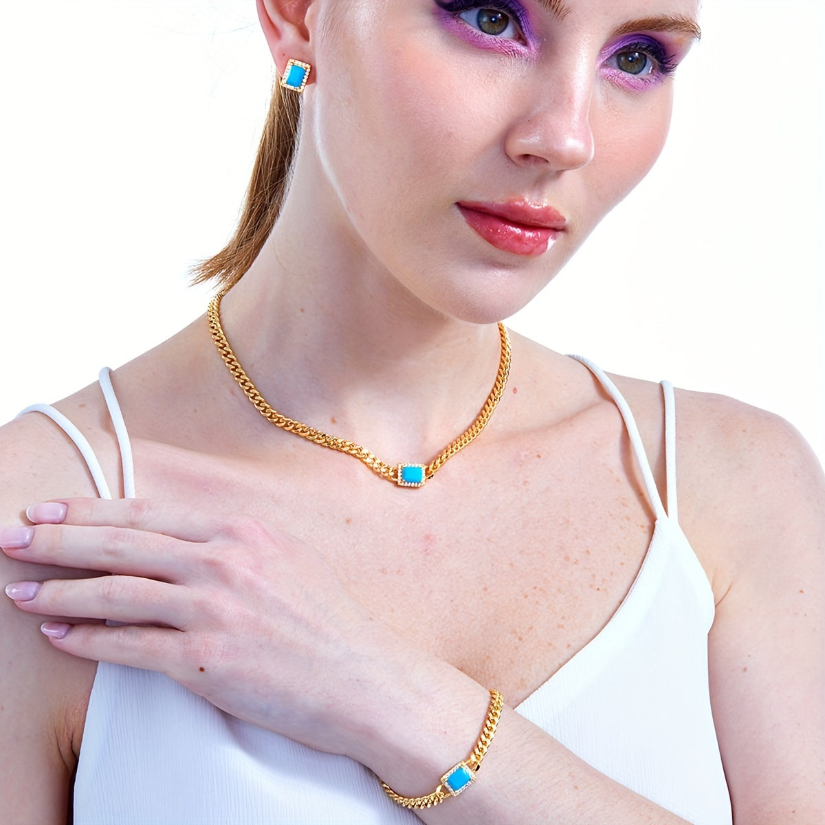 Complete your daily outfits or add a touch of elegance to your party look with this 4-piece jewelry set. This set includes earrings, necklace, and ring, all featuring inlaid turquoise and 18k gold plating.