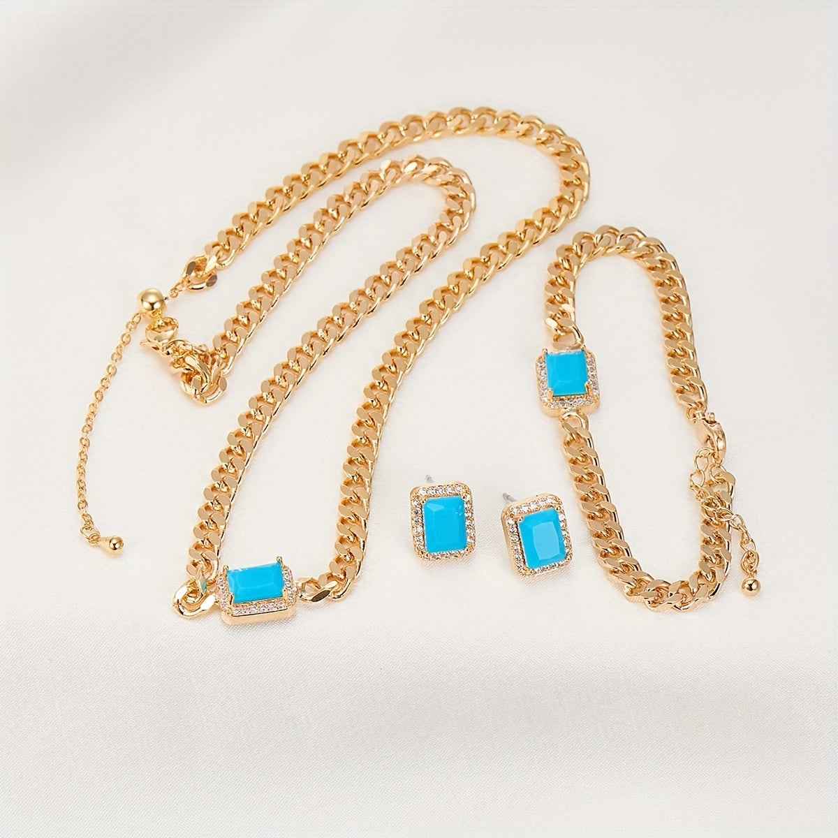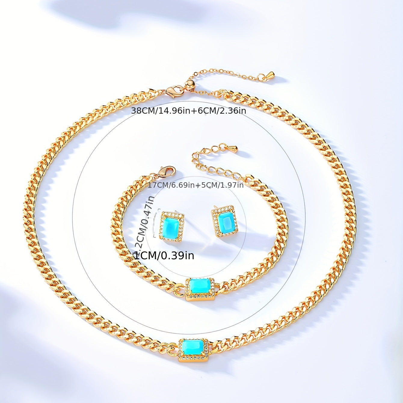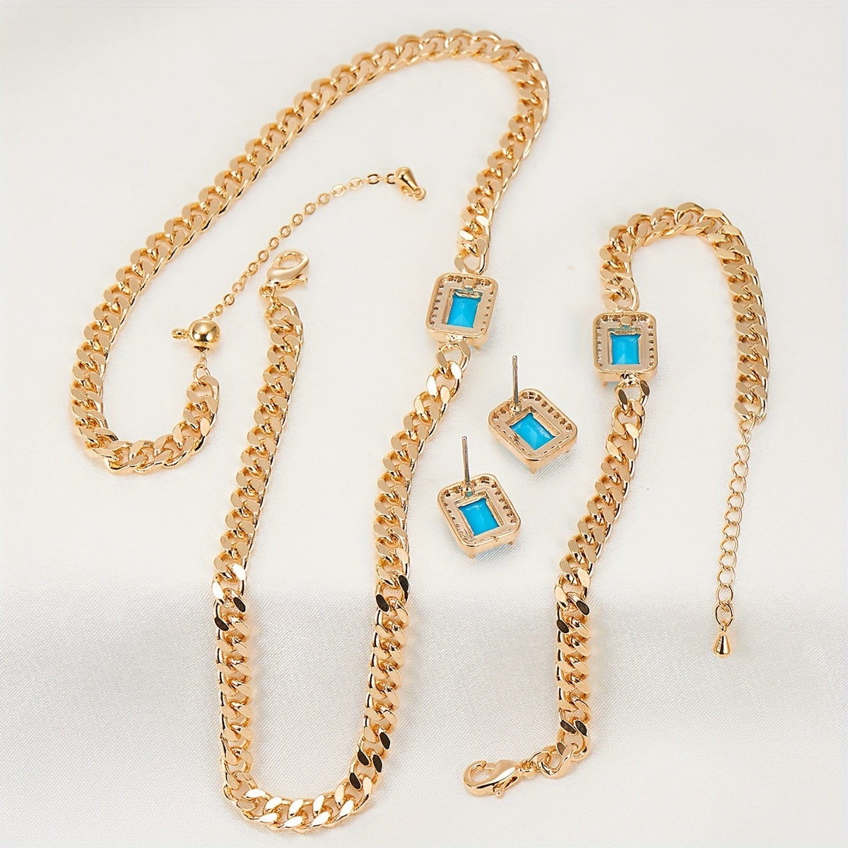 Complete your daily outfits or add a touch of elegance to your party look with this 4-piece jewelry set. This set includes earrings, necklace, and ring, all featuring inlaid turquoise and 18k gold plating.