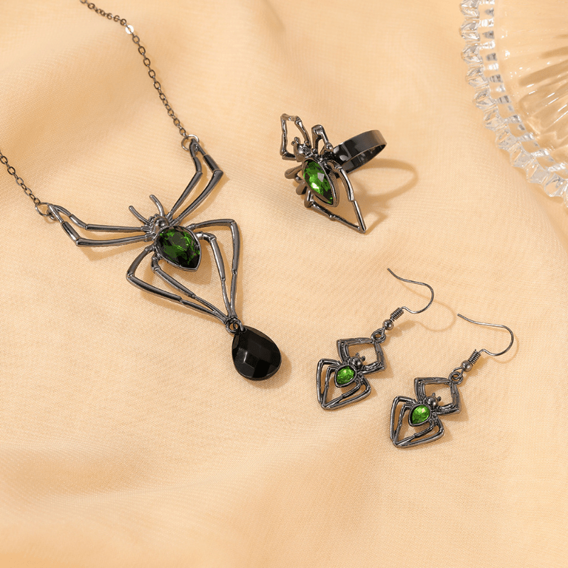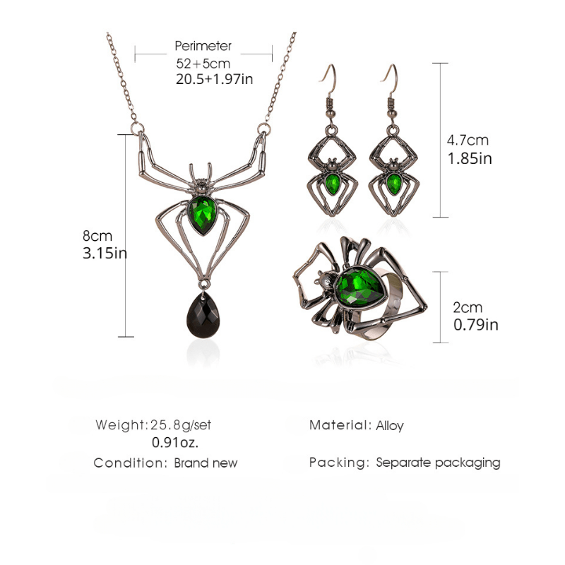 This set includes earrings, necklace, ring with spider pattern & rhinestone. Perfect for Halloween decor & matches daily outfits.