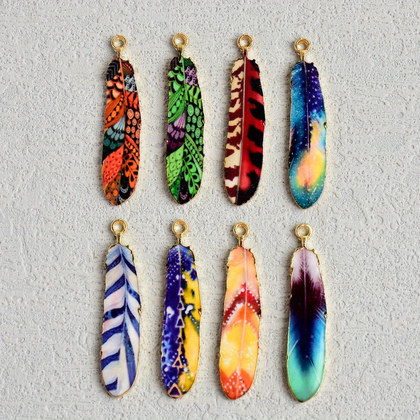 This pack includes 8pcs of ethnic style feather pendant alloy accessories, perfect for earrings, necklaces, bracelets, and key chains.