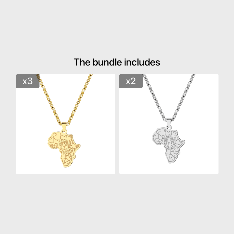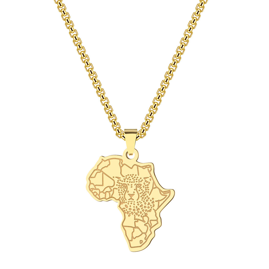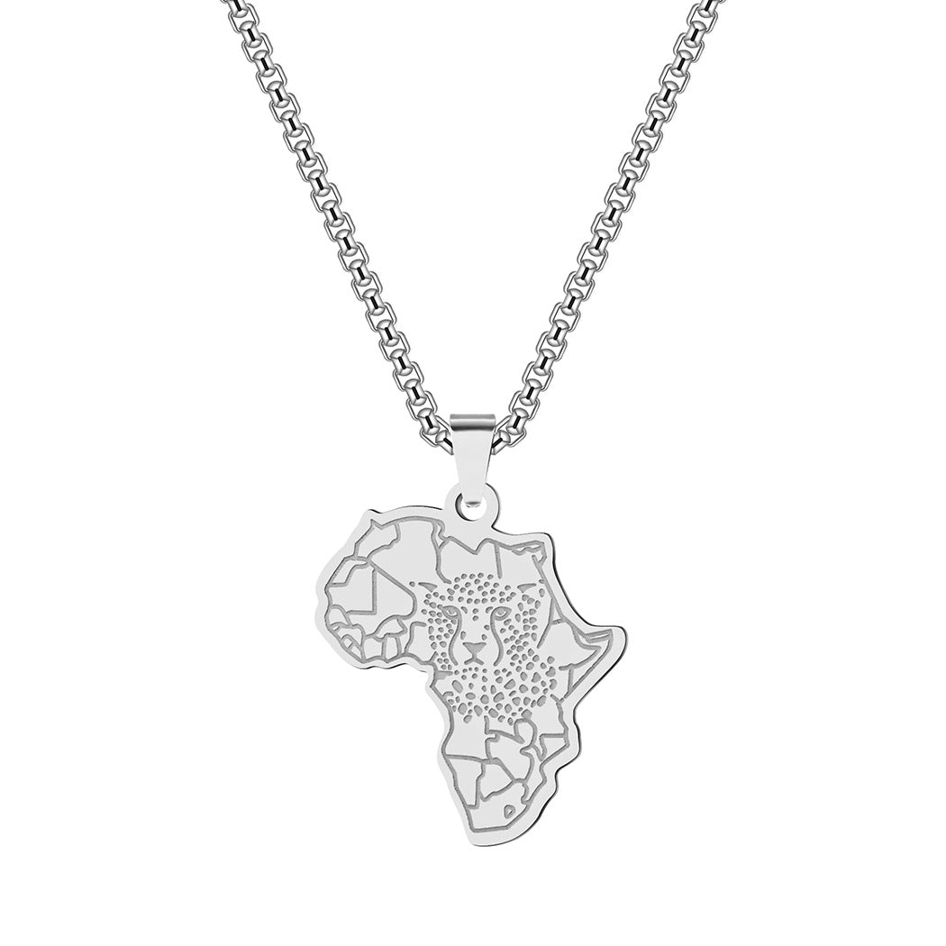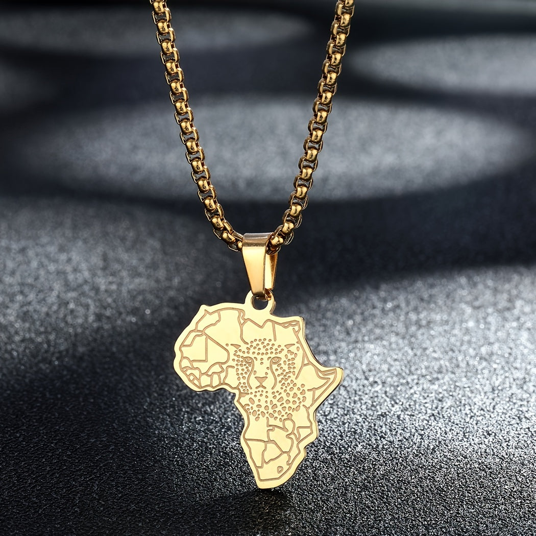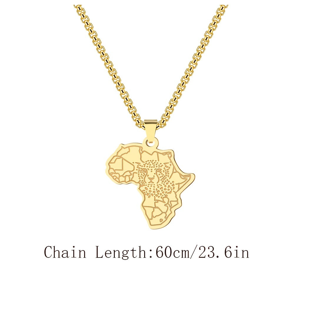 Punk style pendant necklace featuring an African map and tiger design. Made of durable stainless steel, this necklace is perfect for men looking to add a touch of unique charm to their attire.