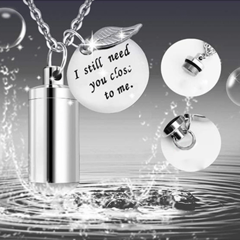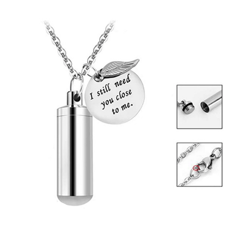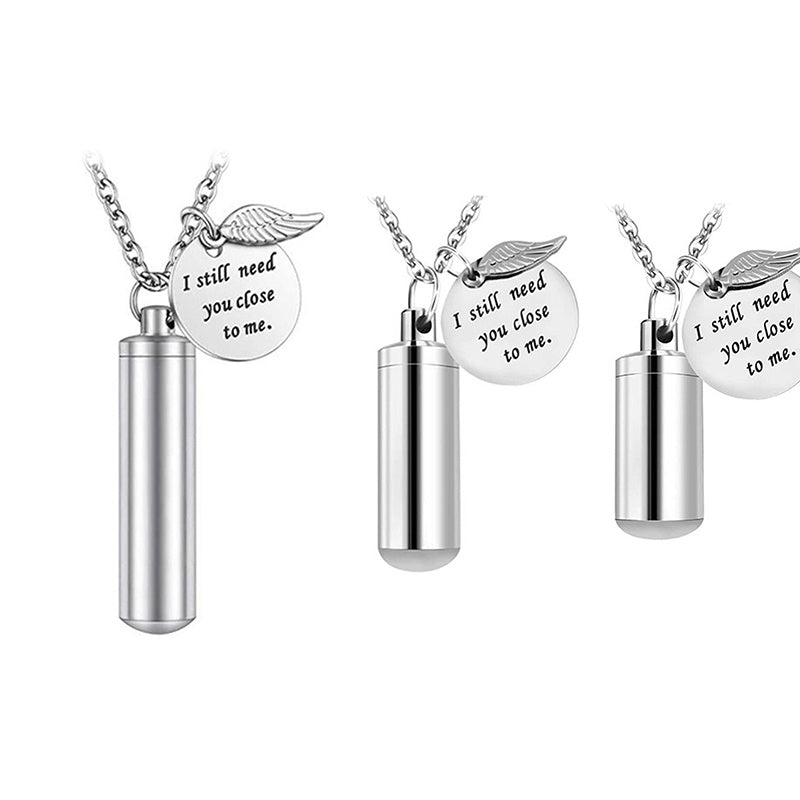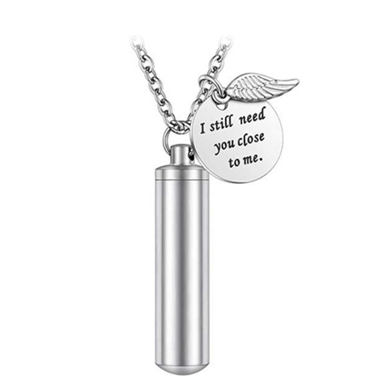 This stainless steel pendant necklace is a beautiful piece of cremation jewelry designed for men. It features an angel wings design and a cylinder ash holder.