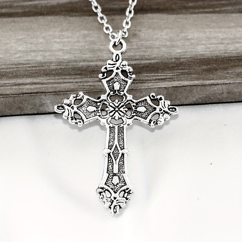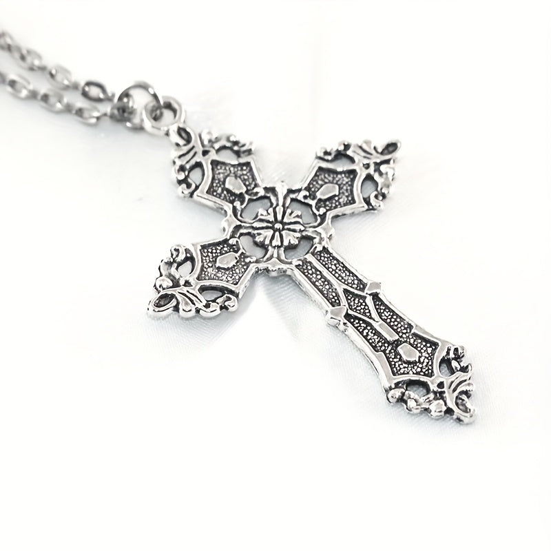 This silver plated pendant necklace features a unique Baroque cross design with a vintage Bohemian touch. It's perfect for those who love gothic jewelry.