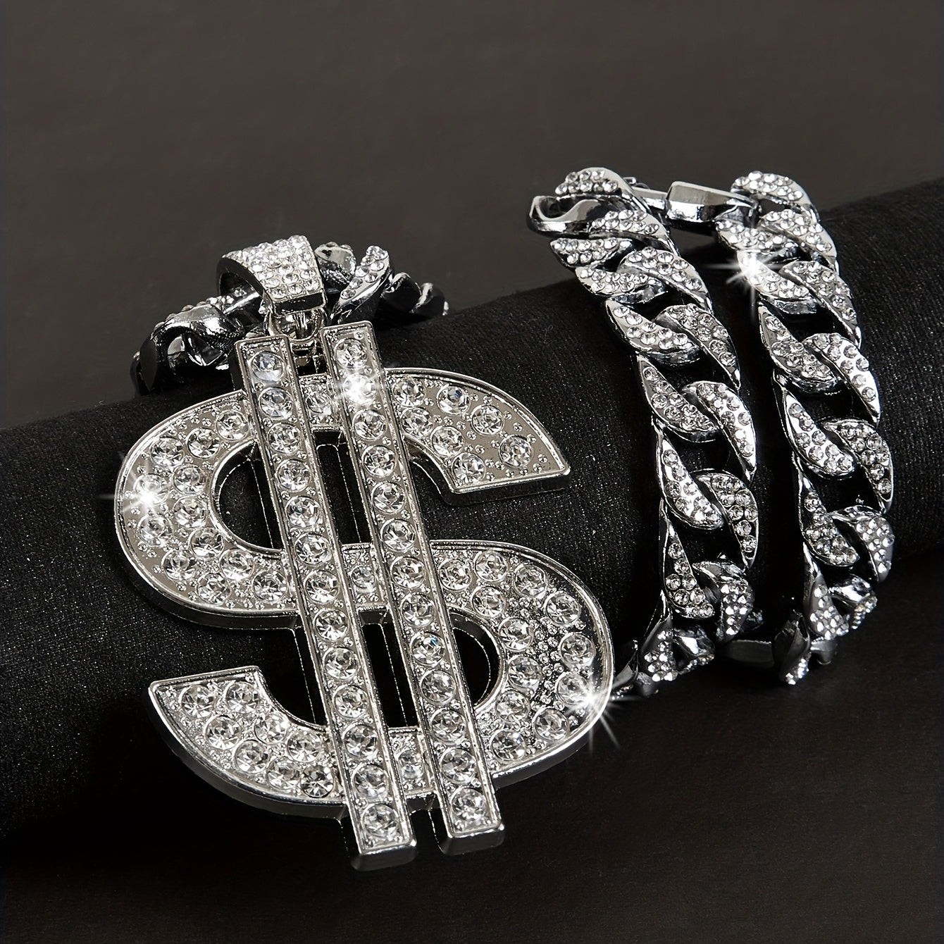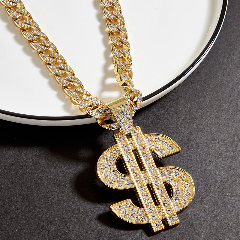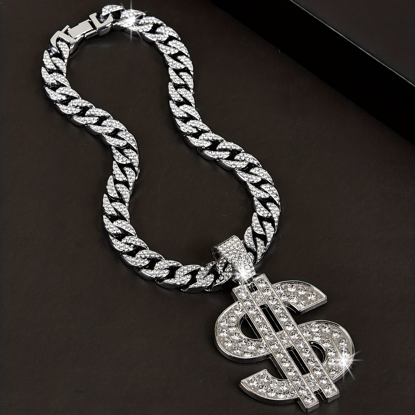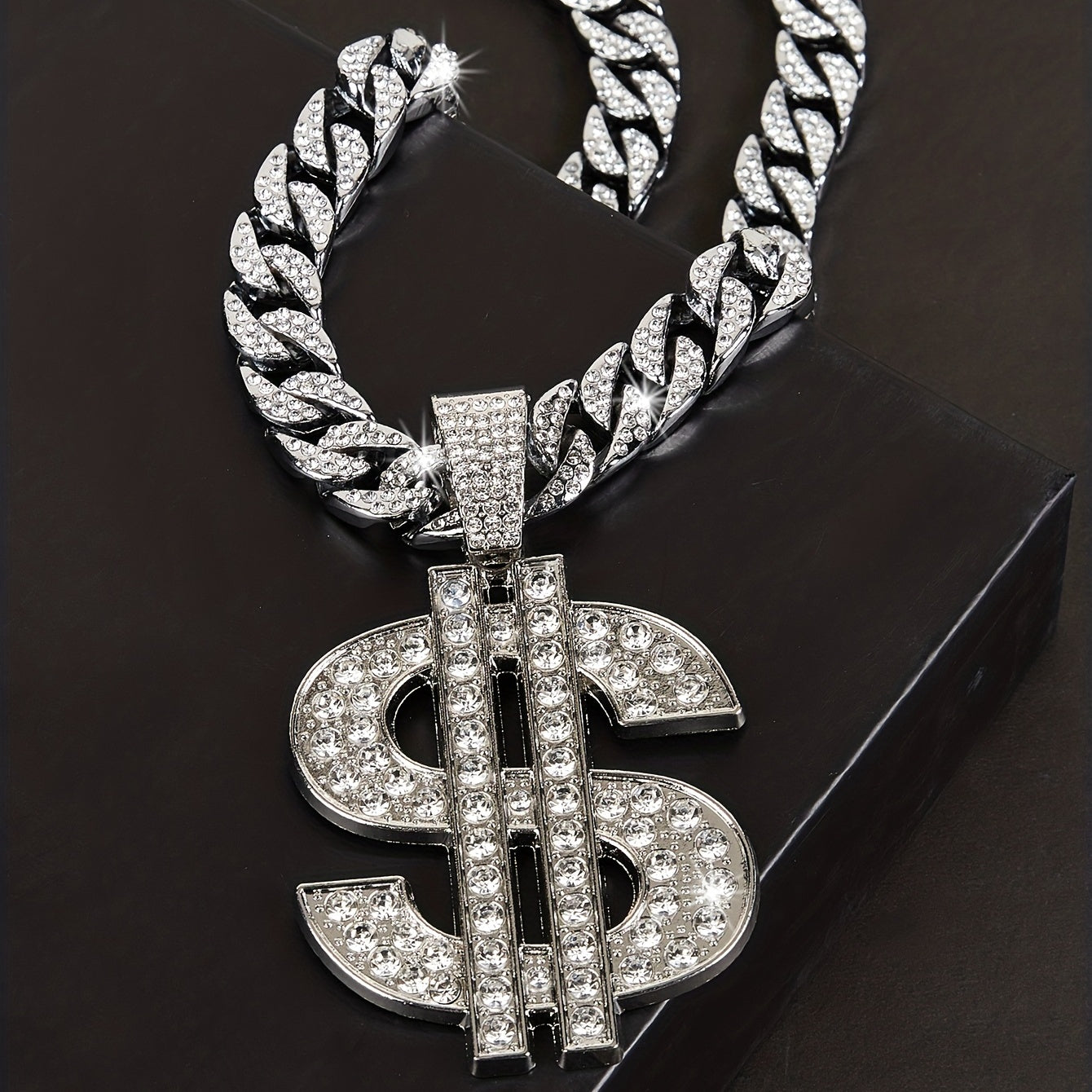 Make a statement with this blingy dollar pendant necklace featuring a chunky Cuban chain. Perfect for adding some swag to your hip hop look.