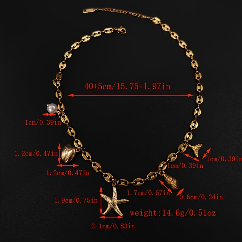 Elevate your beach look with this stainless steel necklace featuring starfish, pearl, and shell pendants. Ideal for beach vacations and surfing lovers. Makes a great Mother's Day gift.