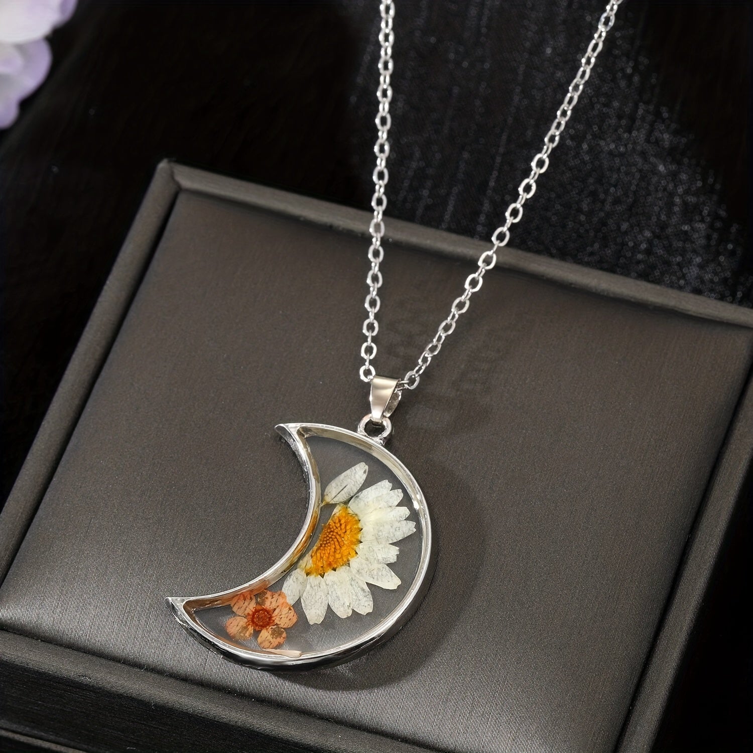 Elevate your summer look with this boho style jewelry set featuring silver plated resin and real dry flowers. Perfect for adding a touch of nature-inspired charm to your outfit.