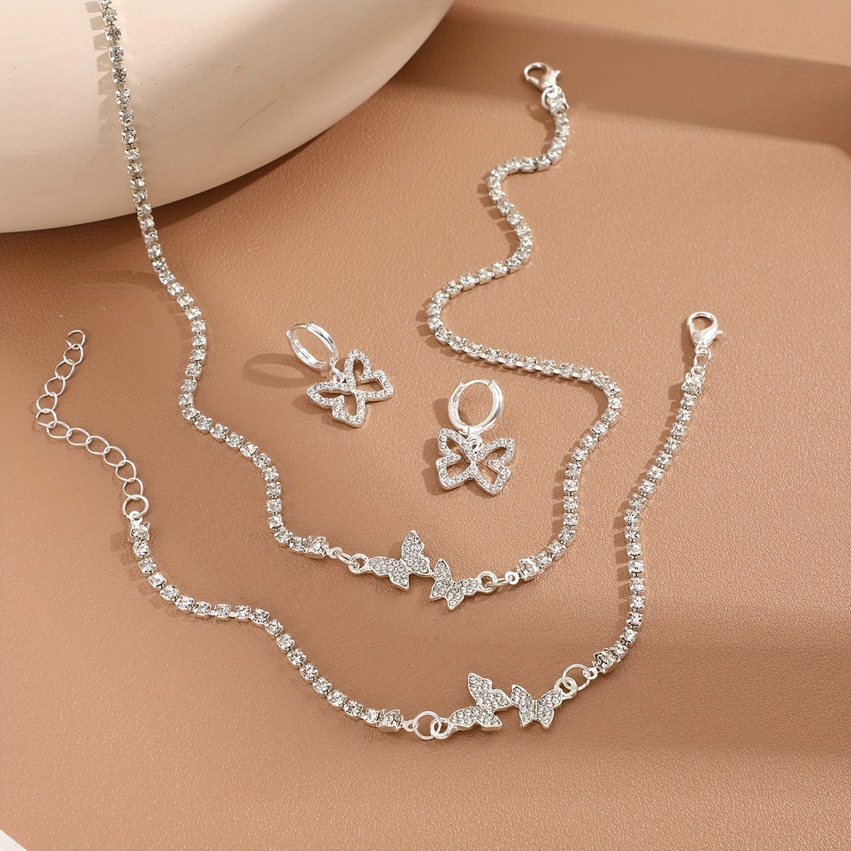 This jewelry set includes 4pcs earrings, bracelet, and necklace with inlaid rhinestone butterfly design, perfect for daily wear. It is a dainty and stylish birthday gift for anyone who loves bohemian fashion.