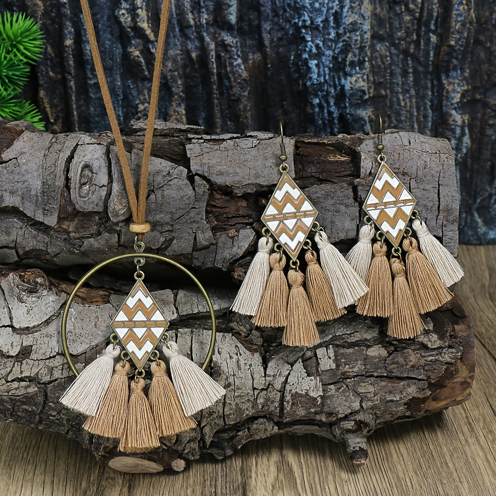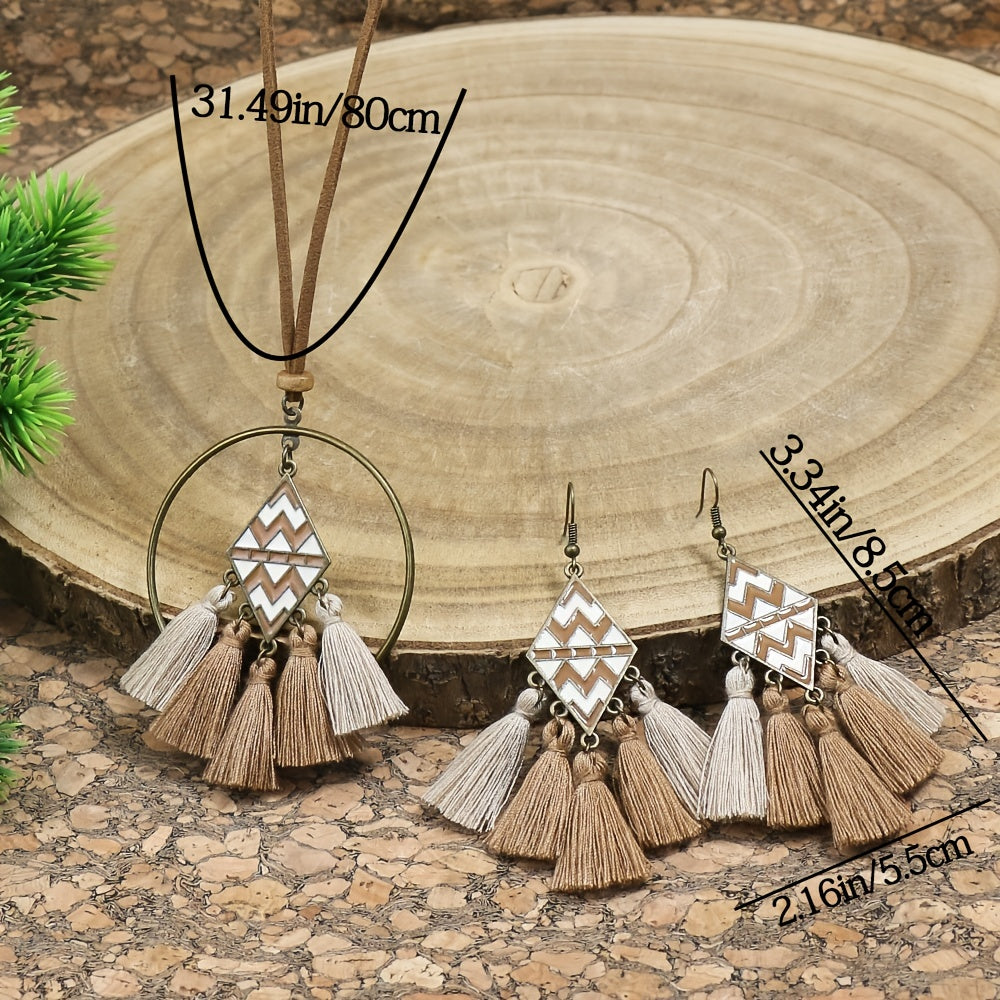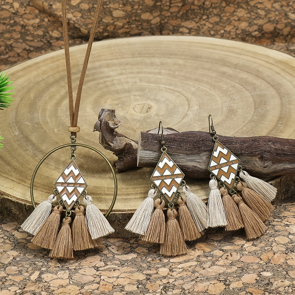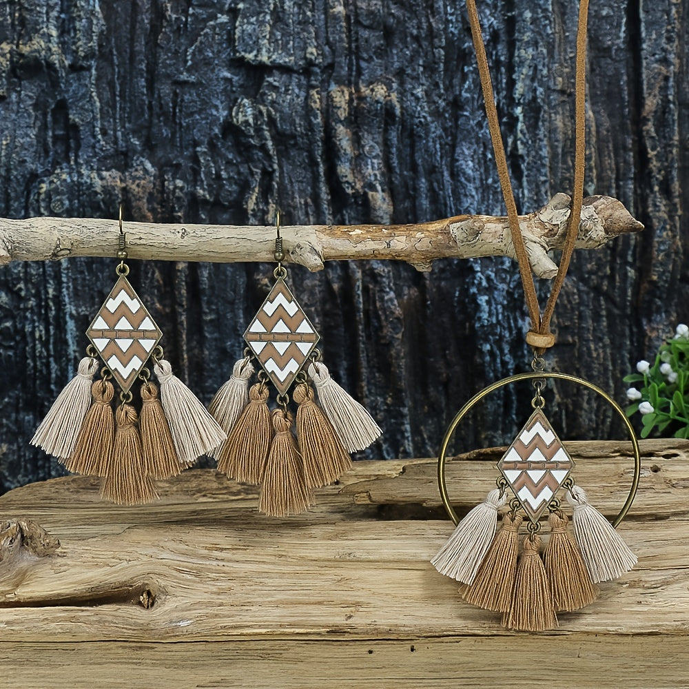 Enhance your bohemian look with this 3-piece jewelry set featuring earrings and necklace with ethnic design.