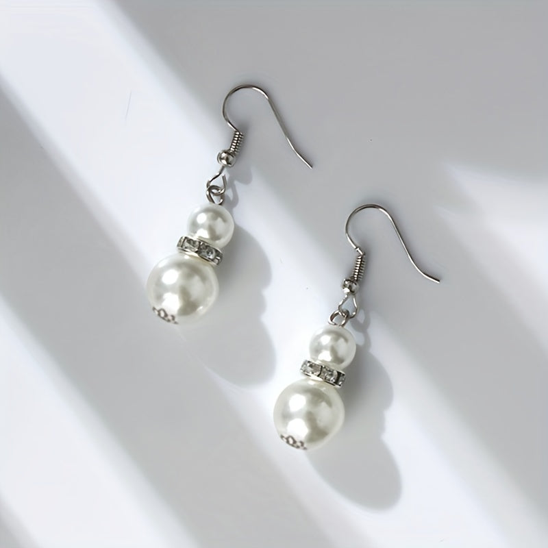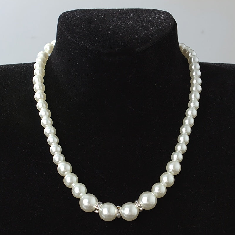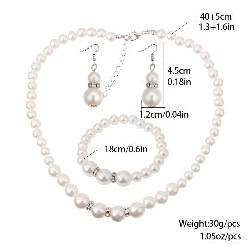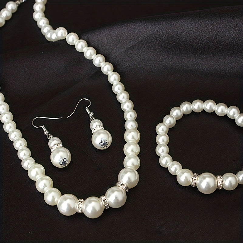 Enhance your style with this elegant set of necklace, bracelet, and earrings featuring rhinestones and faux pearls.