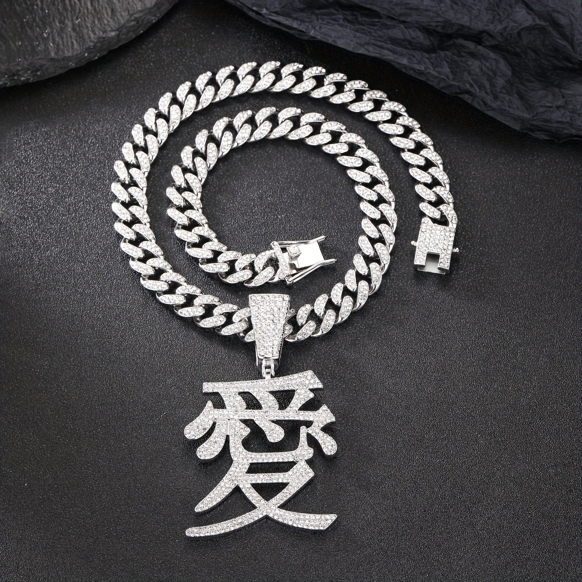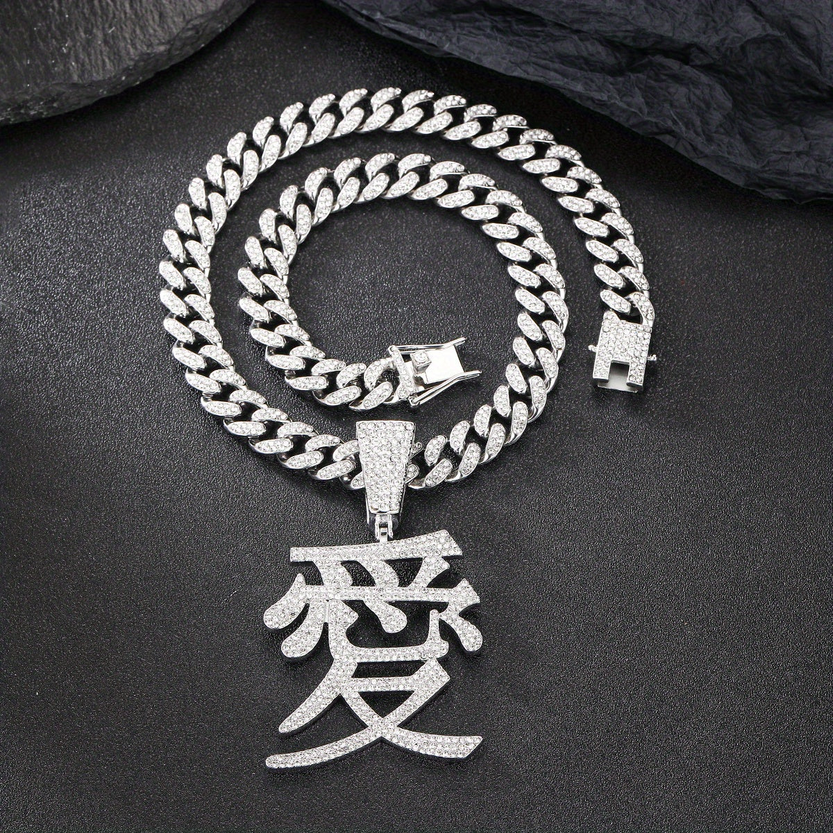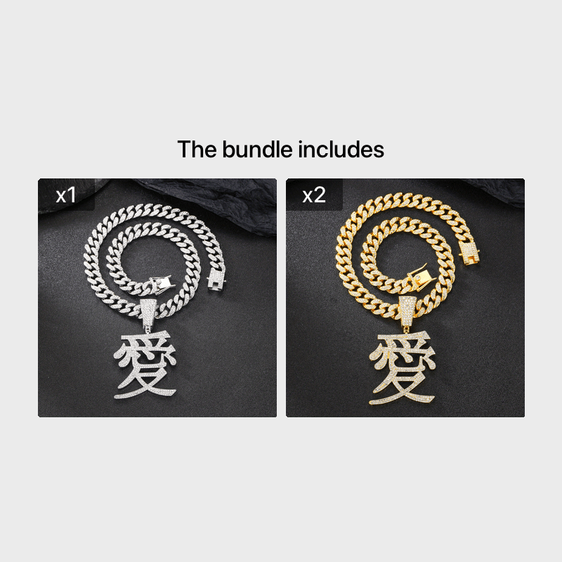 This hip hop jewelry features a stunning Chinese character love pendant with ice out details on a 13MM Cuban chain. Make a bold fashion statement with this unique piece.