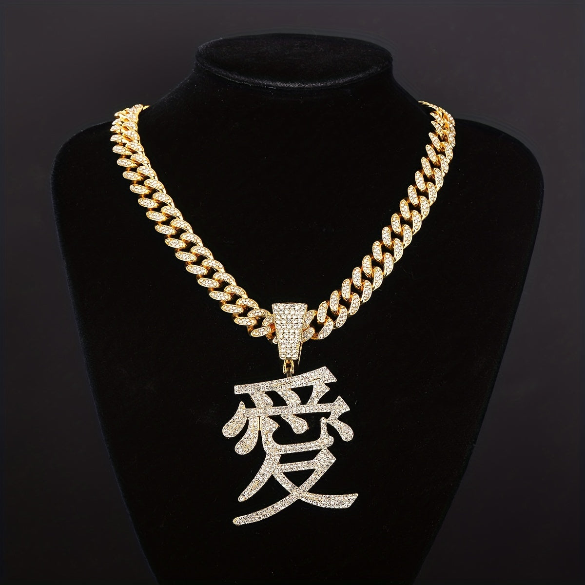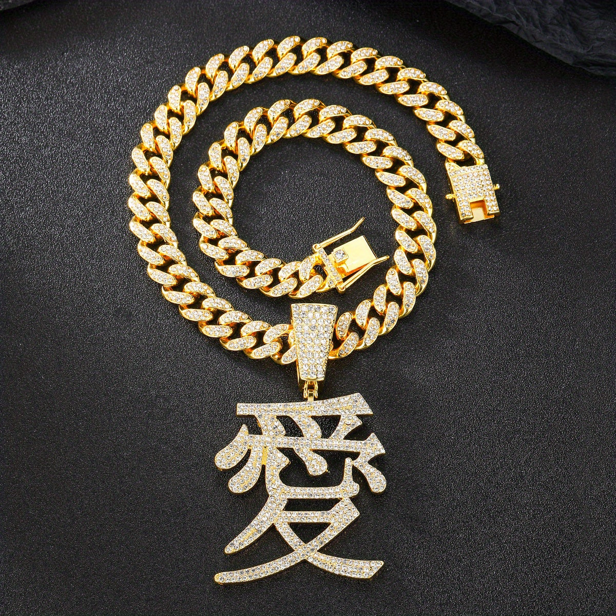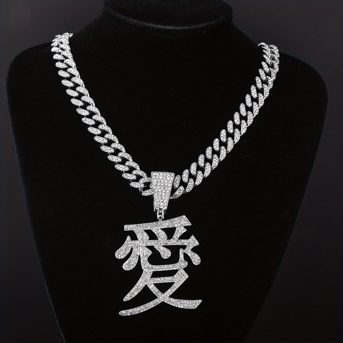 This hip hop jewelry features a stunning Chinese character love pendant with ice out details on a 13MM Cuban chain. Make a bold fashion statement with this unique piece.