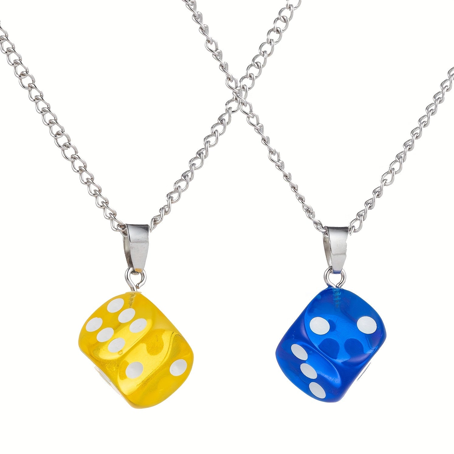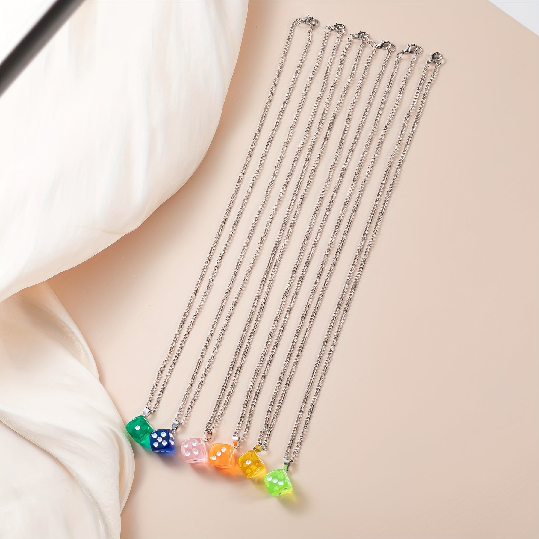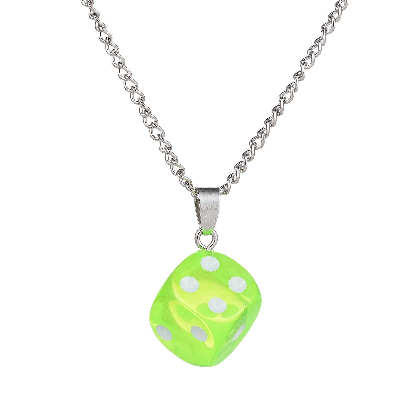 Add a pop of color to your outfit with this acrylic dice pendant necklace. The silver long chain adds a touch of elegance to the fun design.