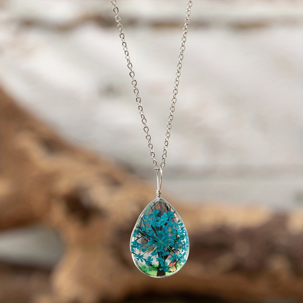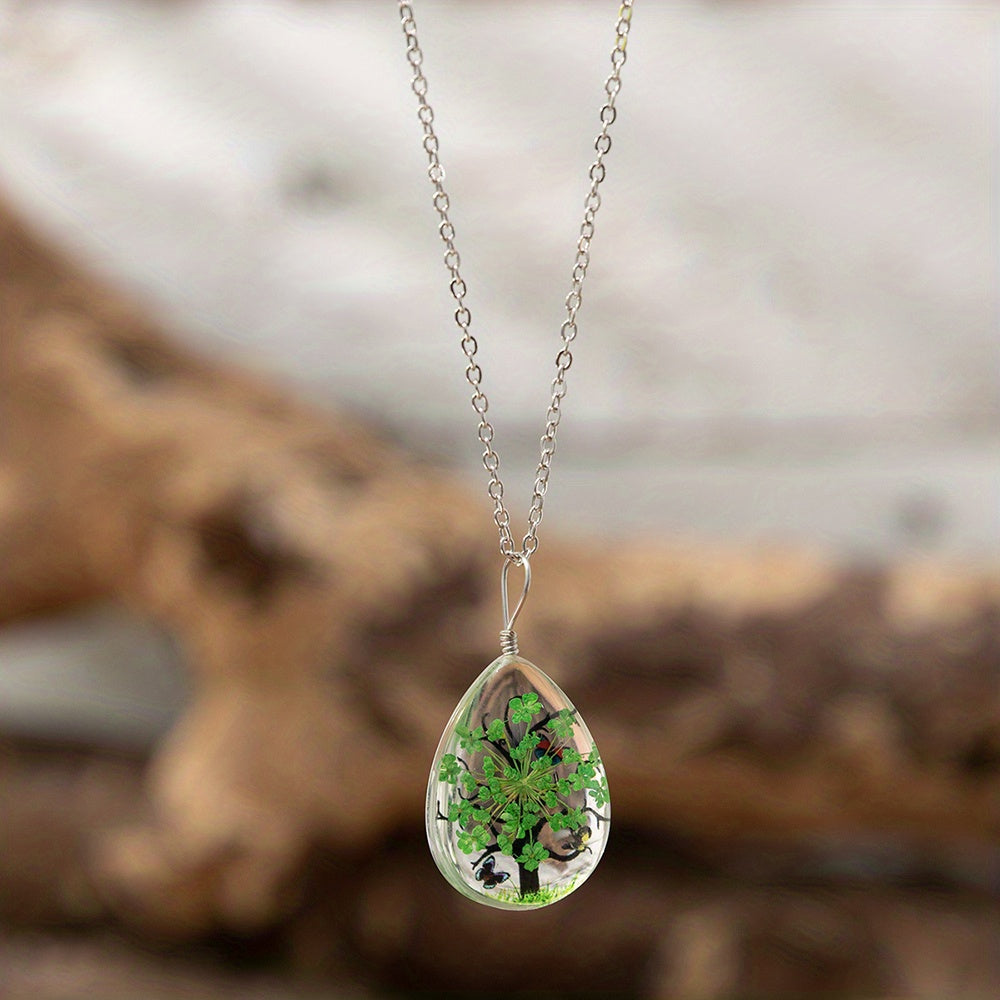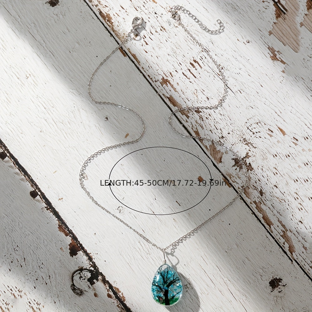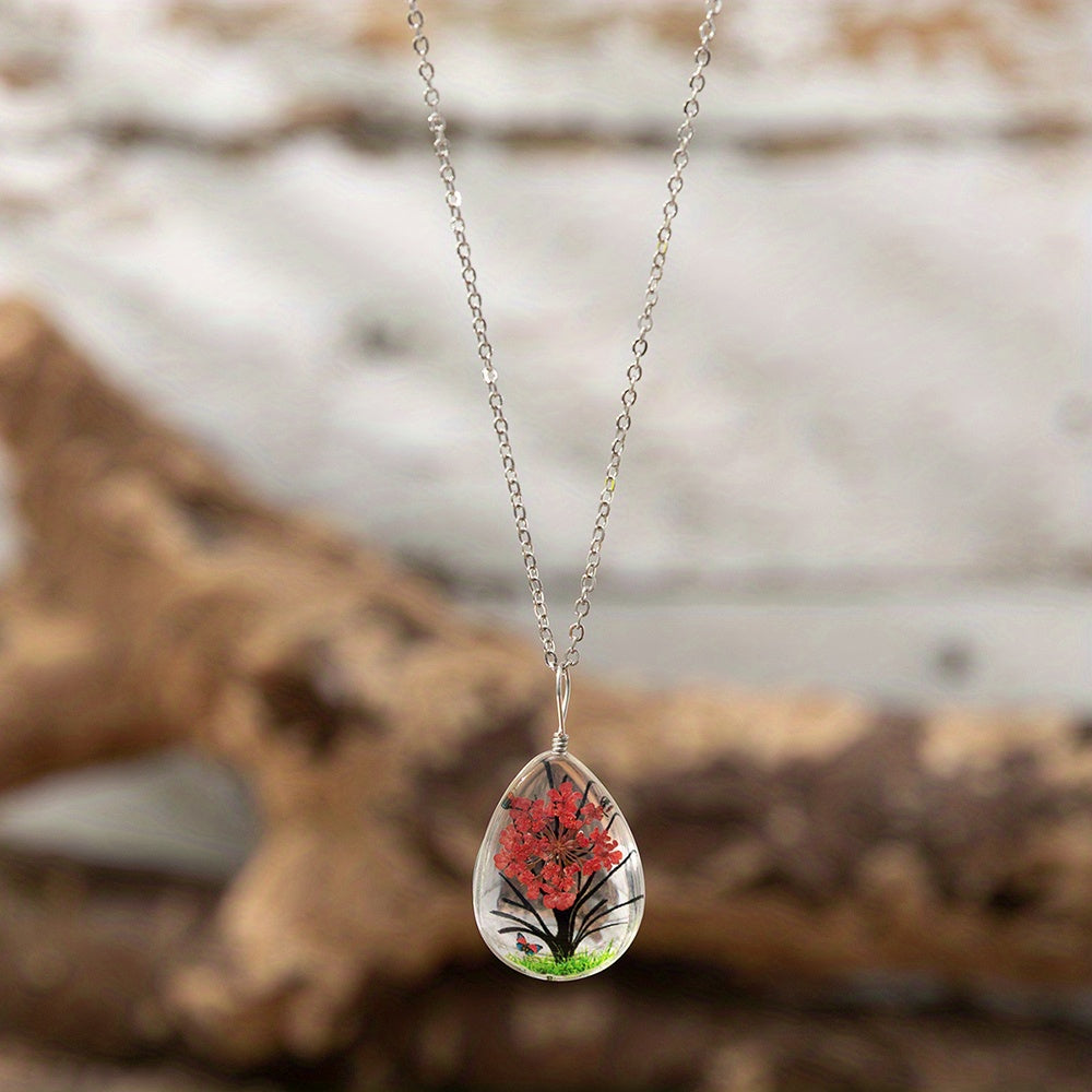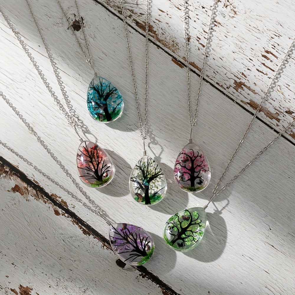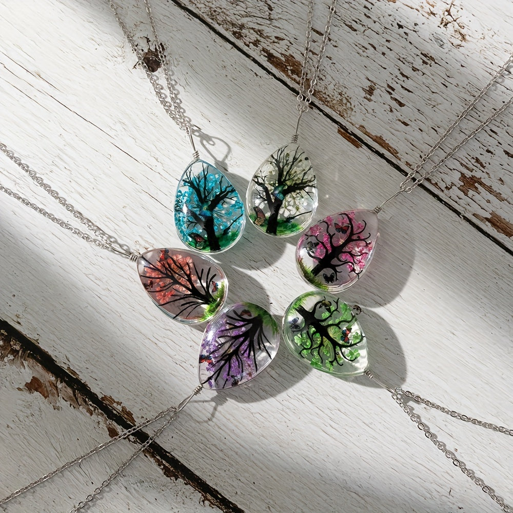 This pendant necklace features a colorful Tree Of Life design with a butterfly and flower. The pendant is double-sided glass crystal.
