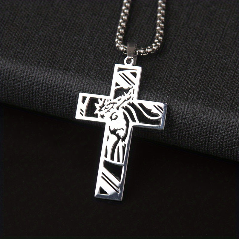 This stainless steel necklace features a cross pendant with a crown of thorns design, perfect for men and women.