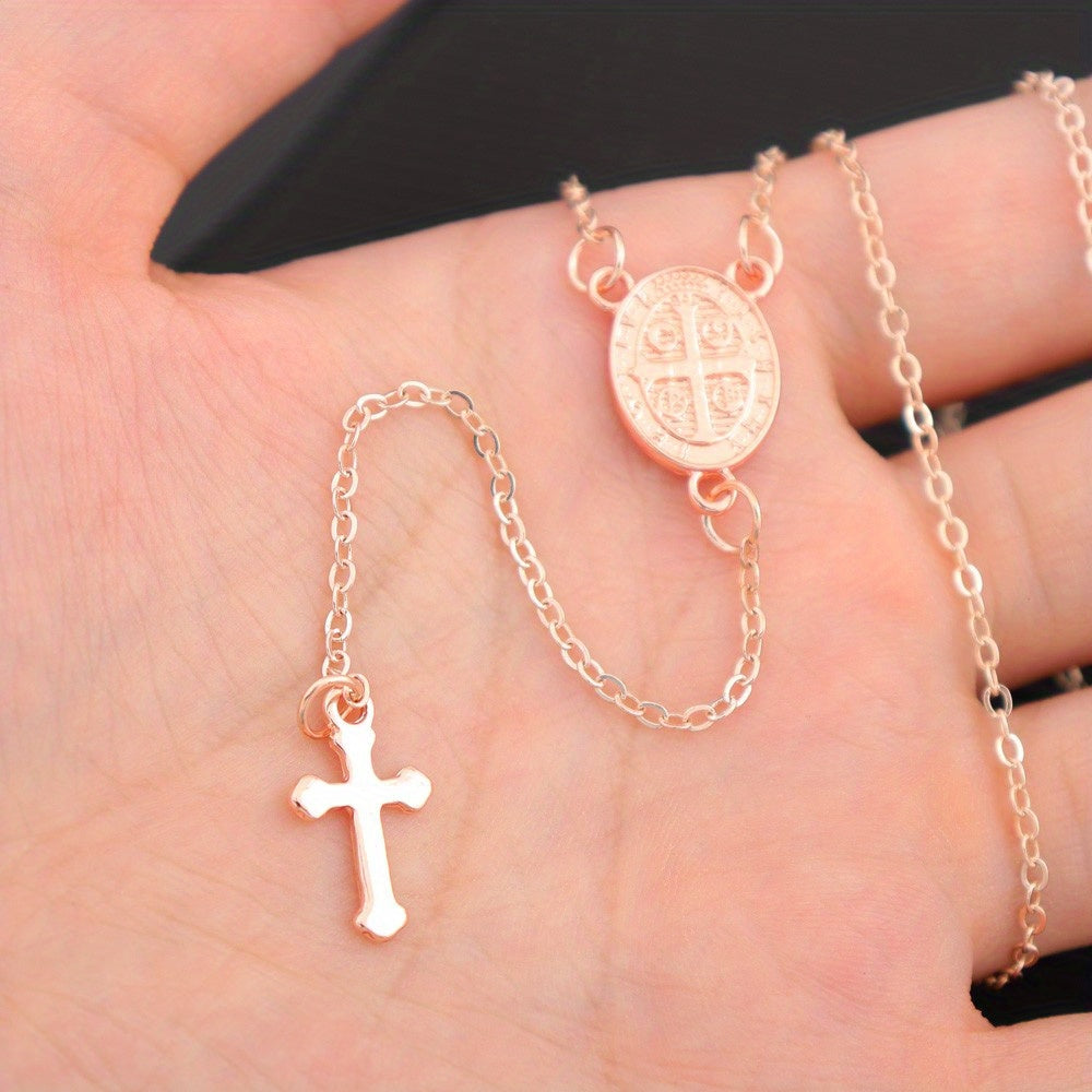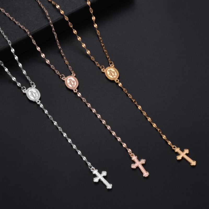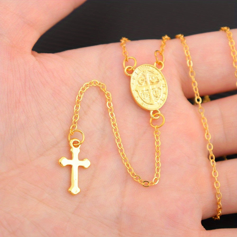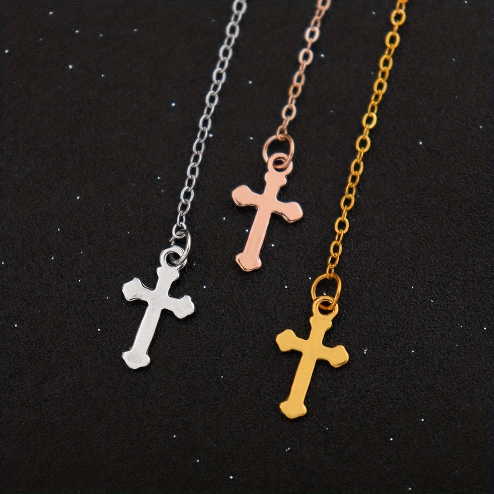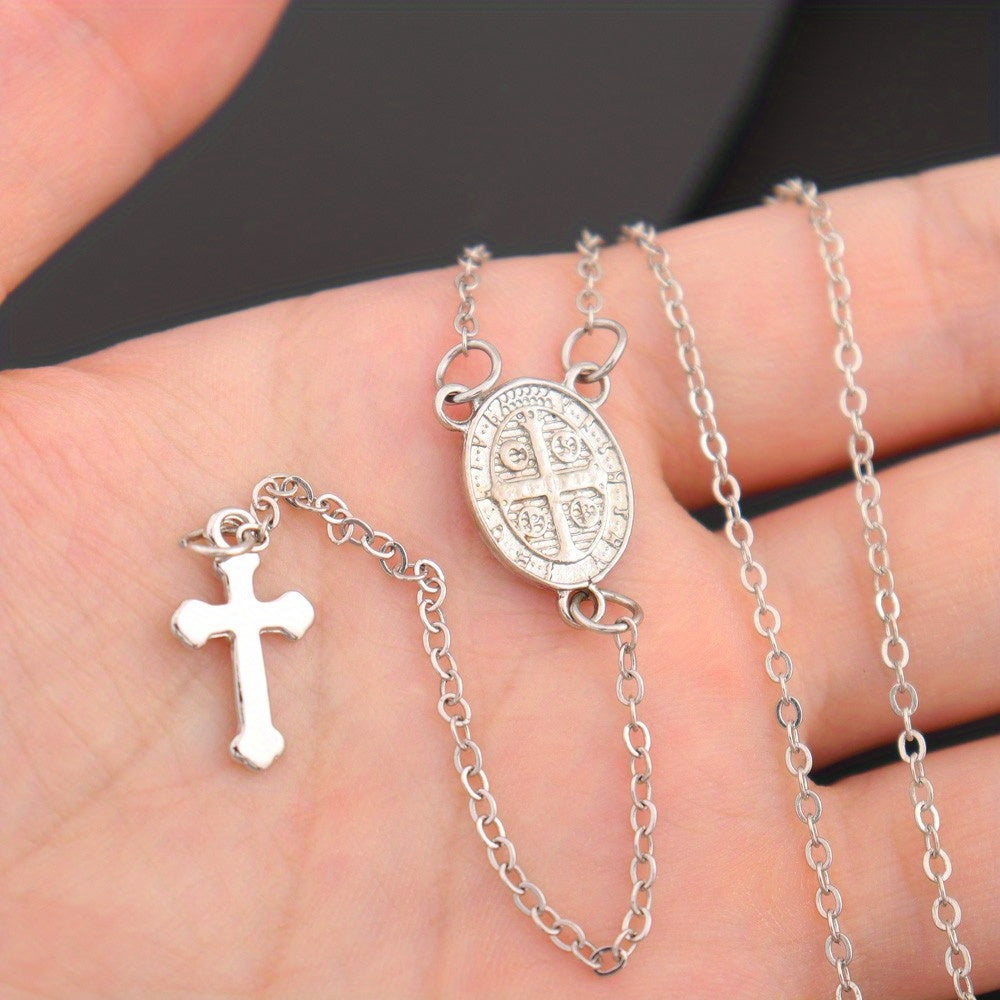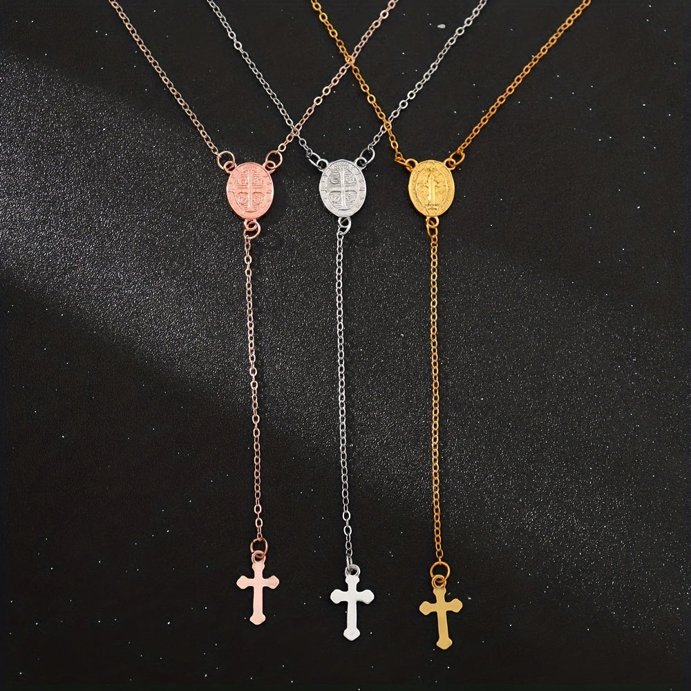 This stunning pendant necklace features a cross charm with a delicate tassel hanging from a silver-toned chain. Perfect for adding a touch of elegance to any outfit, this religious jewelry piece is a versatile accessory for everyday wear.
