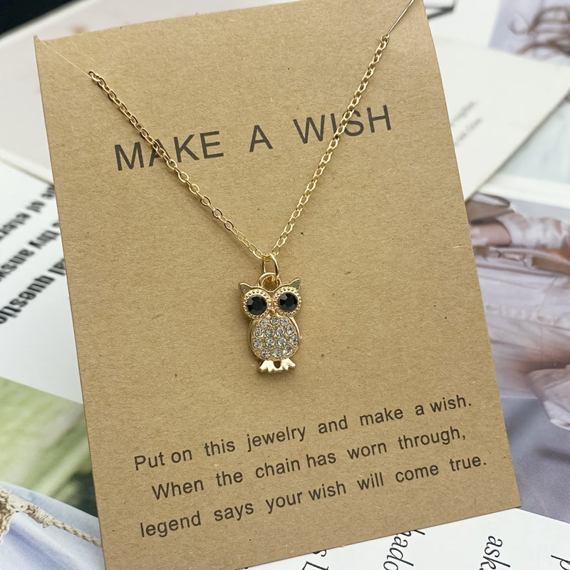 This pendant necklace features a variety of stylish charms including a cross, tree, tower, owl, and circle ring. It is designed to be worn as a clavicle chain and comes with a paper card.