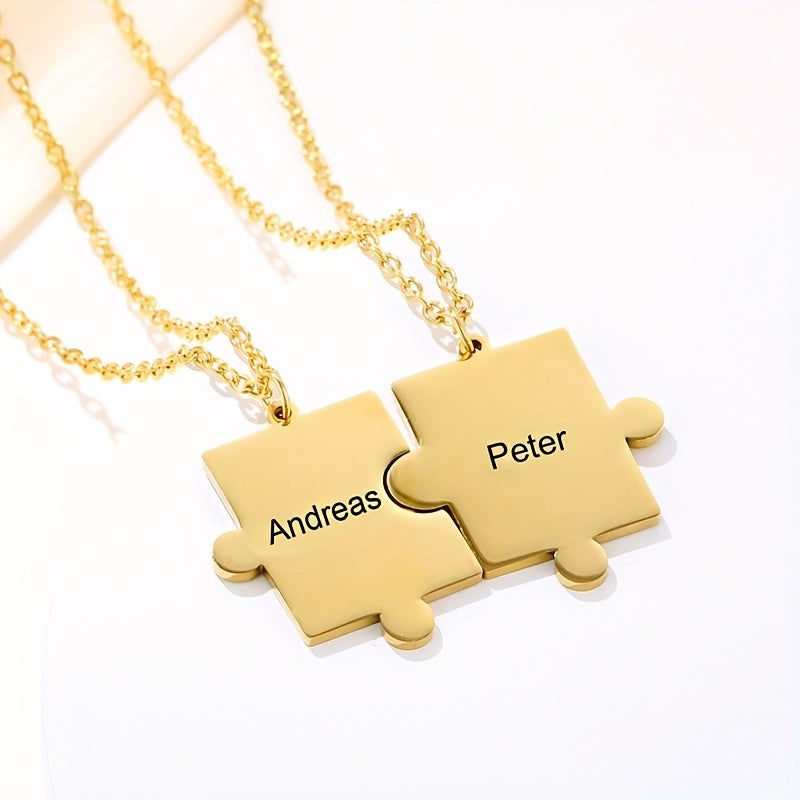 This set includes 2 geometric puzzle necklaces perfect for couples. Personalize with engraved names and dates. Made of high-quality stainless steel, ideal for men and women who love hip hop style.