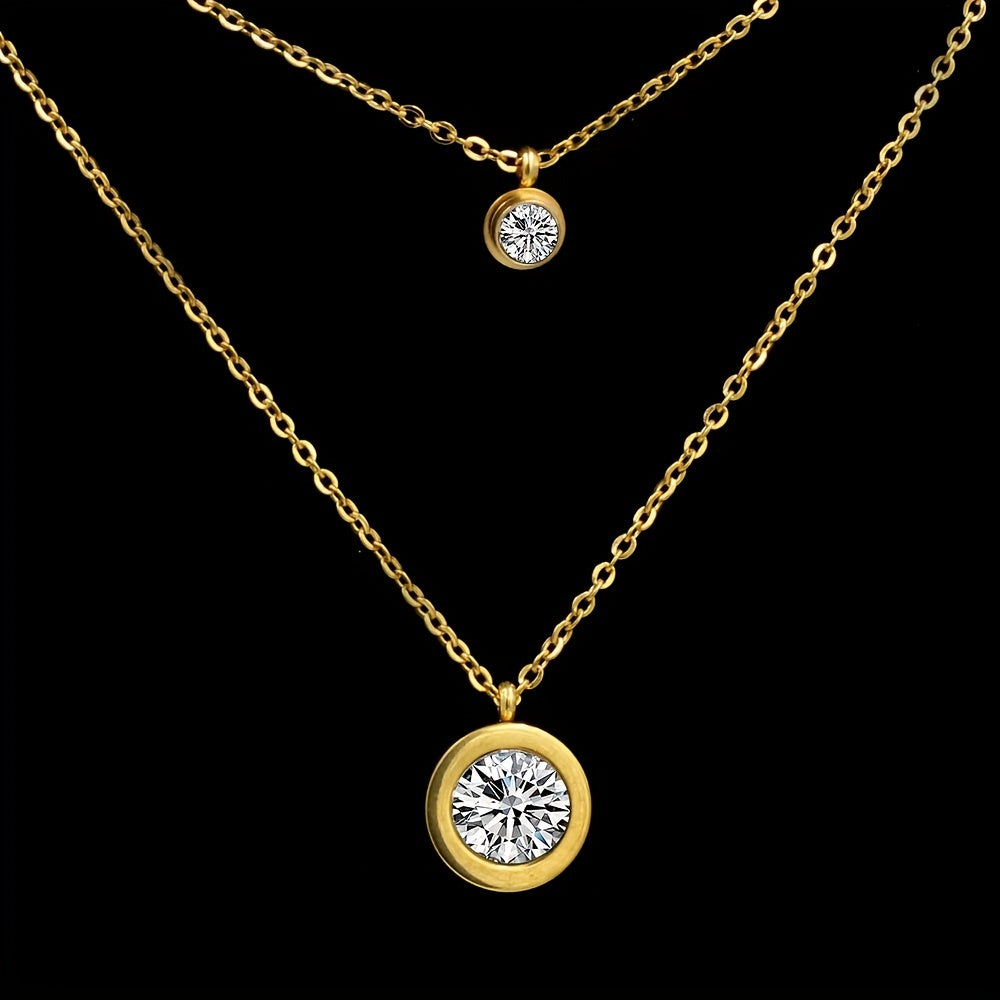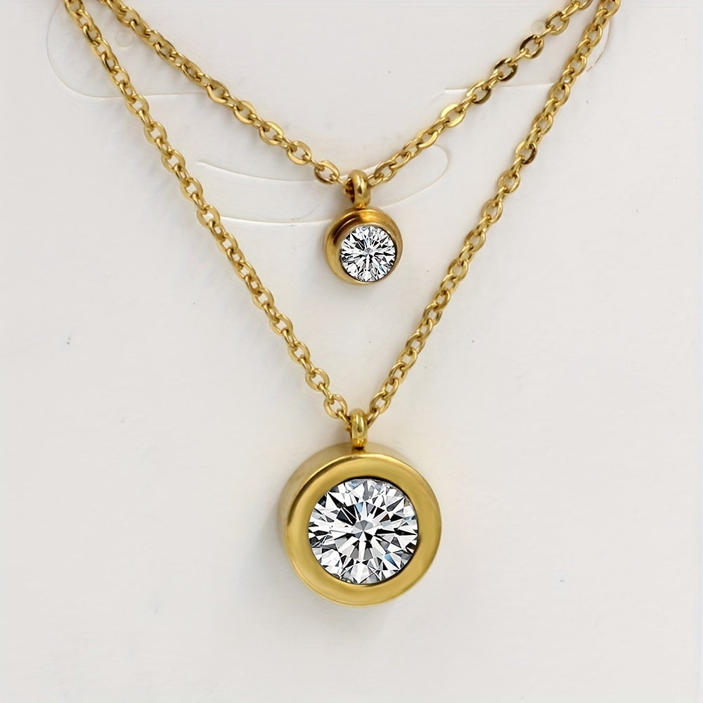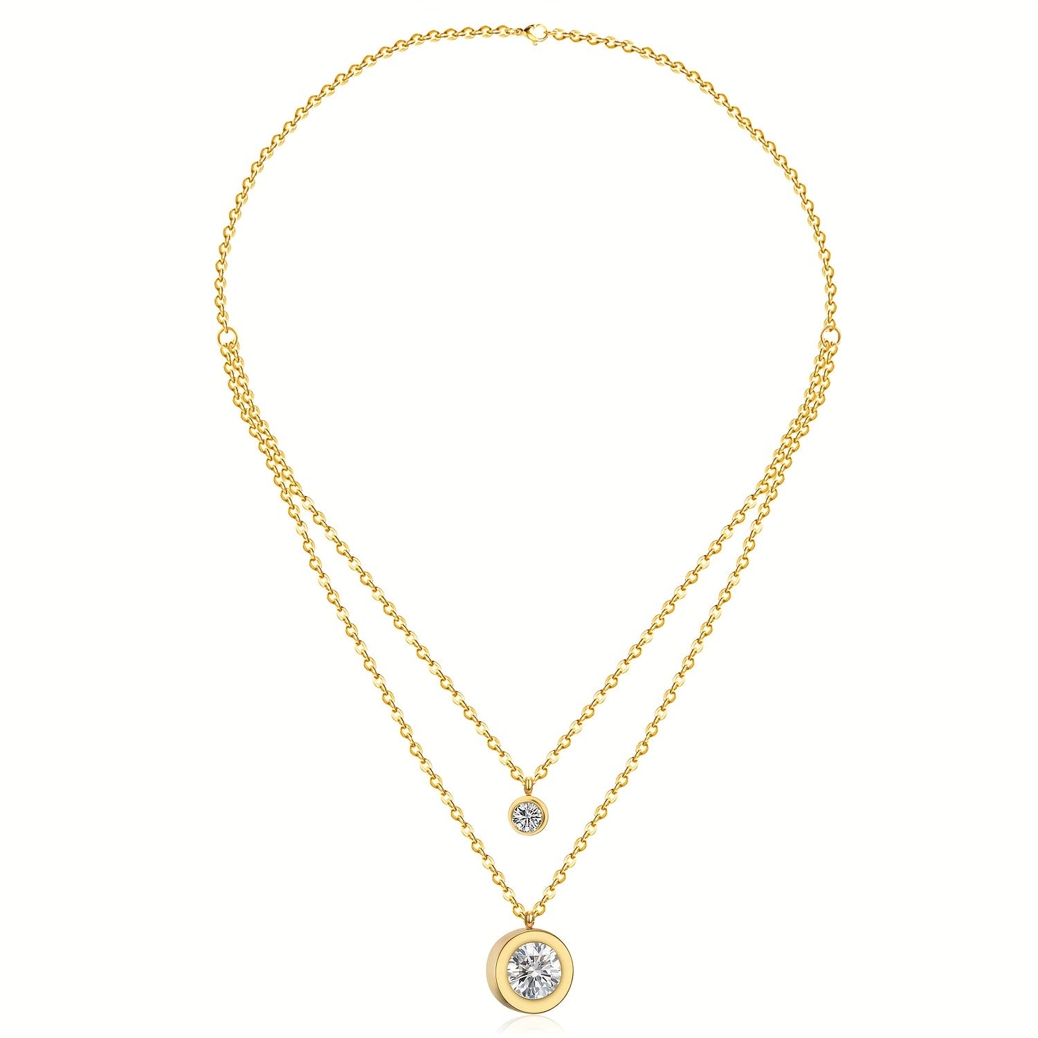 Double Round CZ Pendant Necklace Stainless Steel Chain