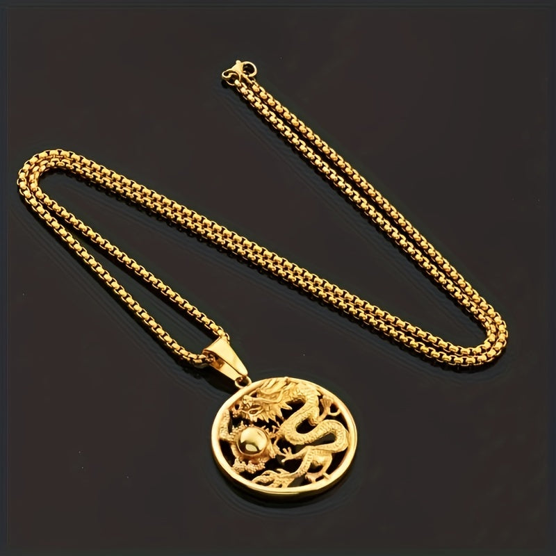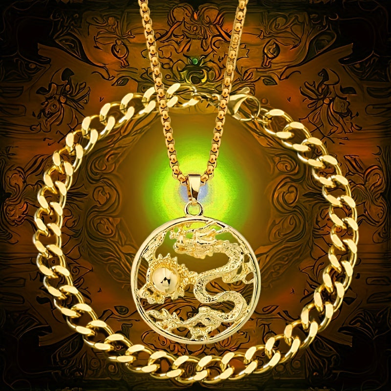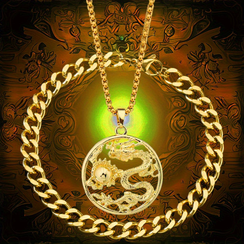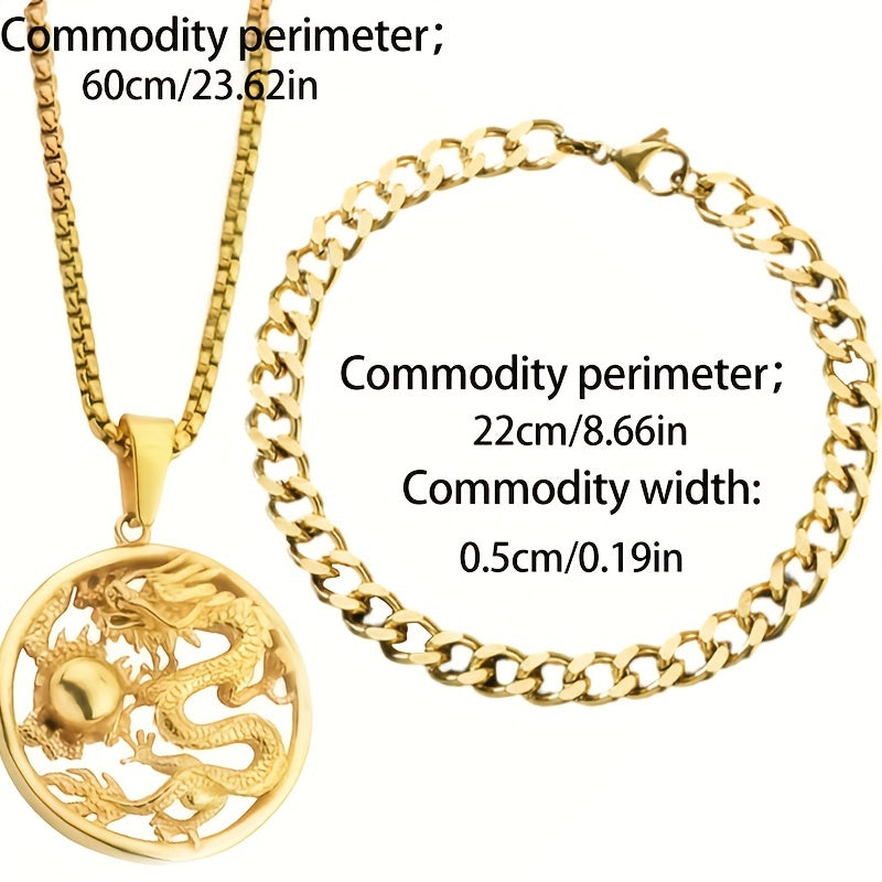 This 2-piece set includes a golden dragon pendant necklace and a matching cuban bracelet. Bring good luck and style to any outfit with this jewelry set.