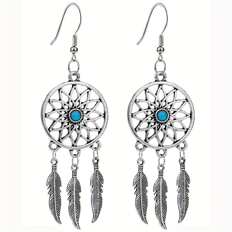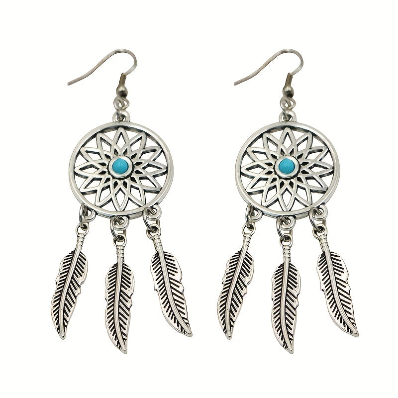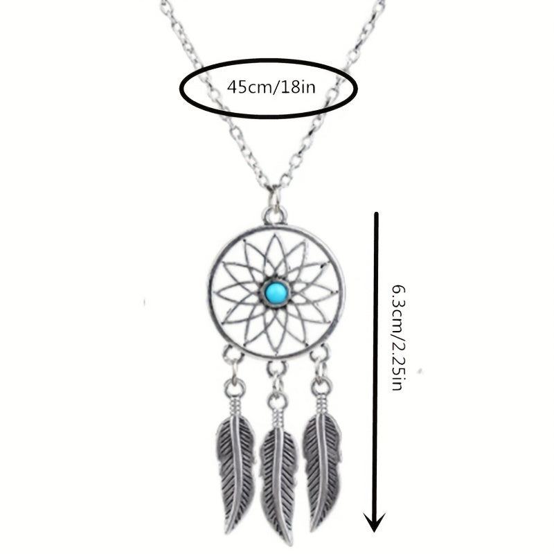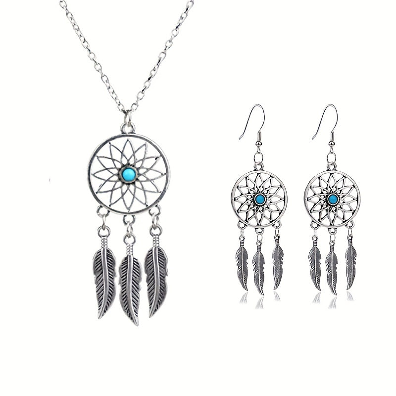 This retro silvery dream catcher jewelry set includes a pendant necklace, earrings, and key ring, featuring turquoise and tassel accents. Perfect for birthdays and Christmas gifts.