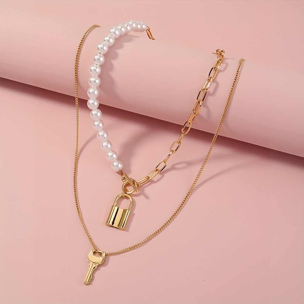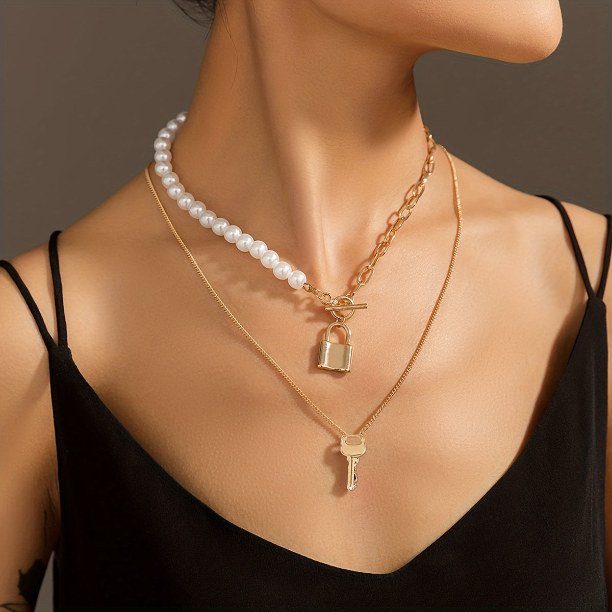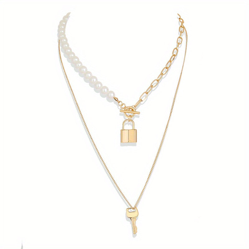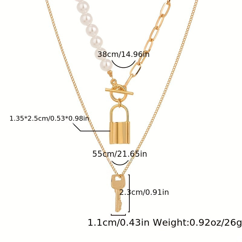Elevate your look with this stunning multilayer necklace featuring faux pearls and Cuban chain design.