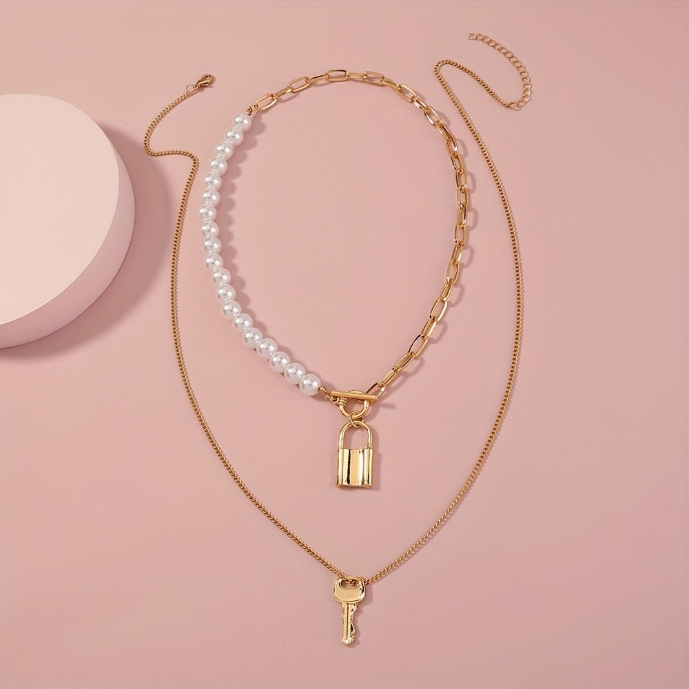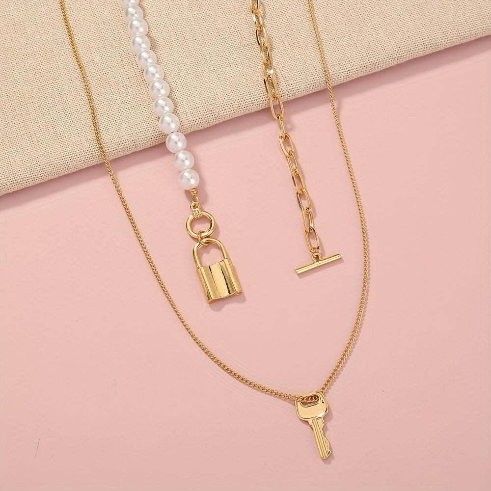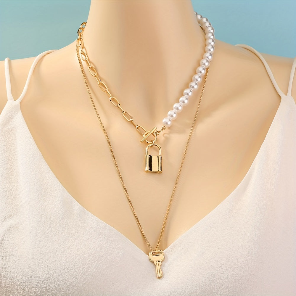 Elevate your look with this stunning multilayer necklace featuring faux pearls and Cuban chain design.