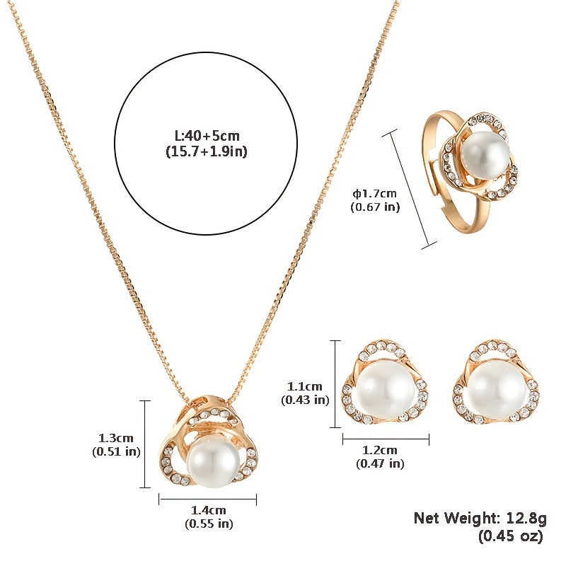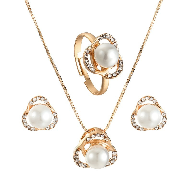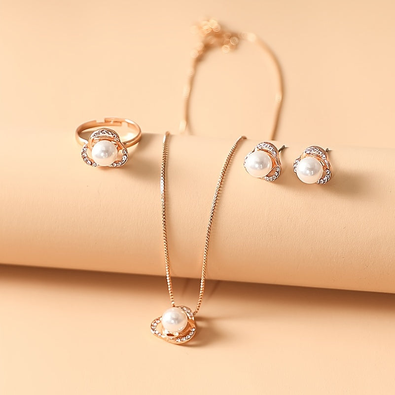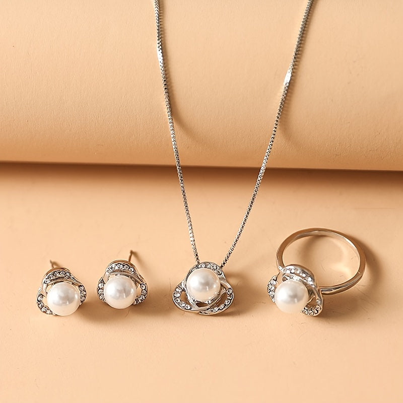 This stunning jewelry set features inlaid faux pearls on a pendant necklace, stud earrings, and an open ring. Perfect for bridesmaids and brides to add a touch of elegance and sophistication to any outfit.