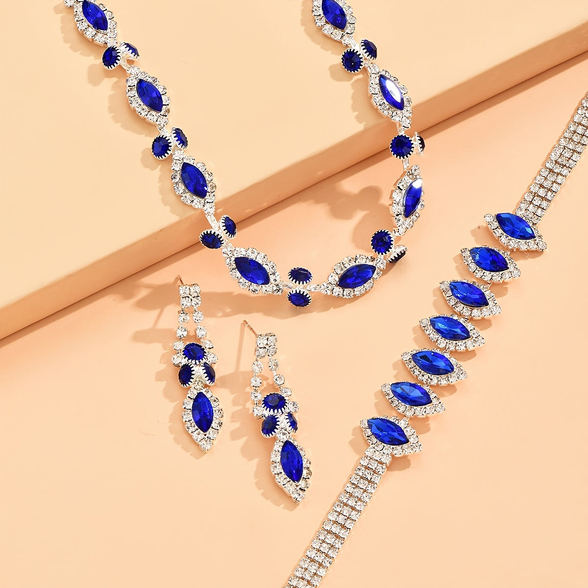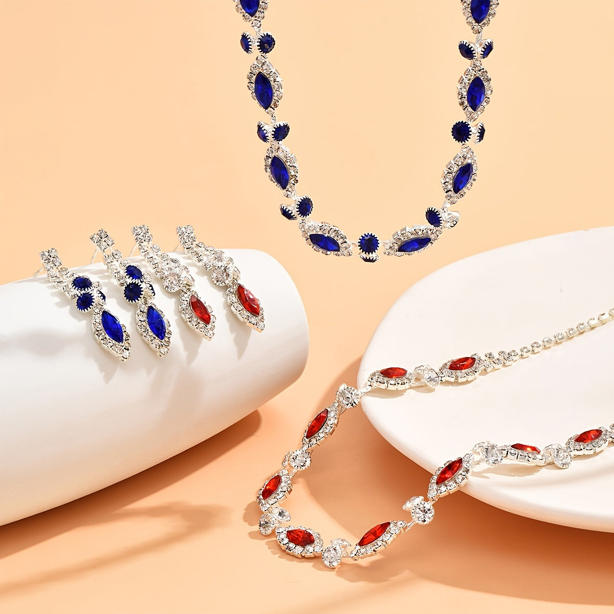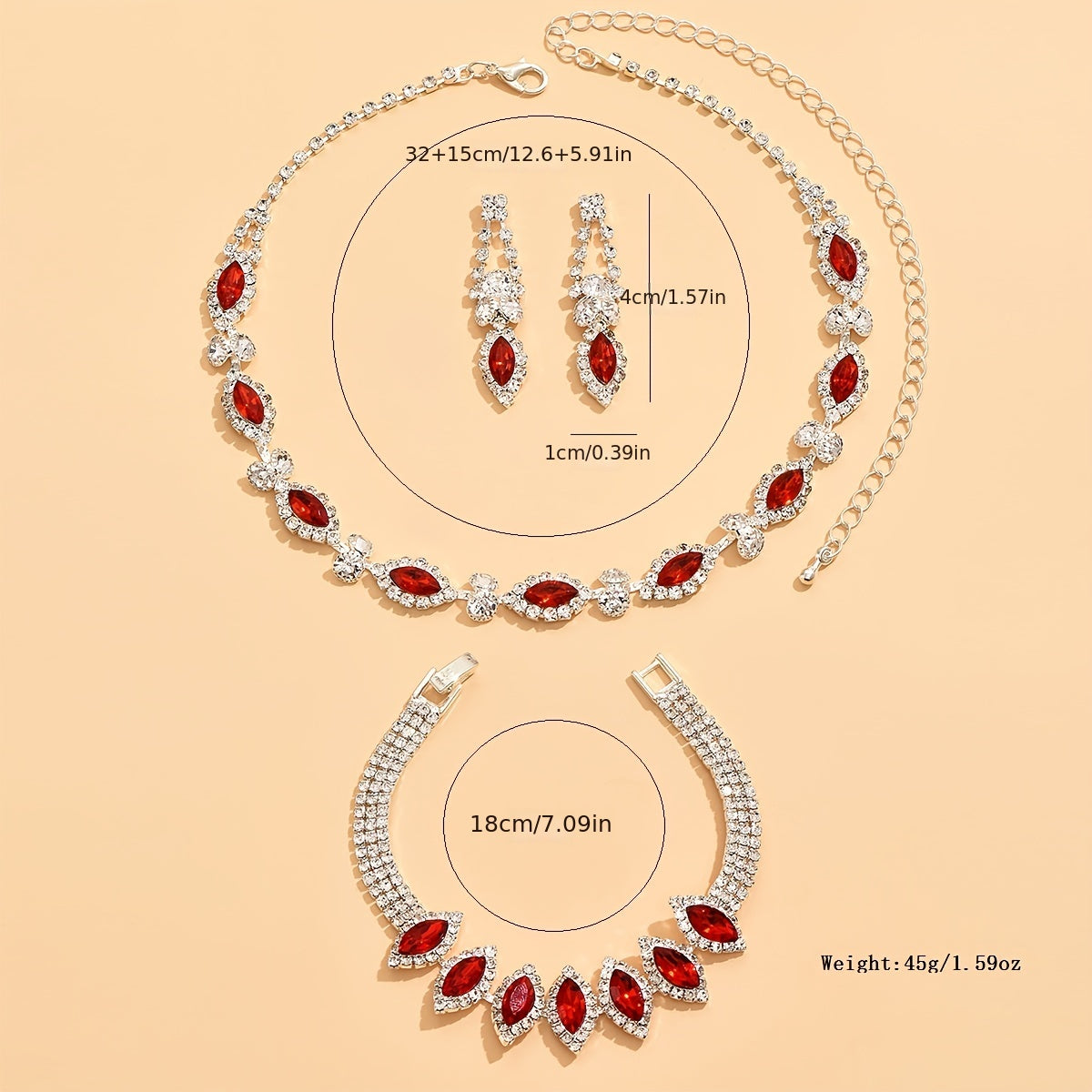Complete your bridal look with this stunning jewelry set featuring faux ruby and zircon stones. Set includes choker necklace, dangle earrings, and chain bracelet.