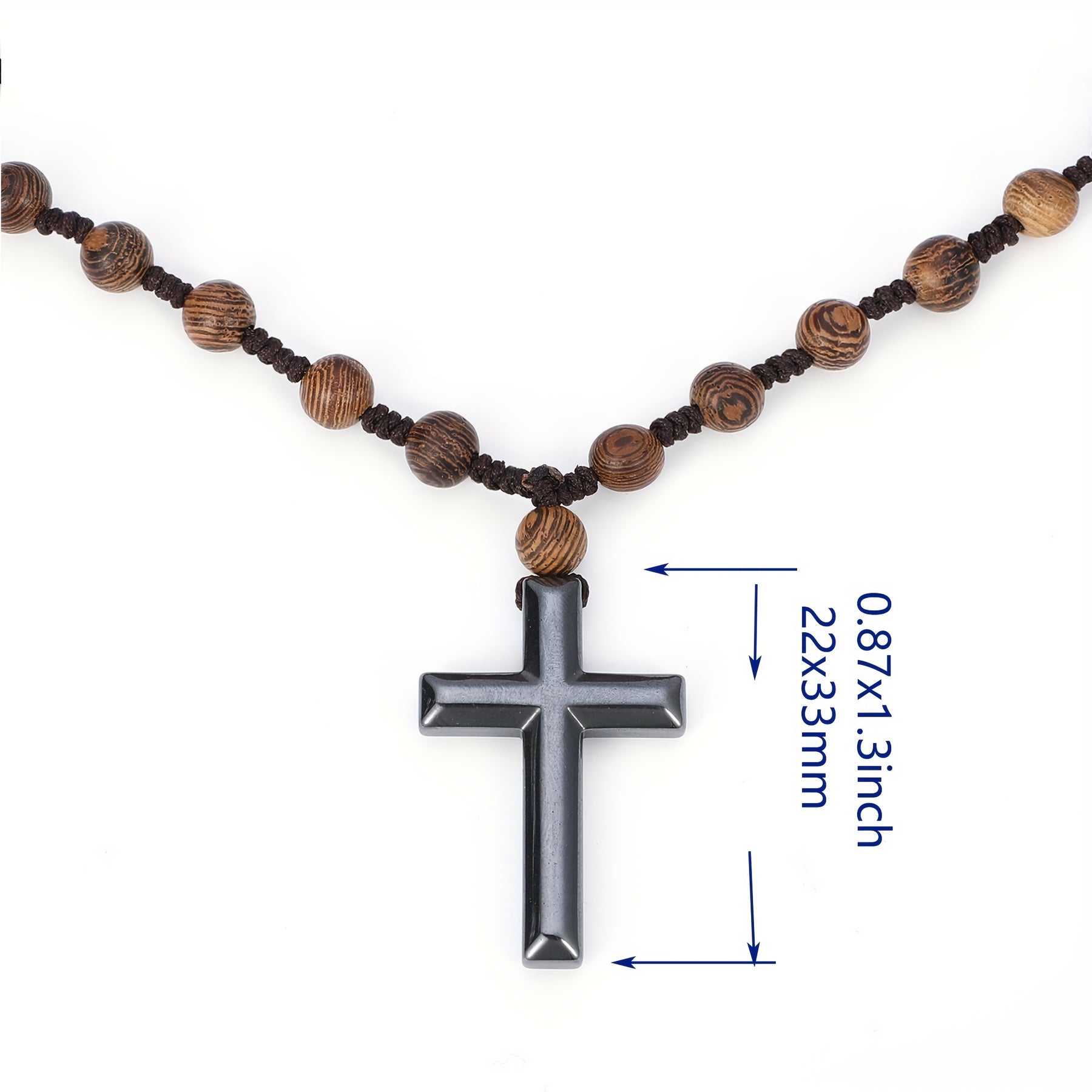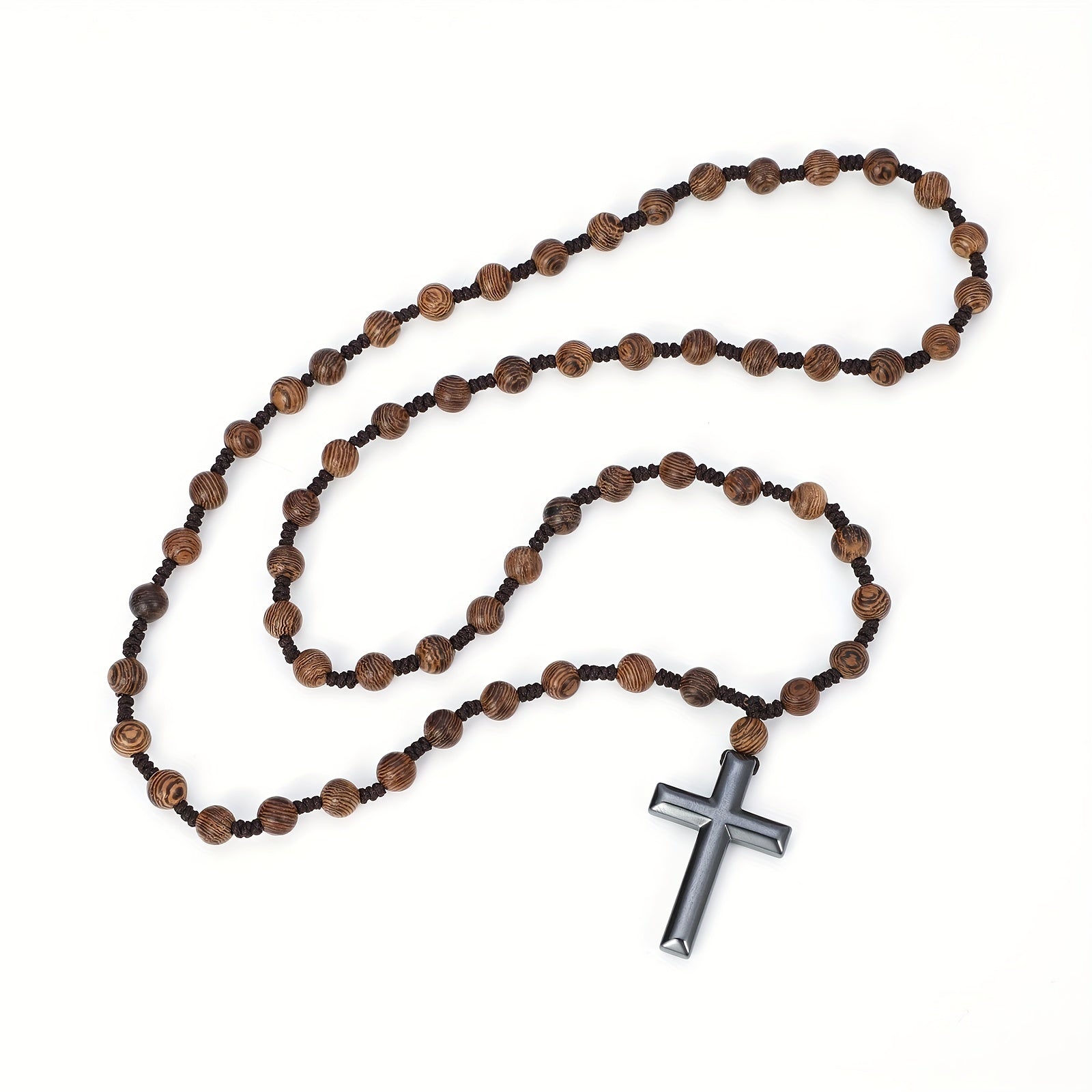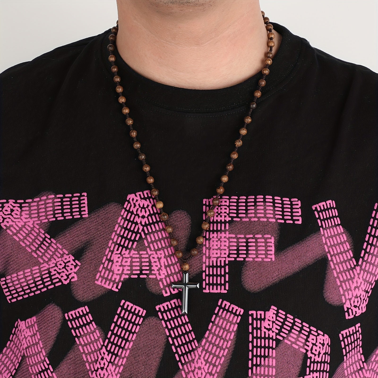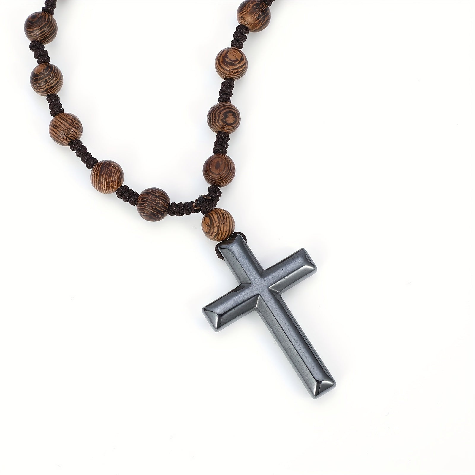 This unique pendant necklace features a gallstone cross design on a wooden beaded chain. A casual and stylish jewelry accessory perfect for everyday wear or as a gift.