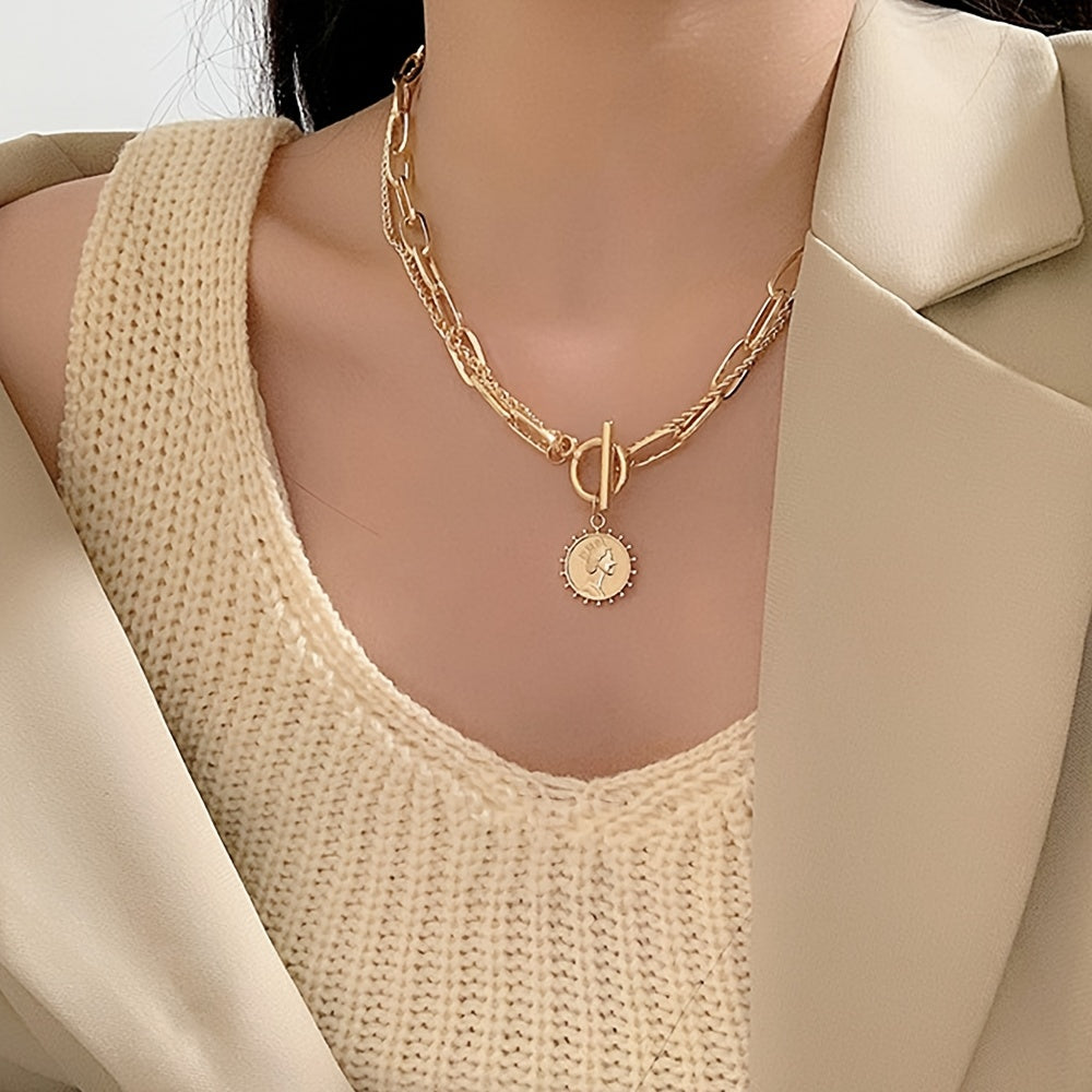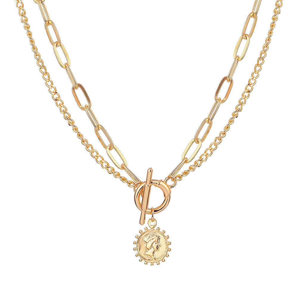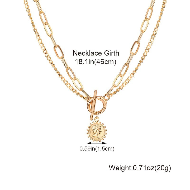 This stylish double layer necklace features a golden coin head pendant on a metal chain, perfect for adding a touch of elegance to your outfit.