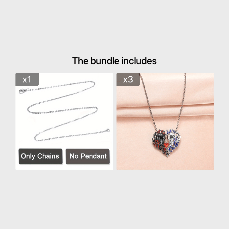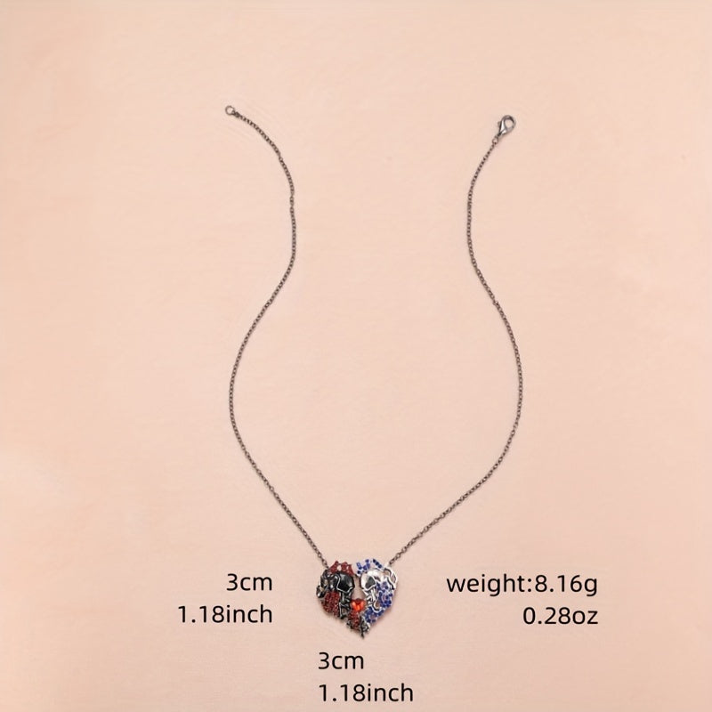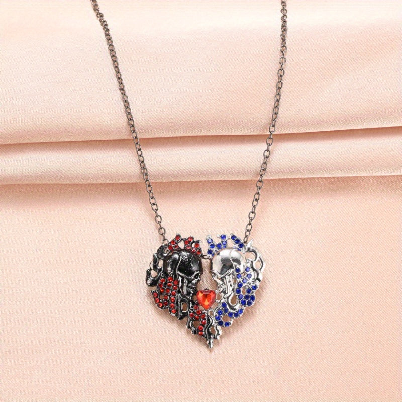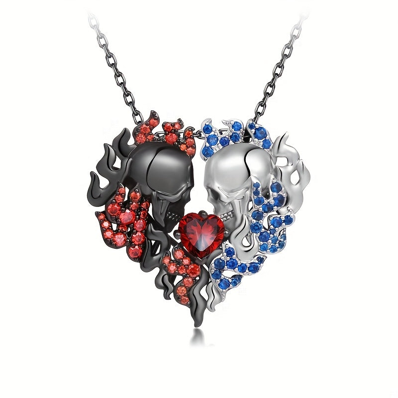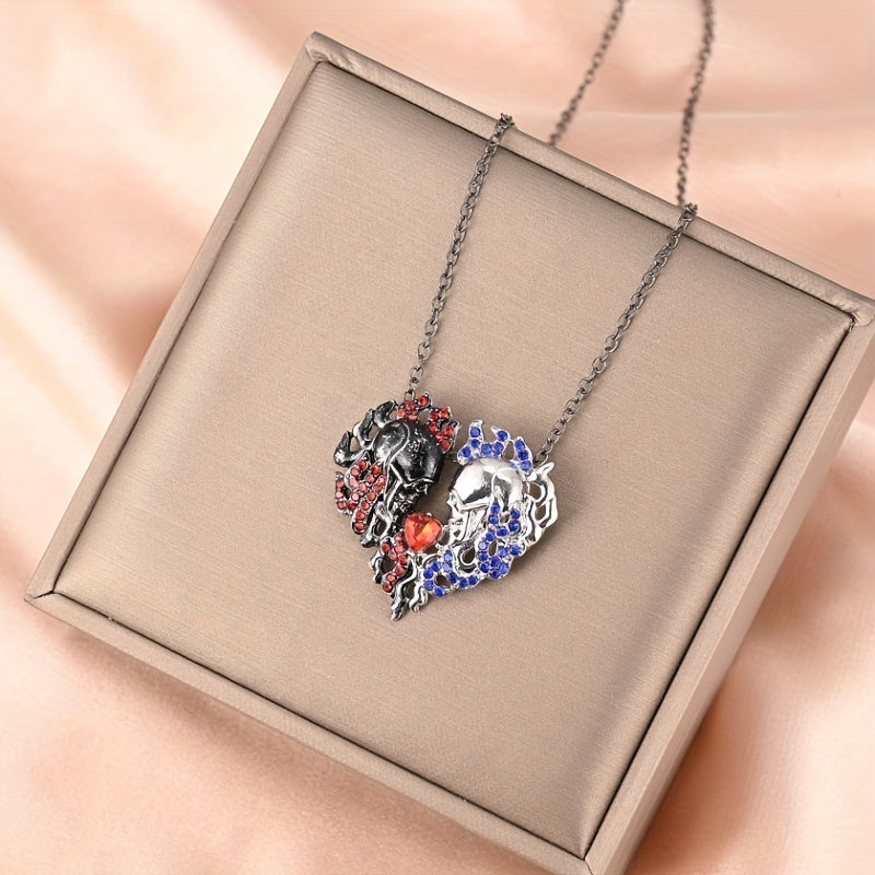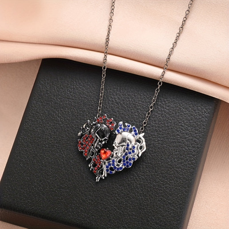 Unique and edgy half skull pendant necklace featuring a red heart crystal. Perfect gift for Thanksgiving, Christmas, or birthdays for men and women.