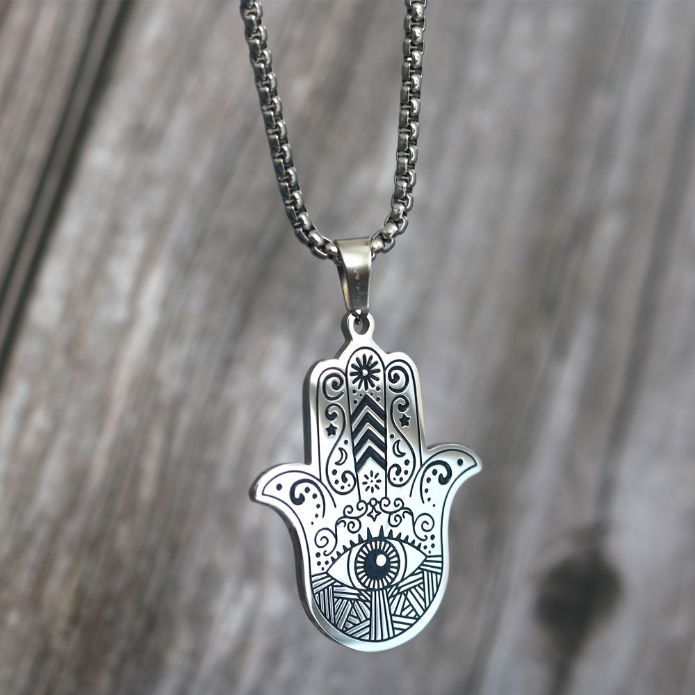 This necklace features a Hamsa Hand Pendant with Evil Eye design, perfect for bringing good luck. The vintage style adds a unique touch to any outfit.