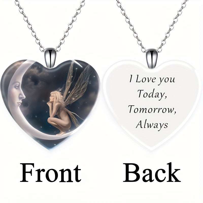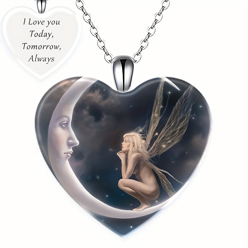 This zinc alloy pendant necklace features a creative design with a heart, crystal moon, and elf charm. Suitable for men, women, couples, or as party decoration.