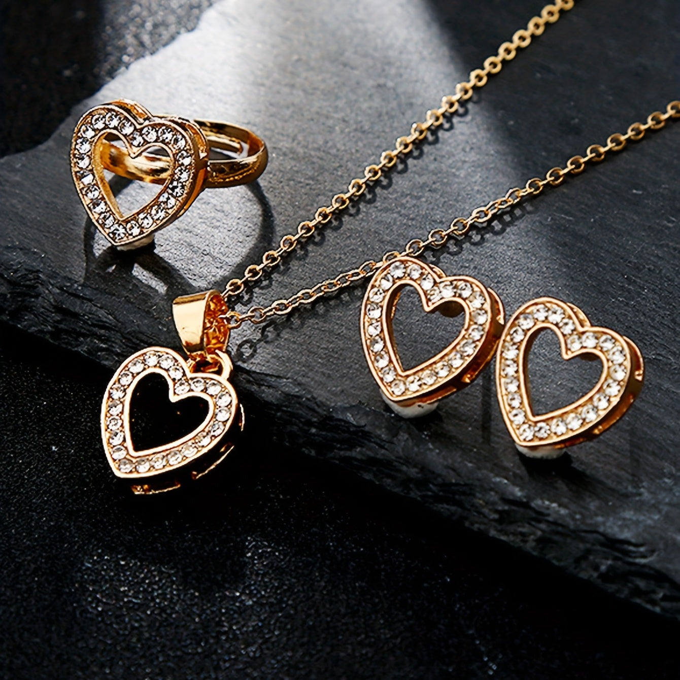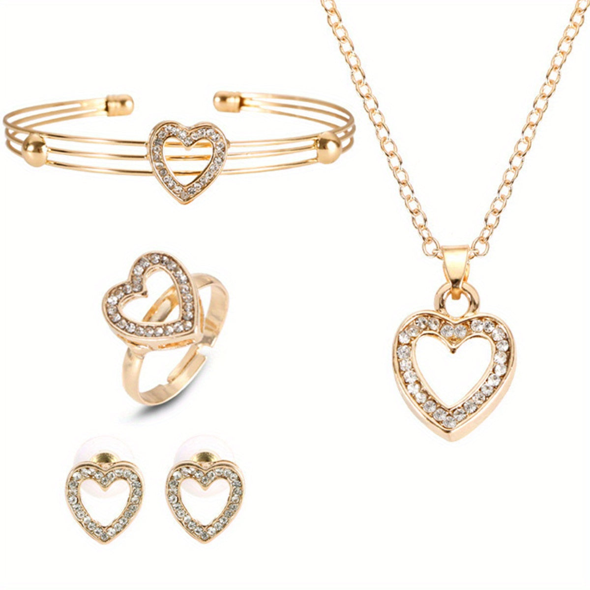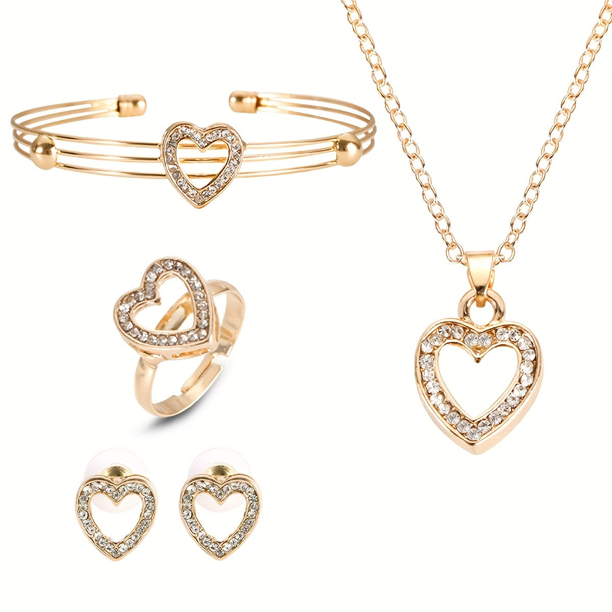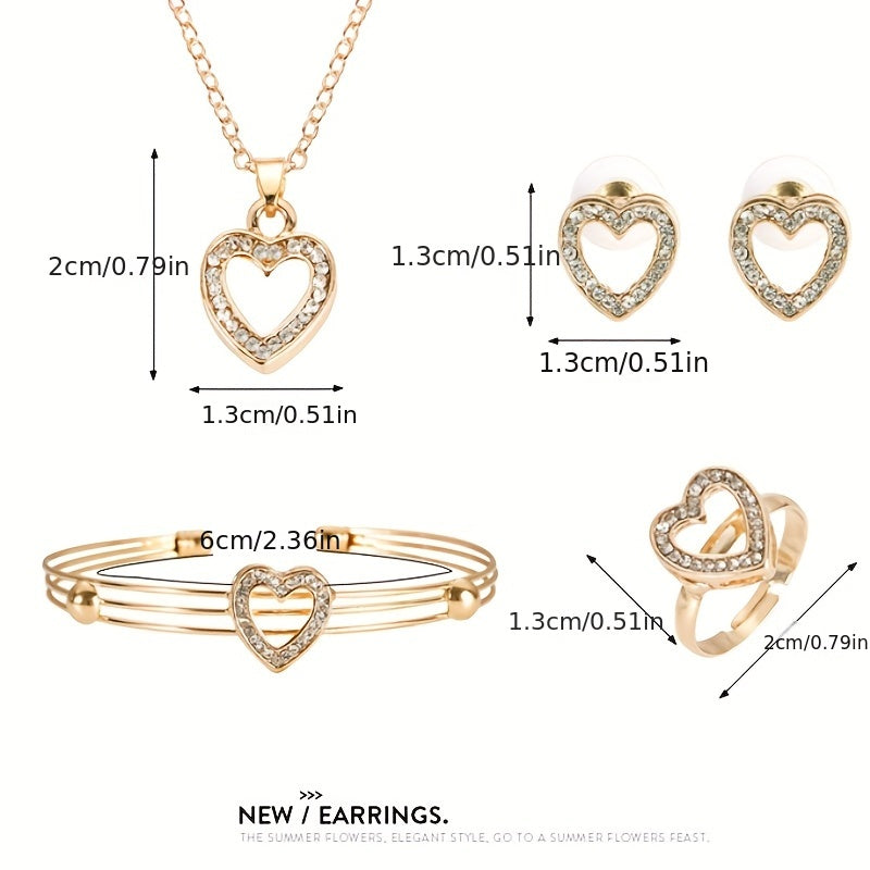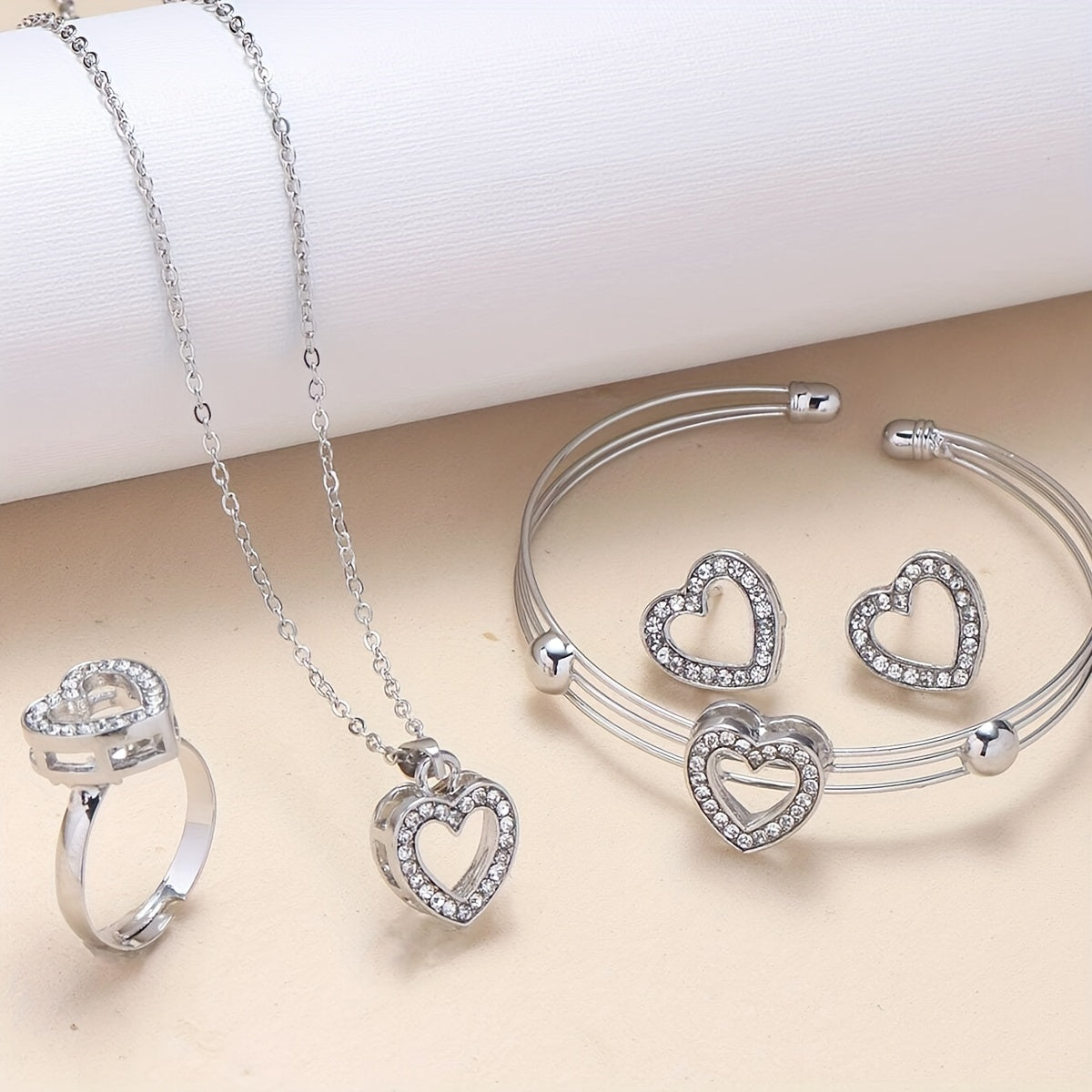 Elevate your style with this 5-piece jewelry set featuring earrings, necklace, bracelet, and ring, all adorned with heart inlaid rhinestones. Perfect for adding a touch of elegance to your daily outfits or for accessorizing at parties.