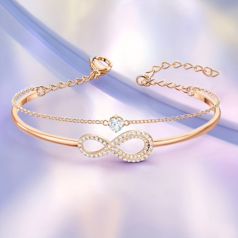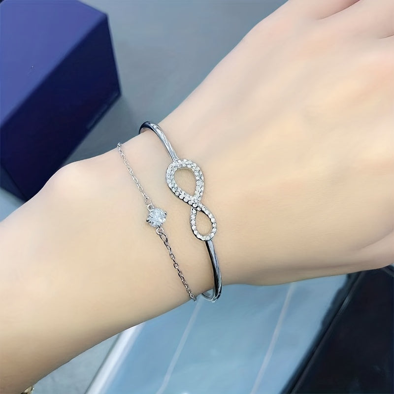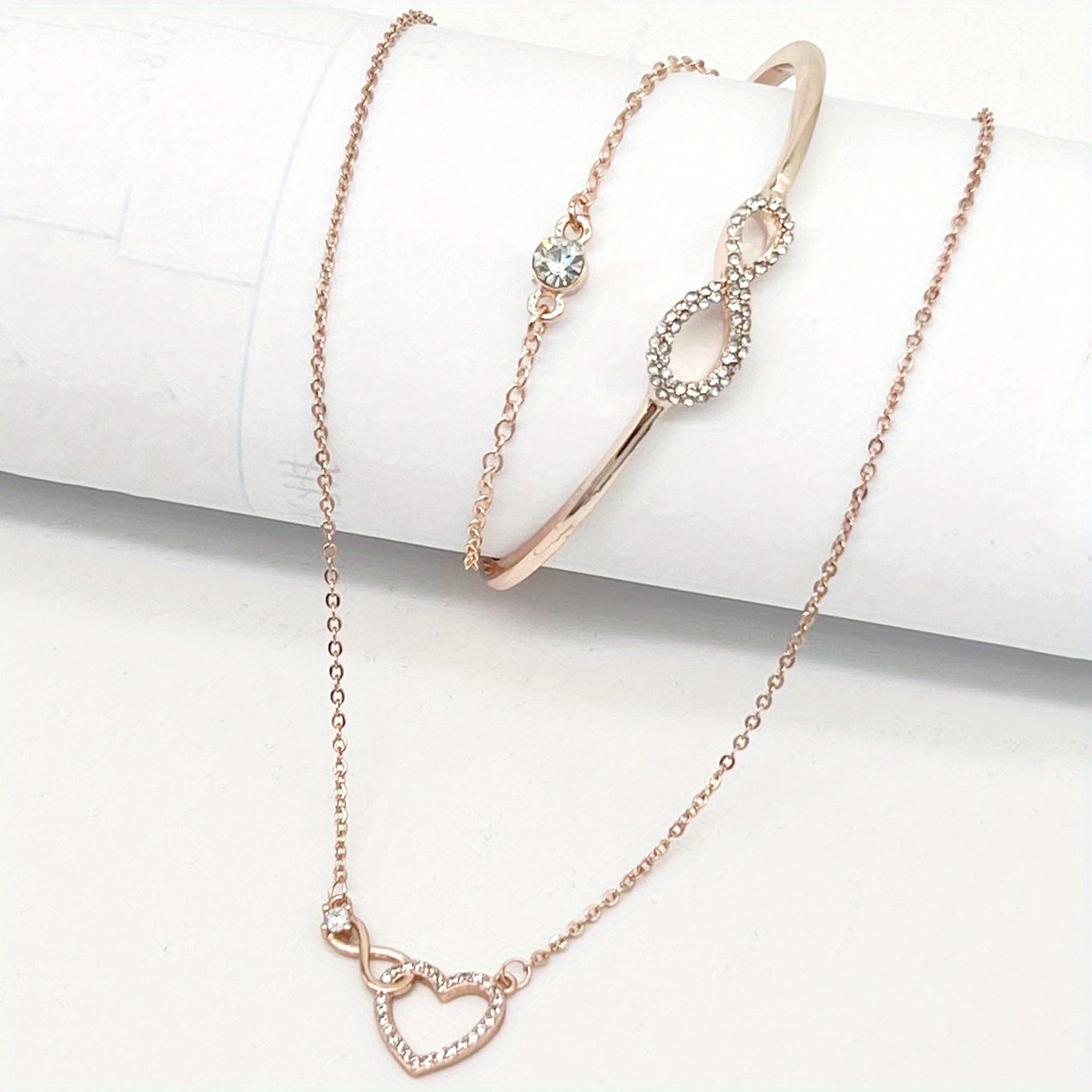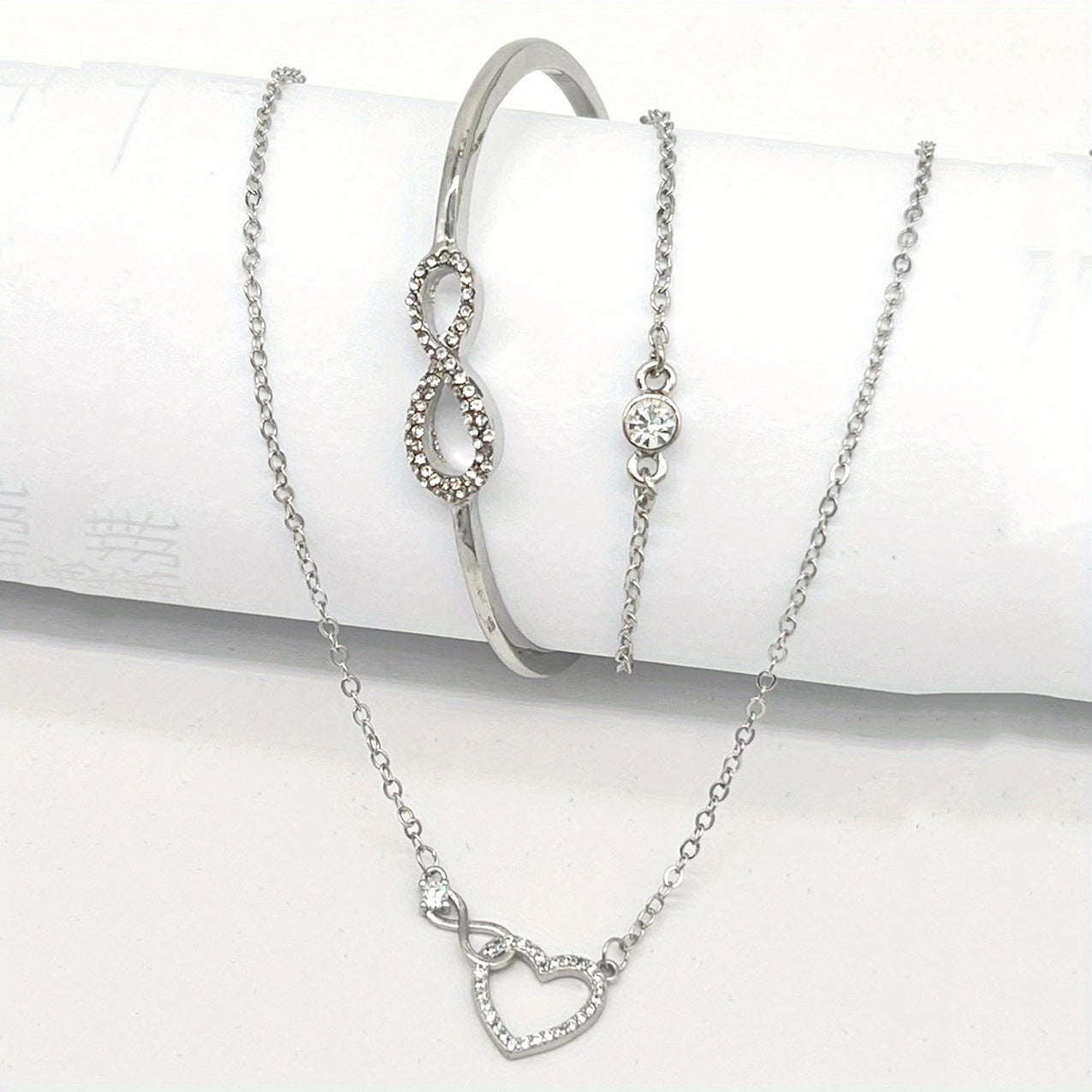 Complete your look with this charming jewelry set featuring a heart shape necklace and infinity sign bracelet. Ideal for everyday wear or special occasions.