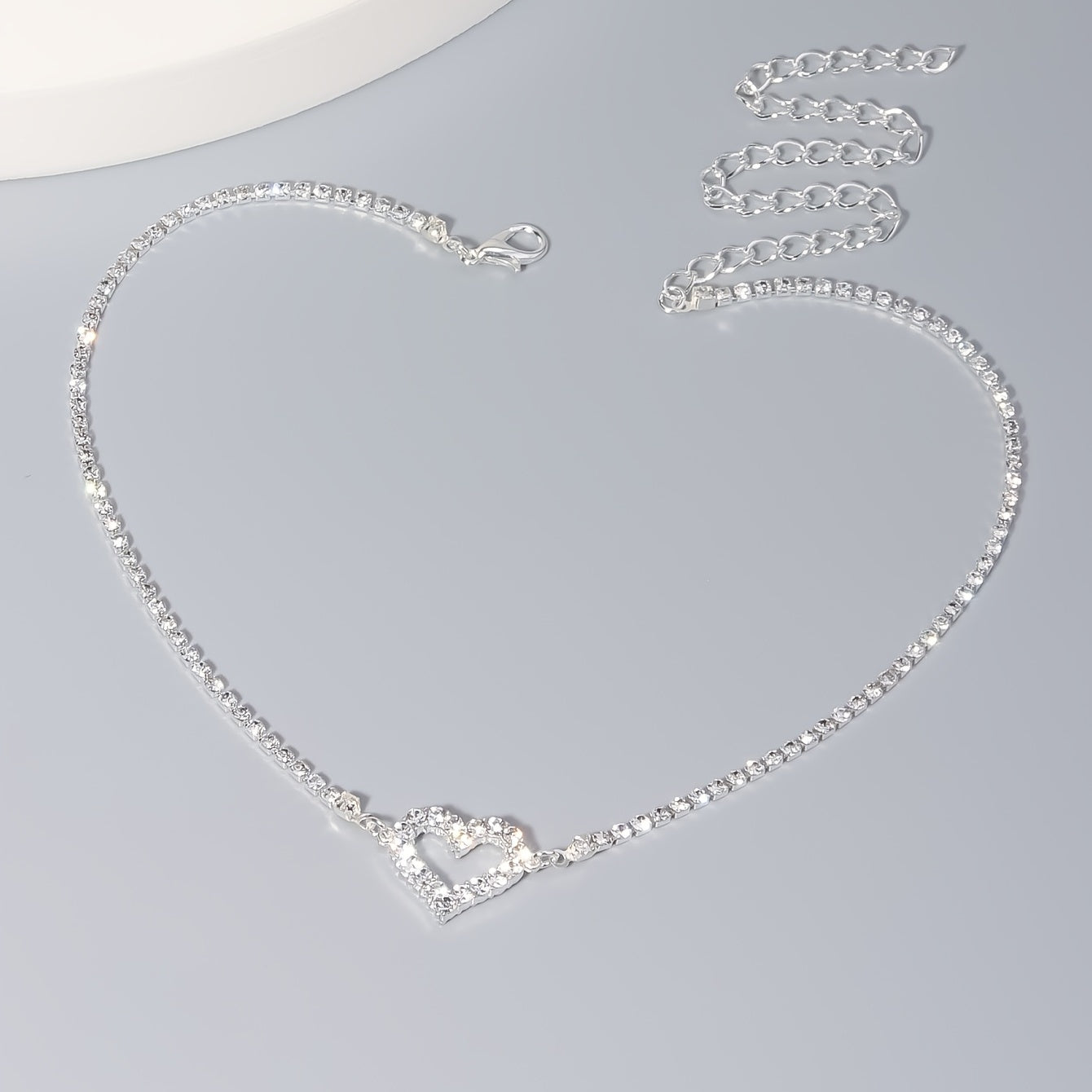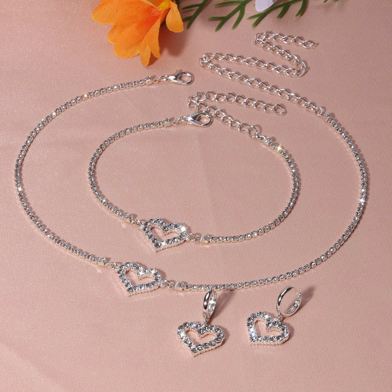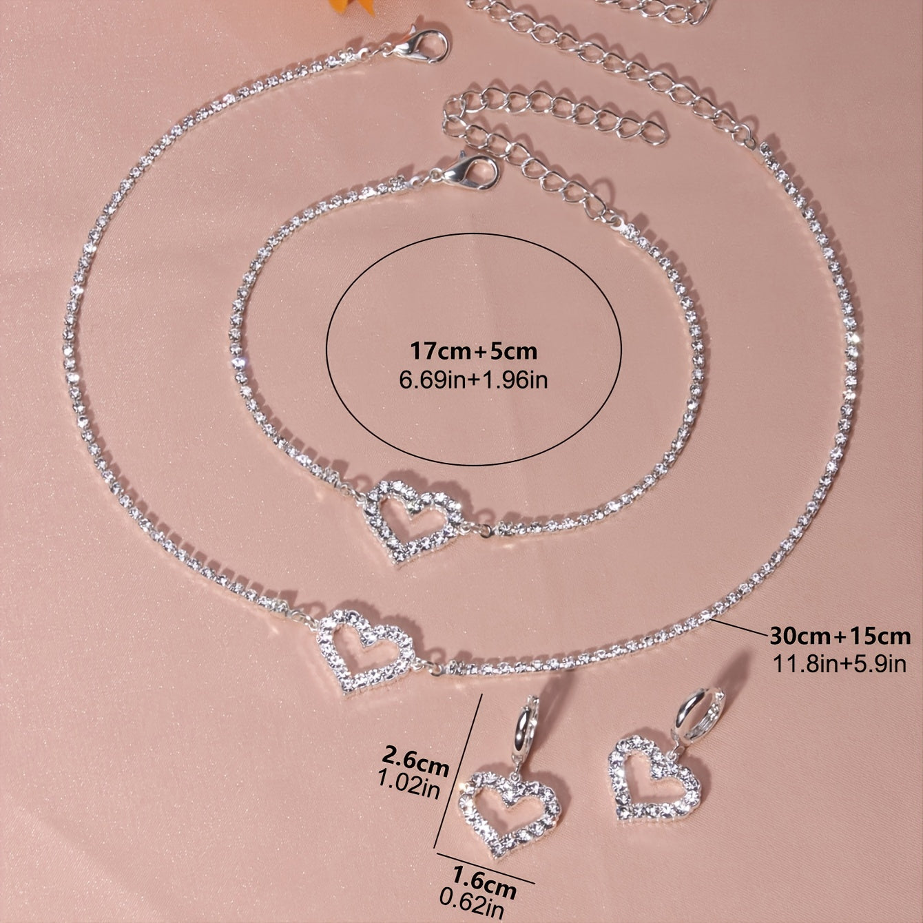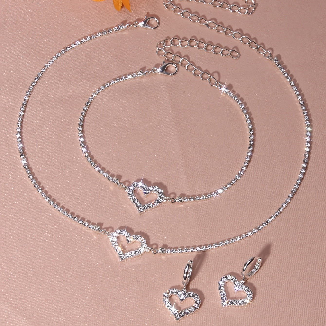 Elevate your style with this exquisite jewelry set featuring a heart-shaped design adorned with rhinestones. The set includes a choker necklace, chain bracelet, and dangle earrings, perfect for adding a touch of elegance to any outfit.