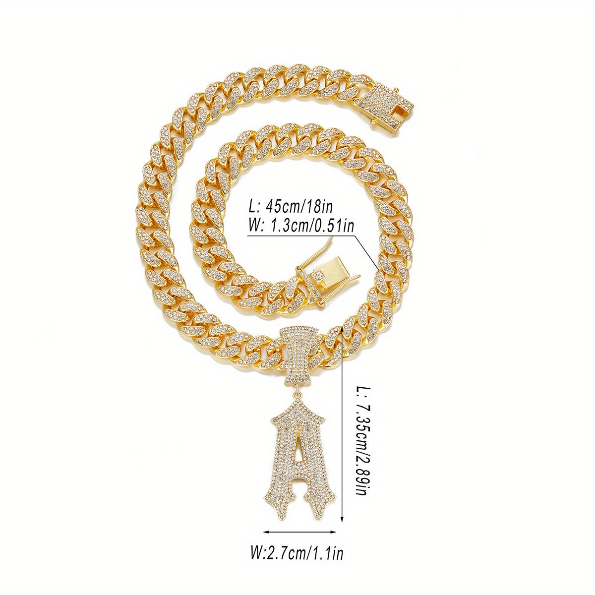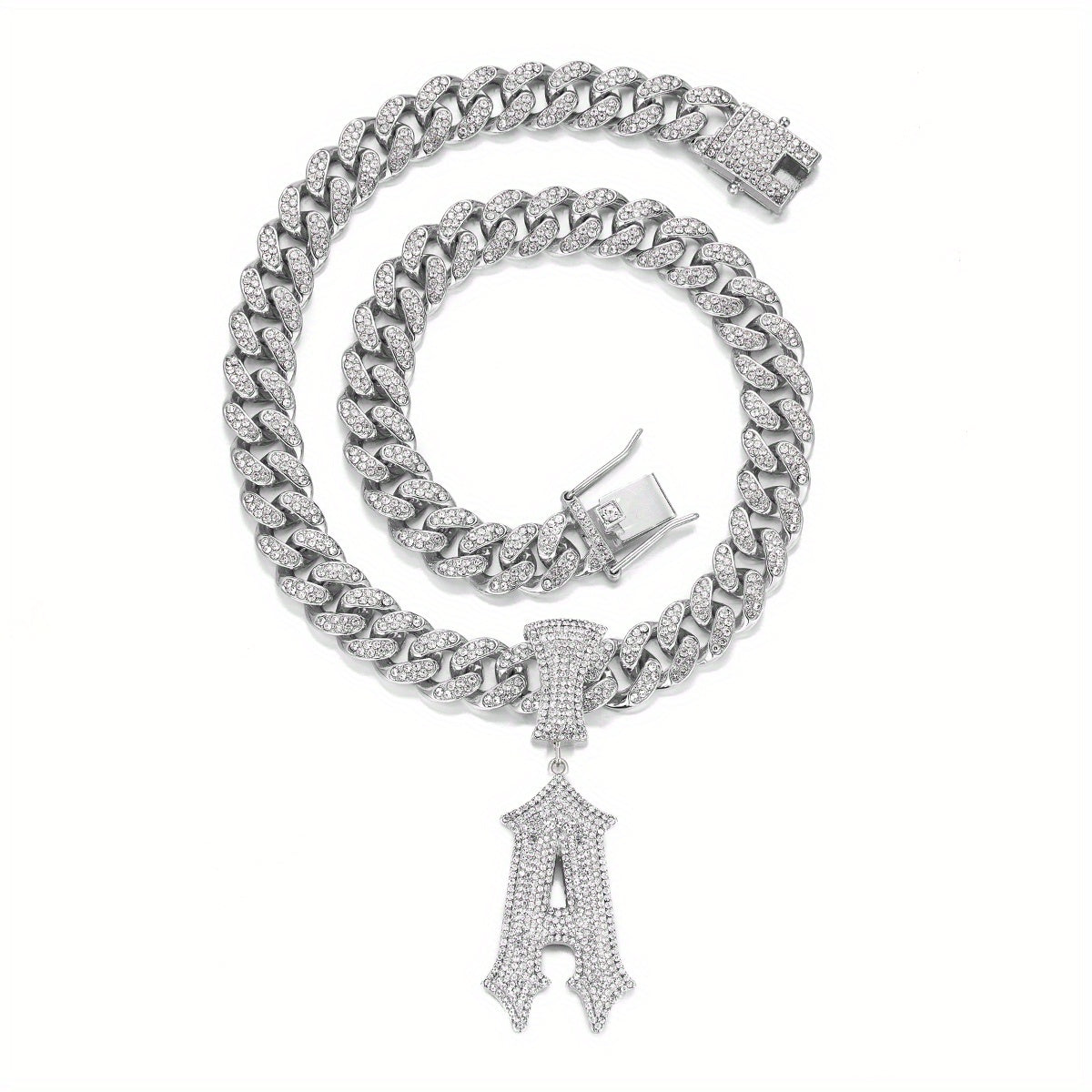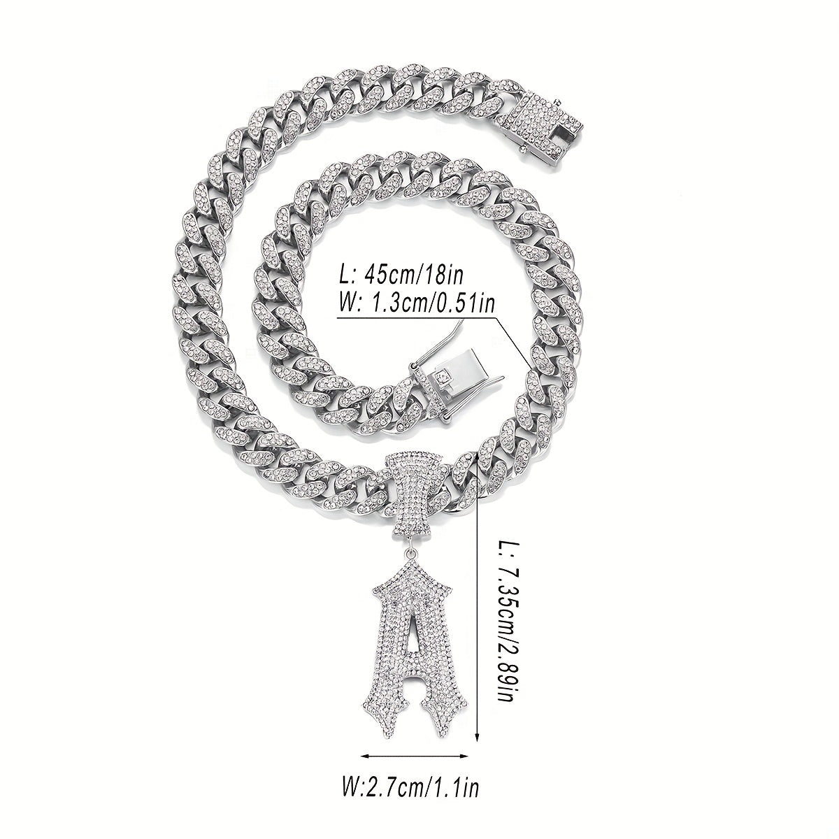 This hip hop necklace is designed with full rhinestones and features an A letter pendant. It comes with a 15MM Cuban chain, making it a stylish accessory for men and women, especially rappers.