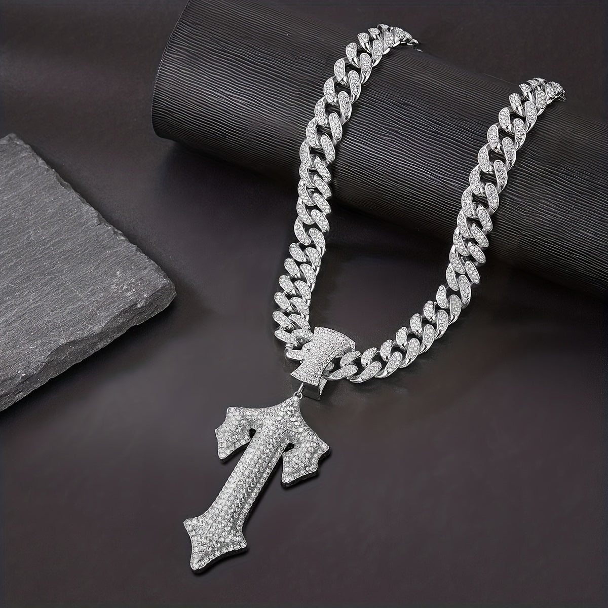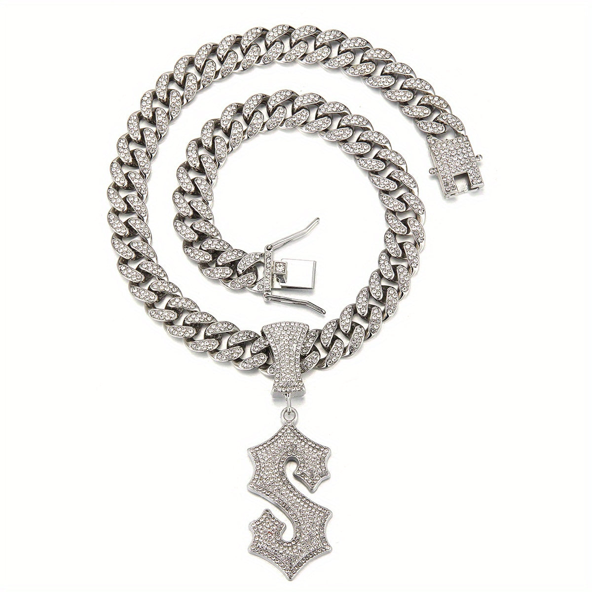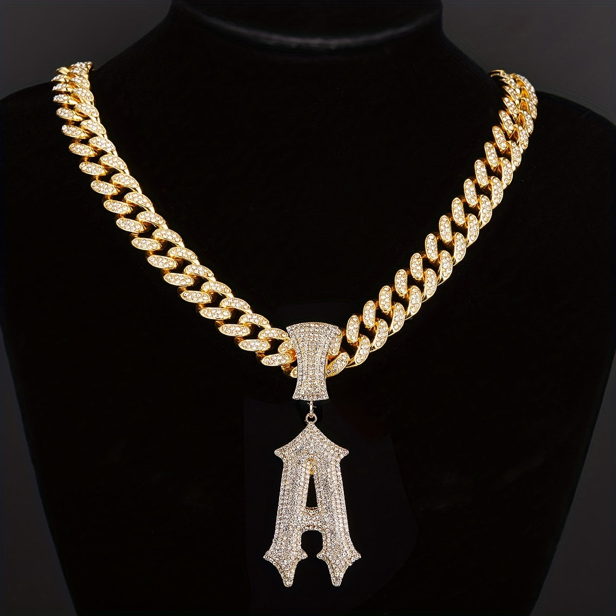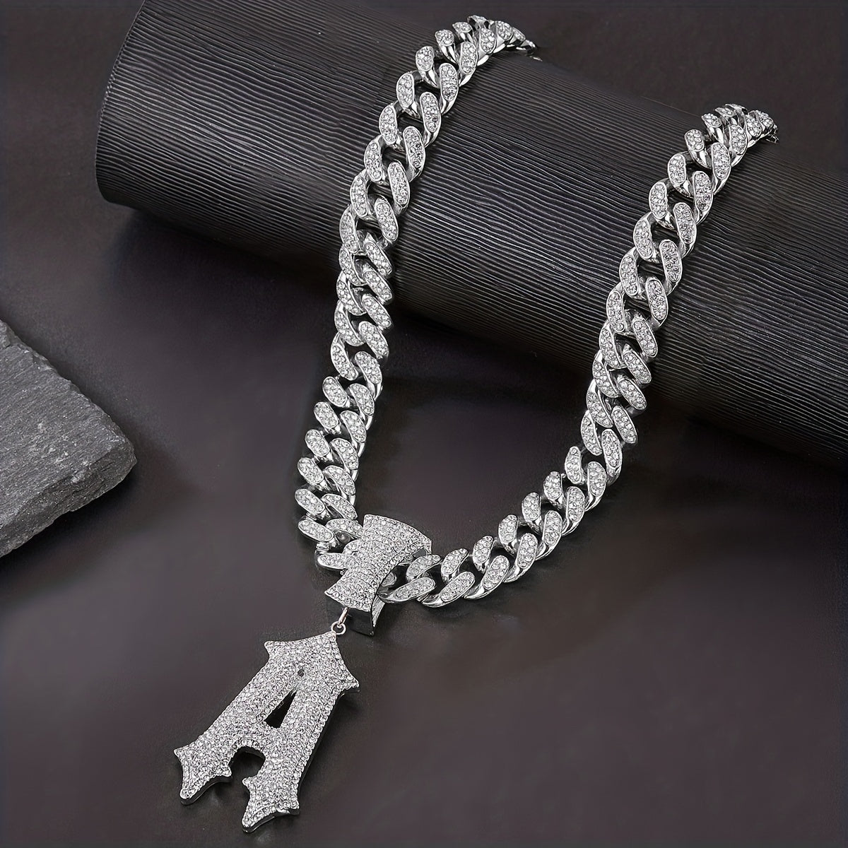This hip hop necklace is designed with full rhinestones and features an A letter pendant. It comes with a 15MM Cuban chain, making it a stylish accessory for men and women, especially rappers.