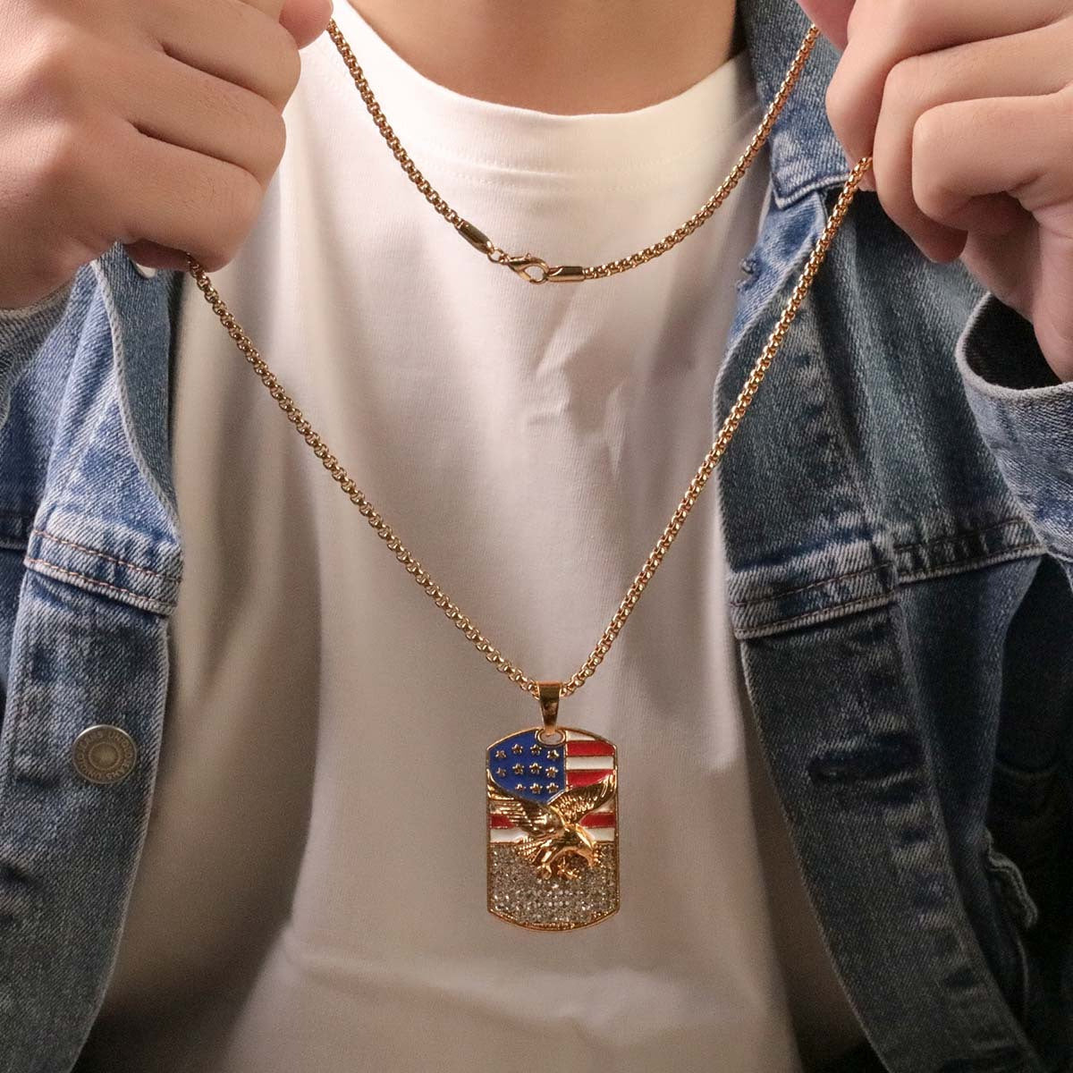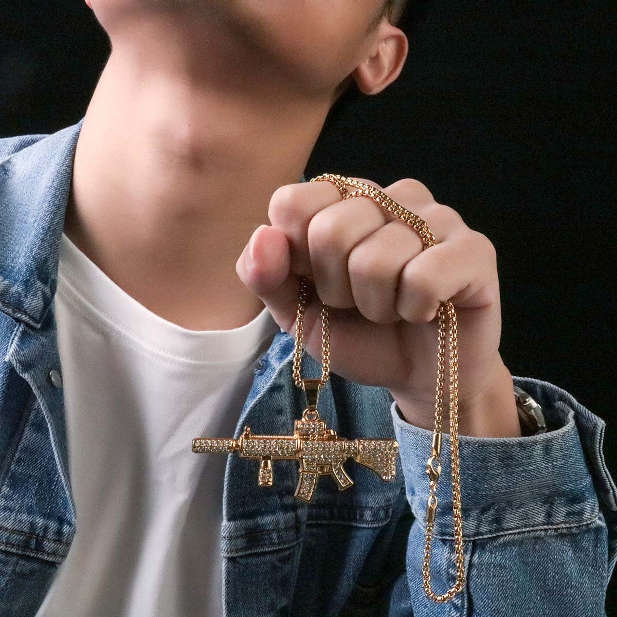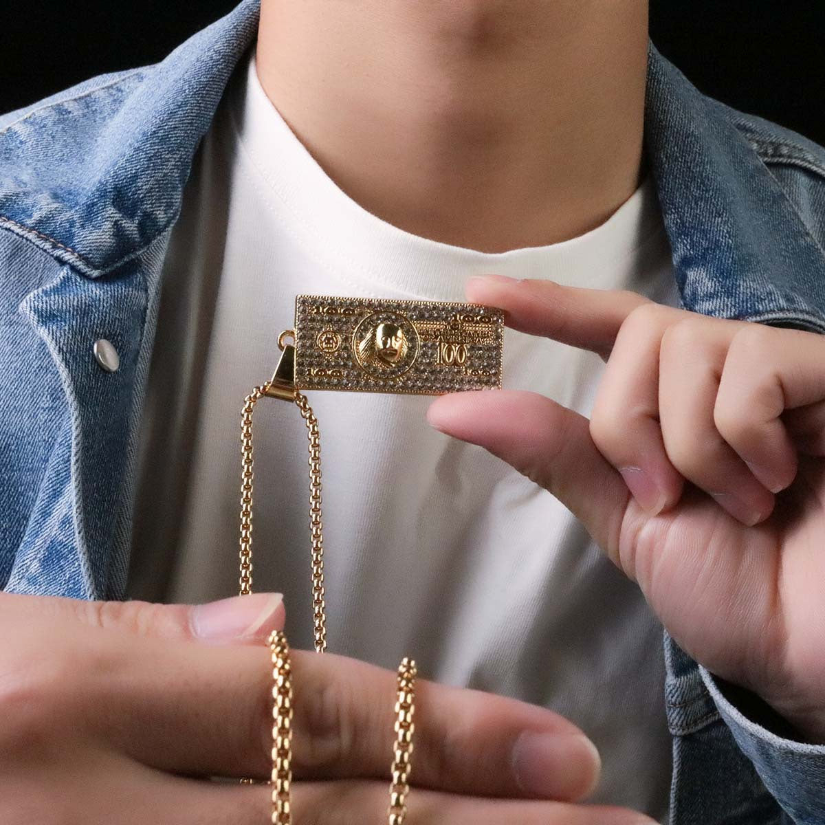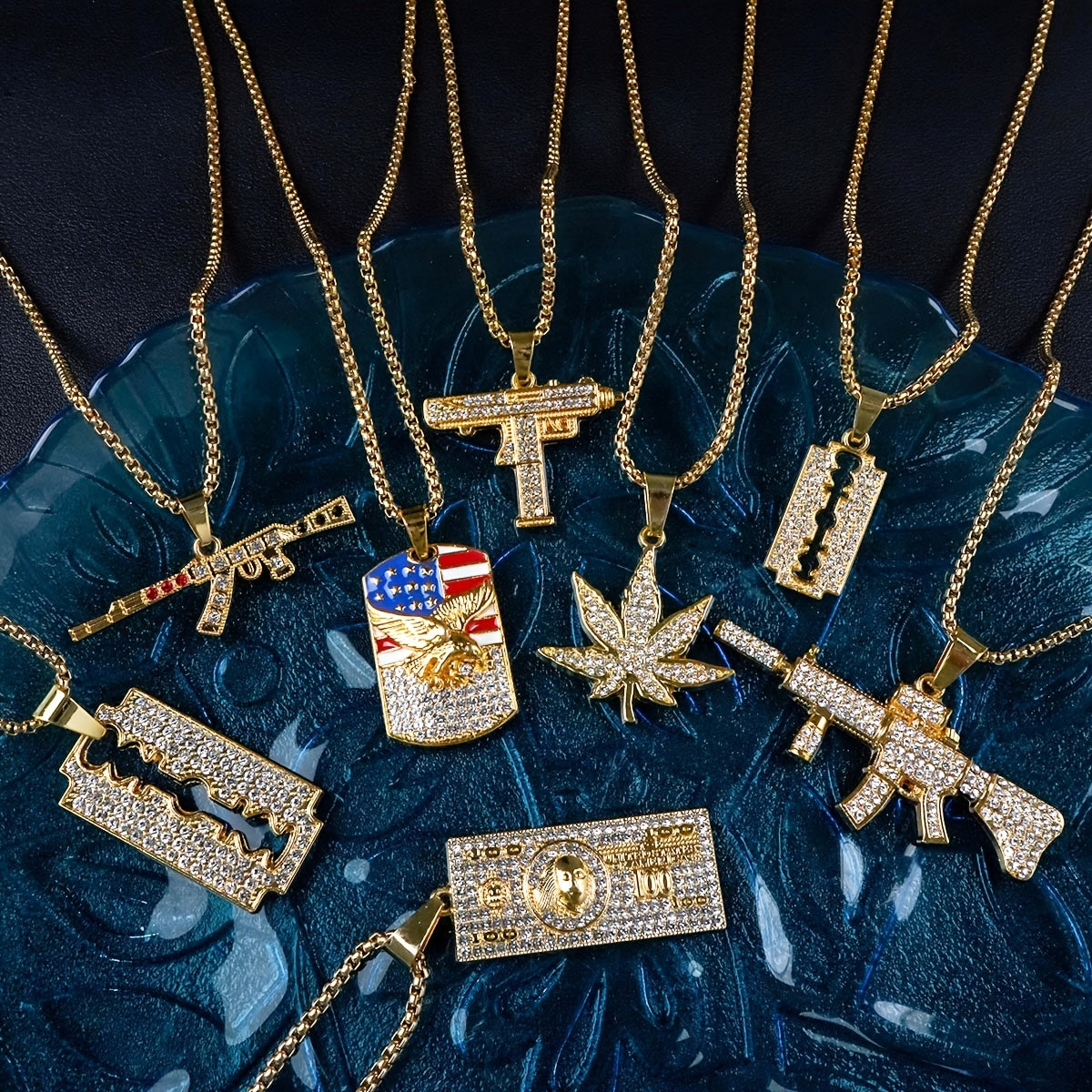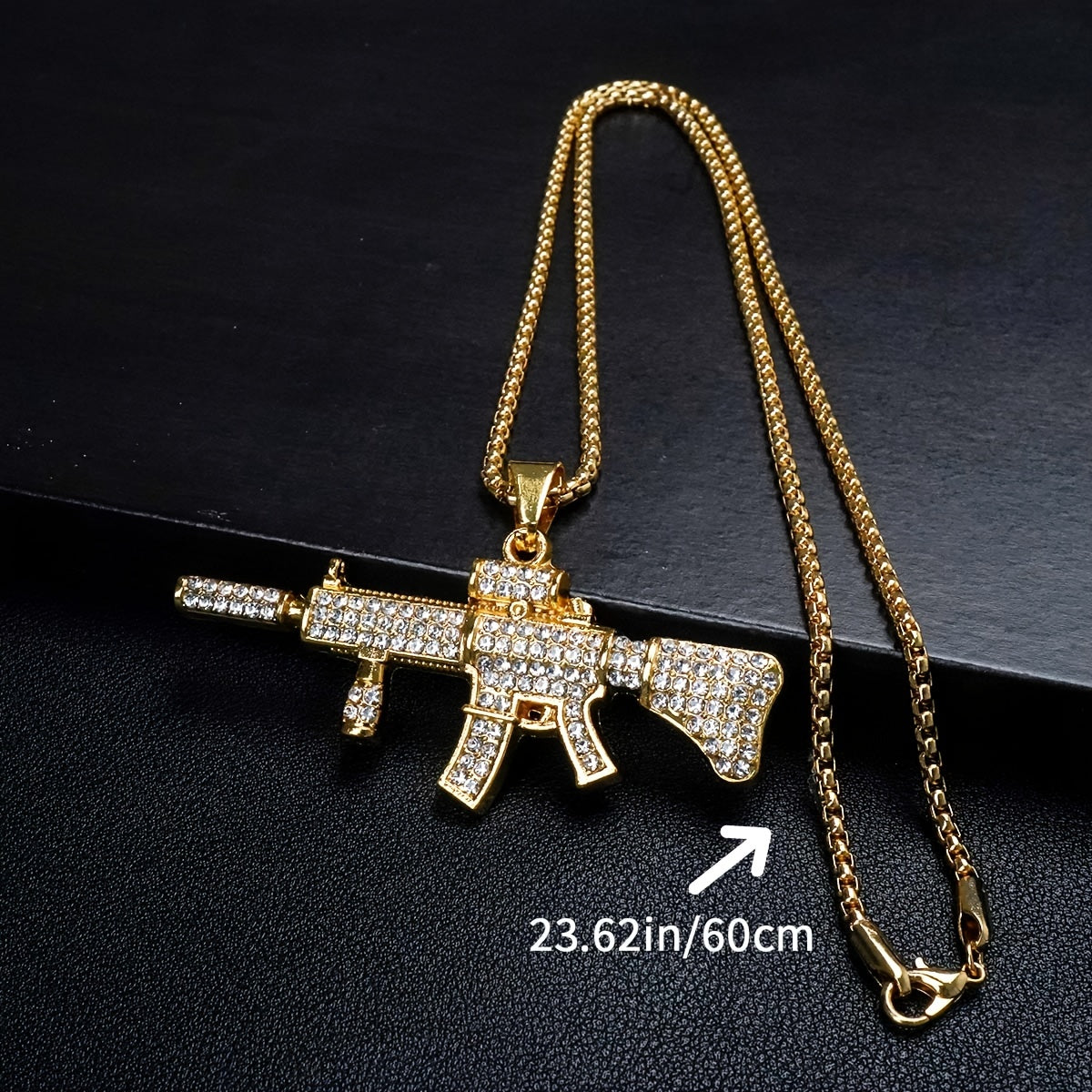This hip hop pendant necklace features artificial rhinestones and alloy materials. The pendant is golden plated for a stylish look.