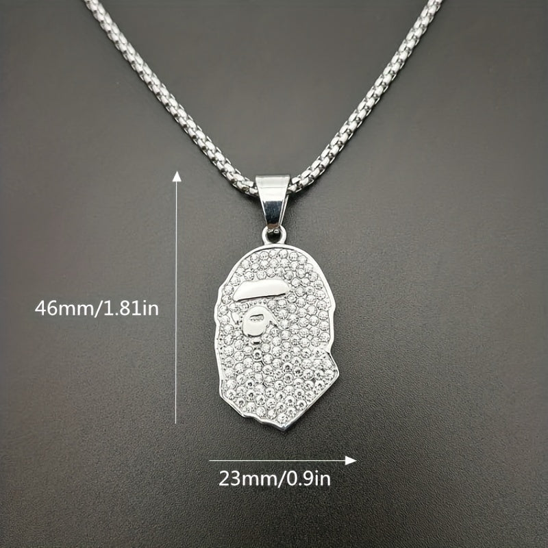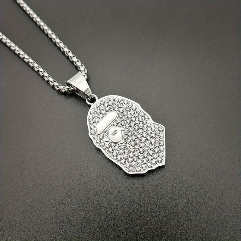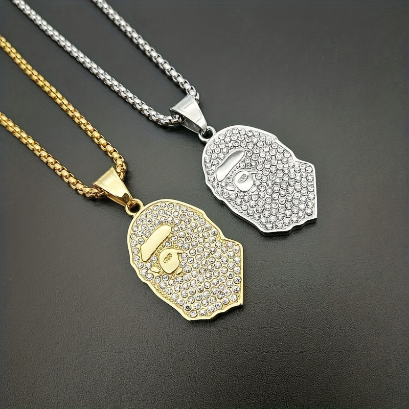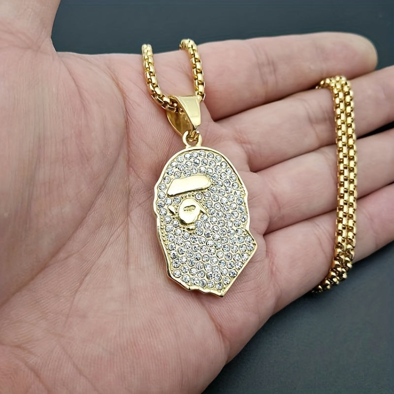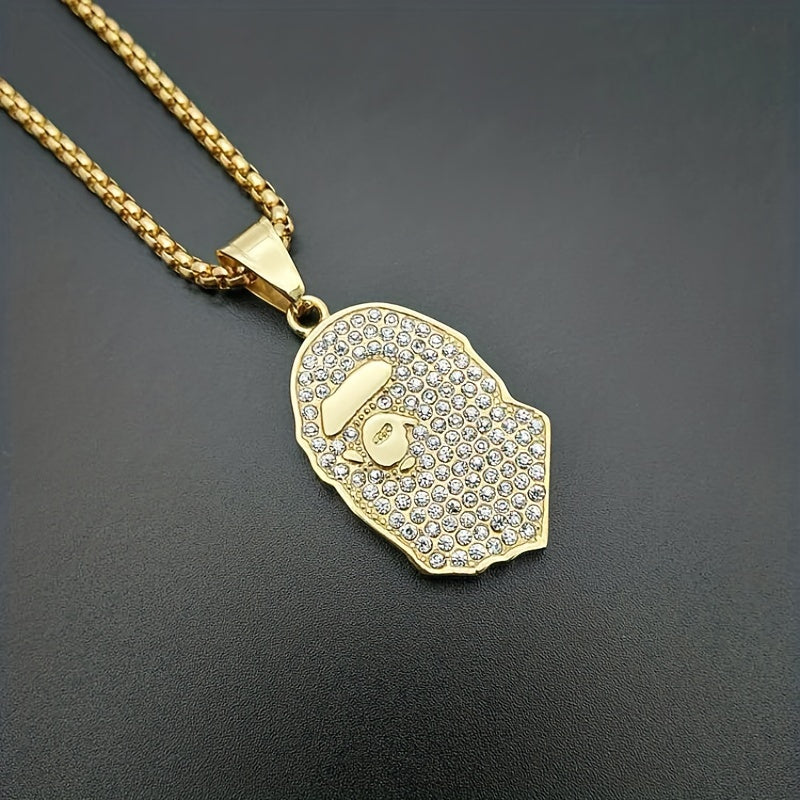 Make a stylish statement with this golden plated pendant necklace featuring rhinestone apes design. Ideal accessory for hip hop enthusiasts.