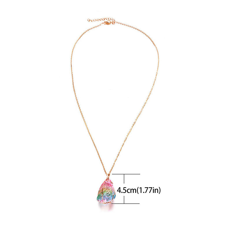 This beautiful necklace features an irregular rainbow stone chakra pendant made of quartz. It is a unique piece that promotes balance and harmony.