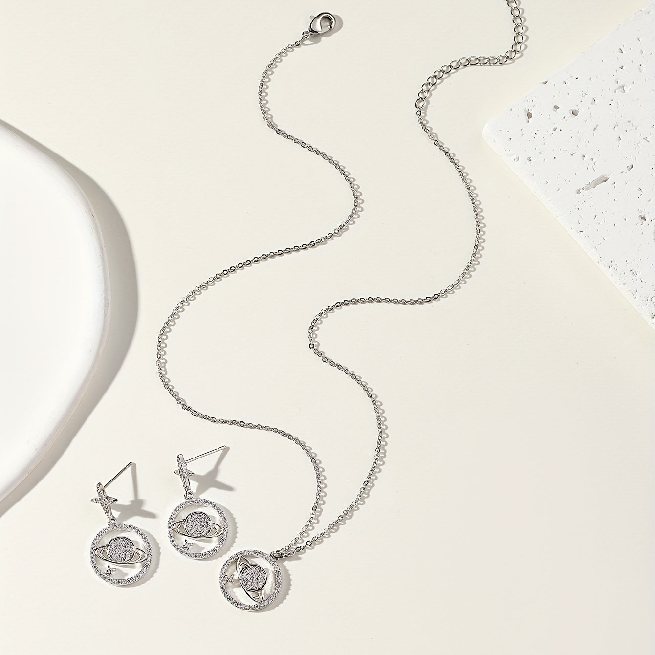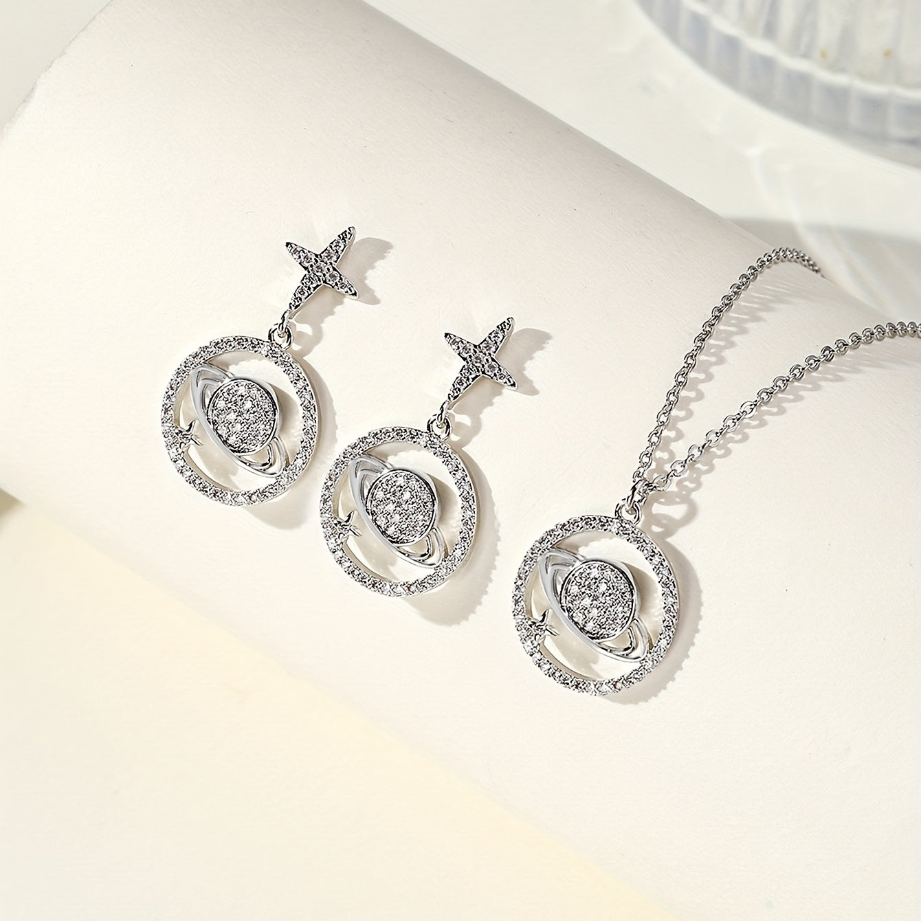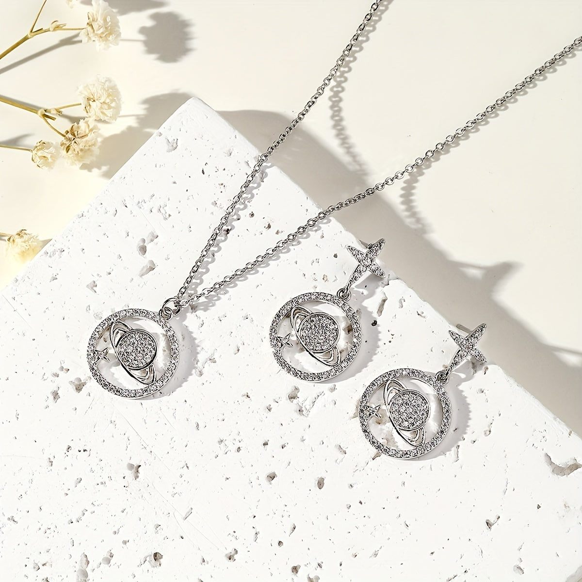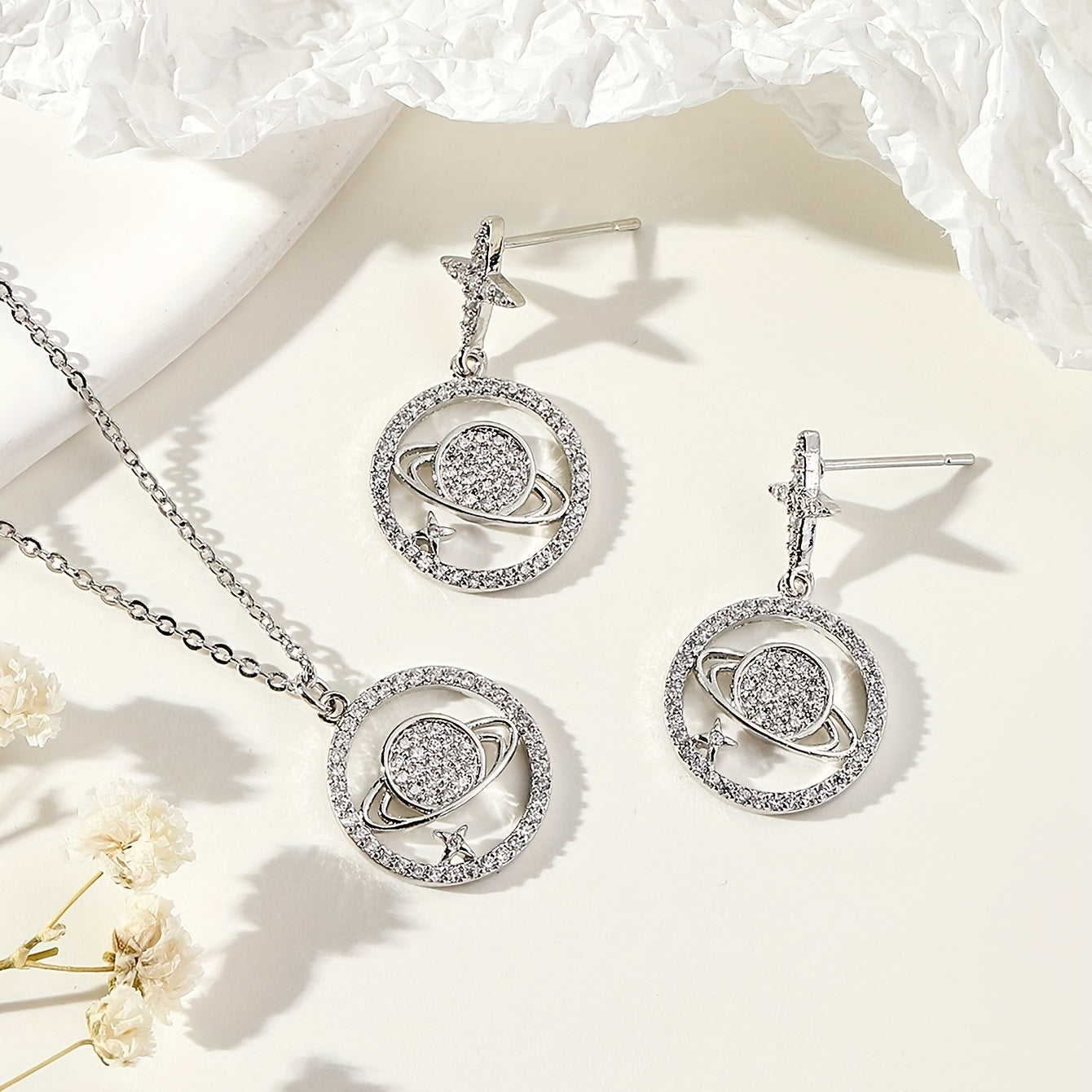 Enhance your daily outfits with this 3pcs earrings plus necklace set. Crafted with silver-plated material and inlaid with shining zircon planet design. Perfect for casual wear or special occasions. Makes a great birthday gift.