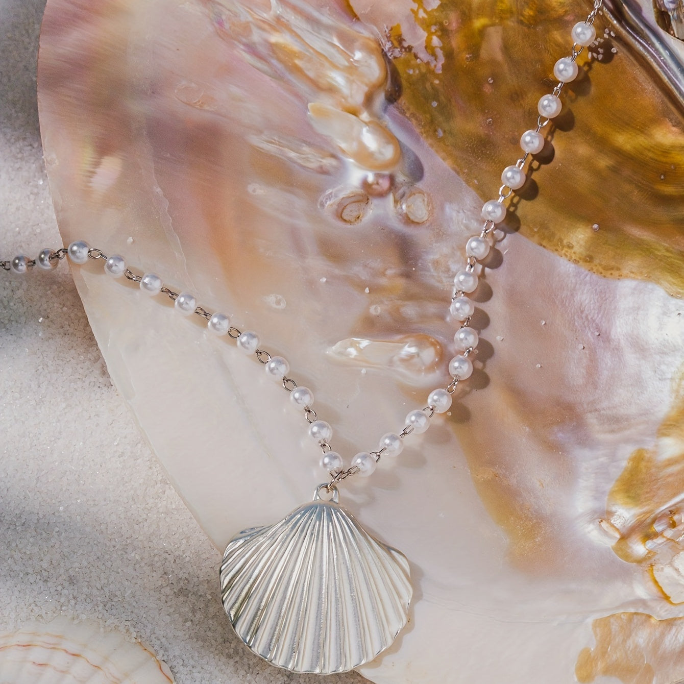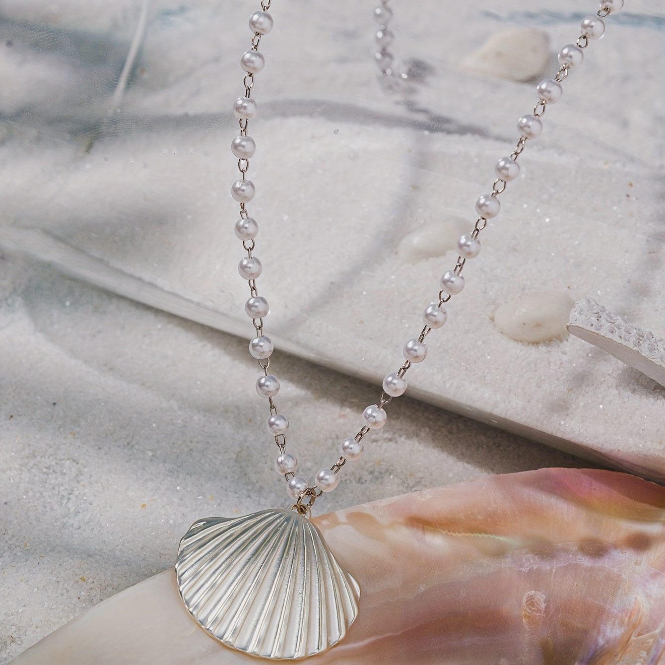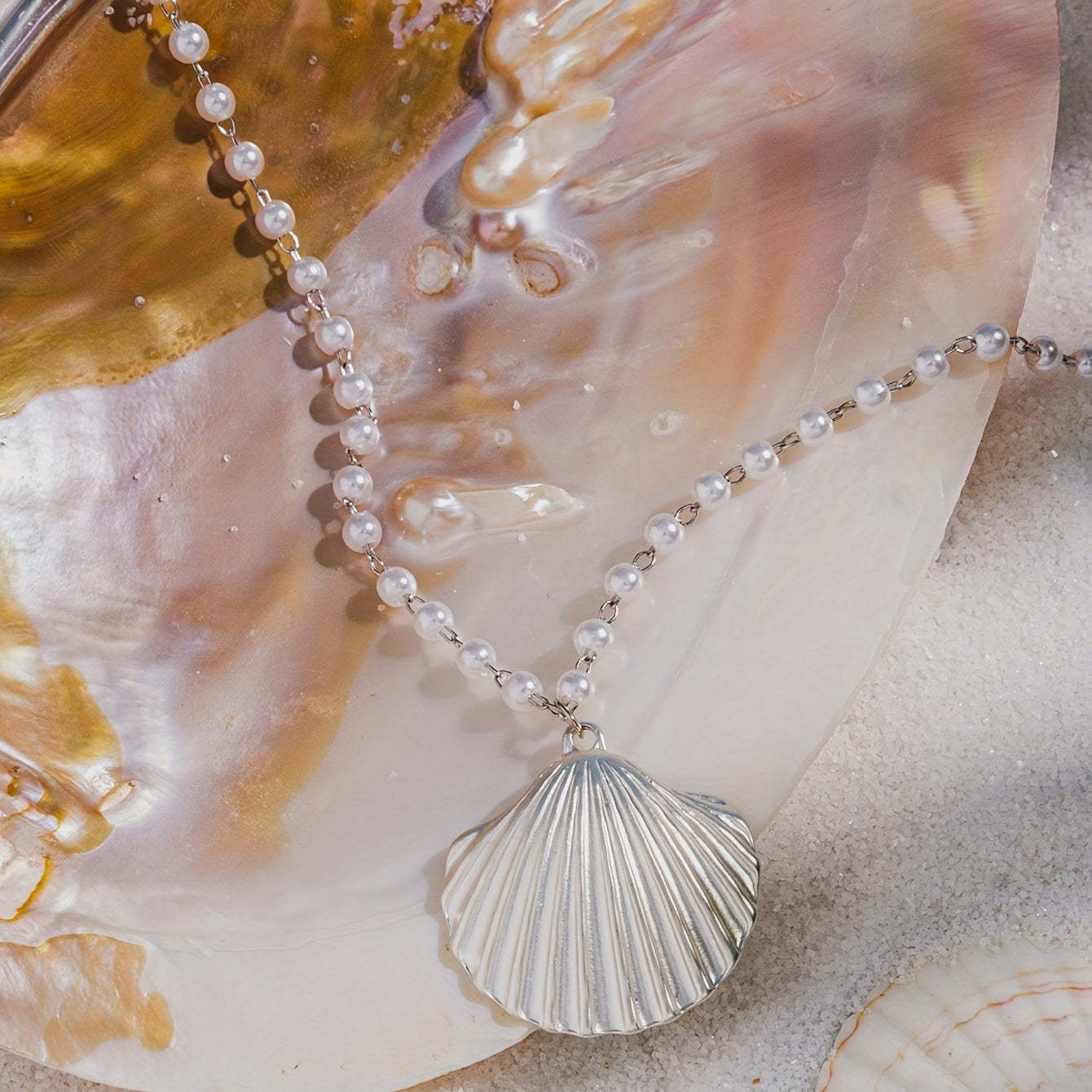 Add a touch of summer beach vibes to your outfit with this stunning large shell faux pearl pendant necklace. Perfect for any beach lover or as a gift for a special occasion.