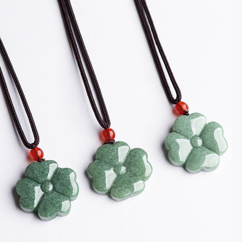 This necklace features a natural jade pendant in the shape of a lucky four-leaf clover. The perfect accessory to bring you good luck and fortune.