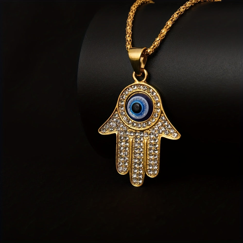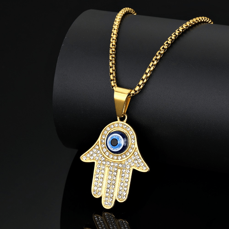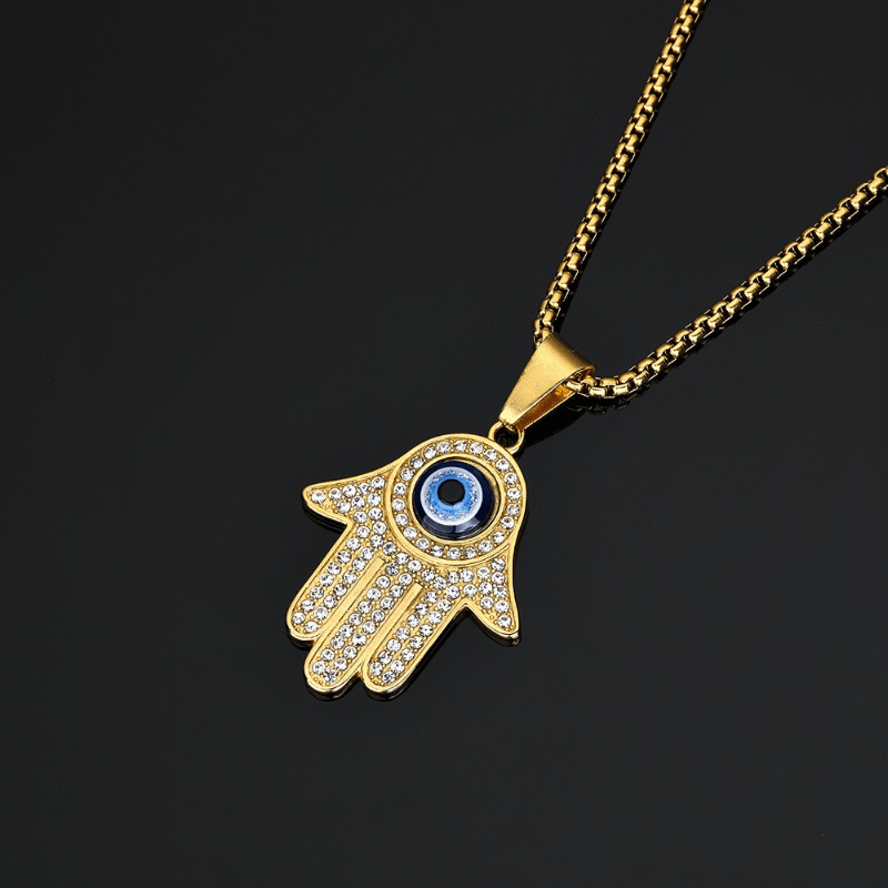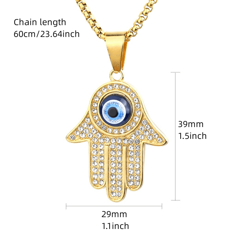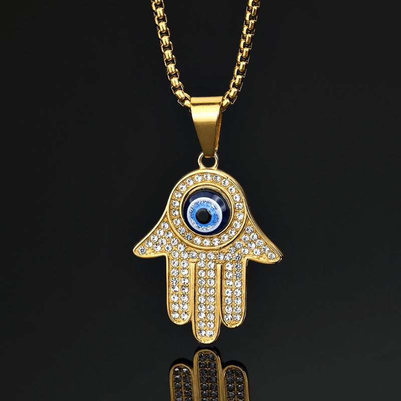 Add a touch of hip hop style with this devil's eye necklace featuring a faux diamond-encrusted Fatima lucky palm pendant.