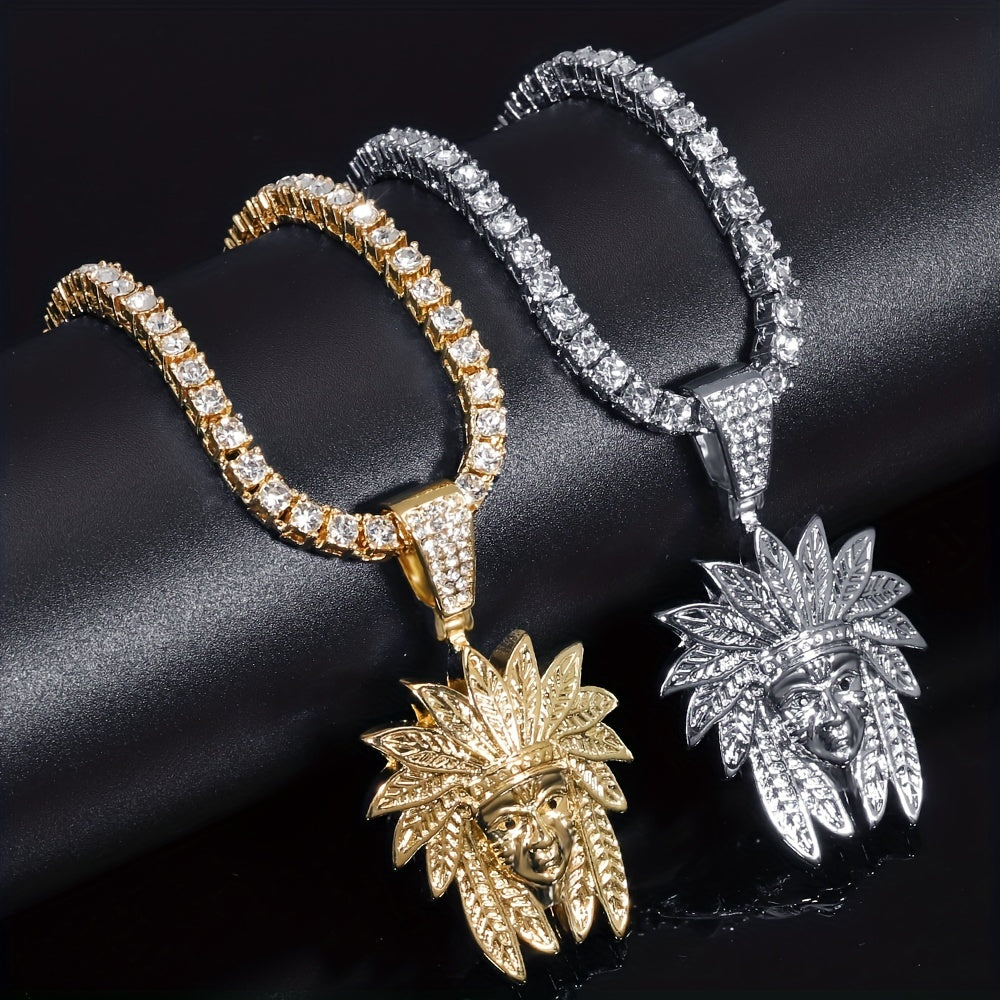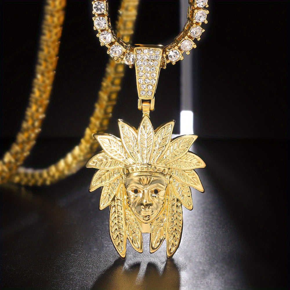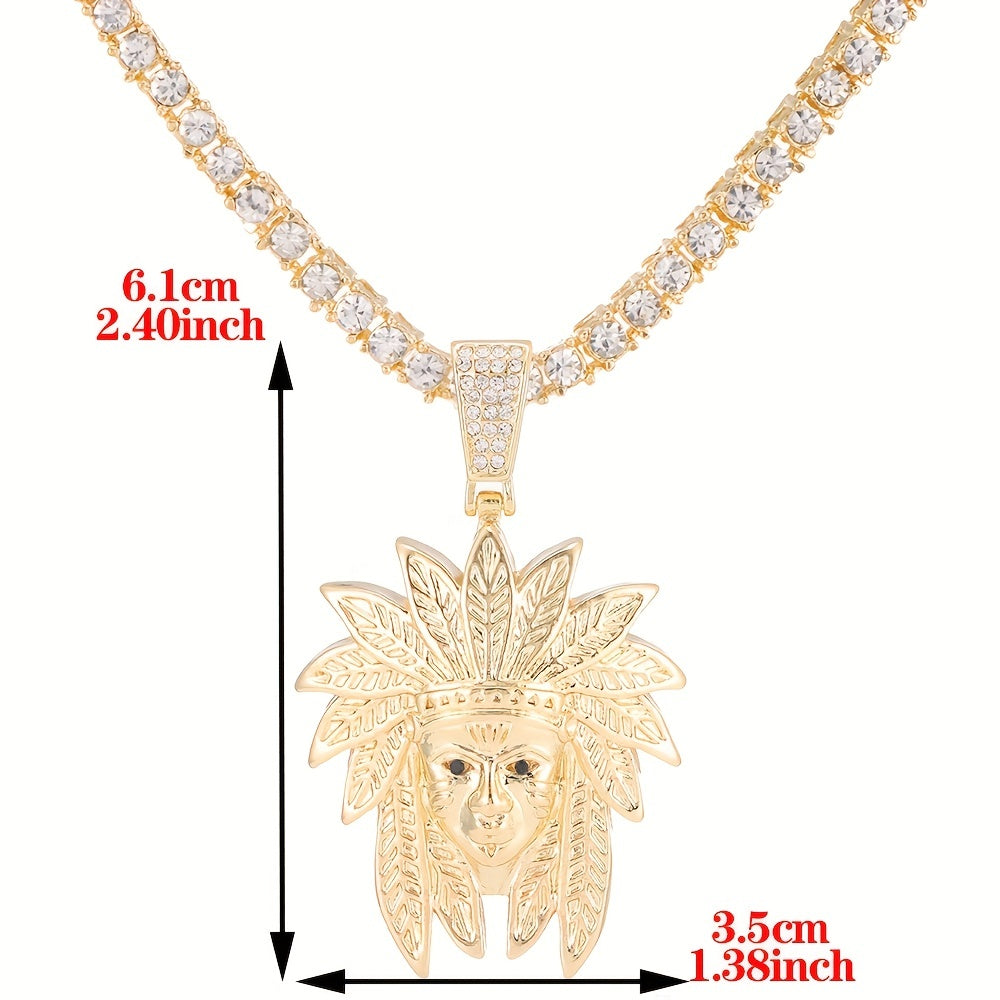 This hip hop jewelry features an Indian chief head pendant with zircon stones on a golden Cuban chain. A perfect gift for men who love bold and stylish accessories.