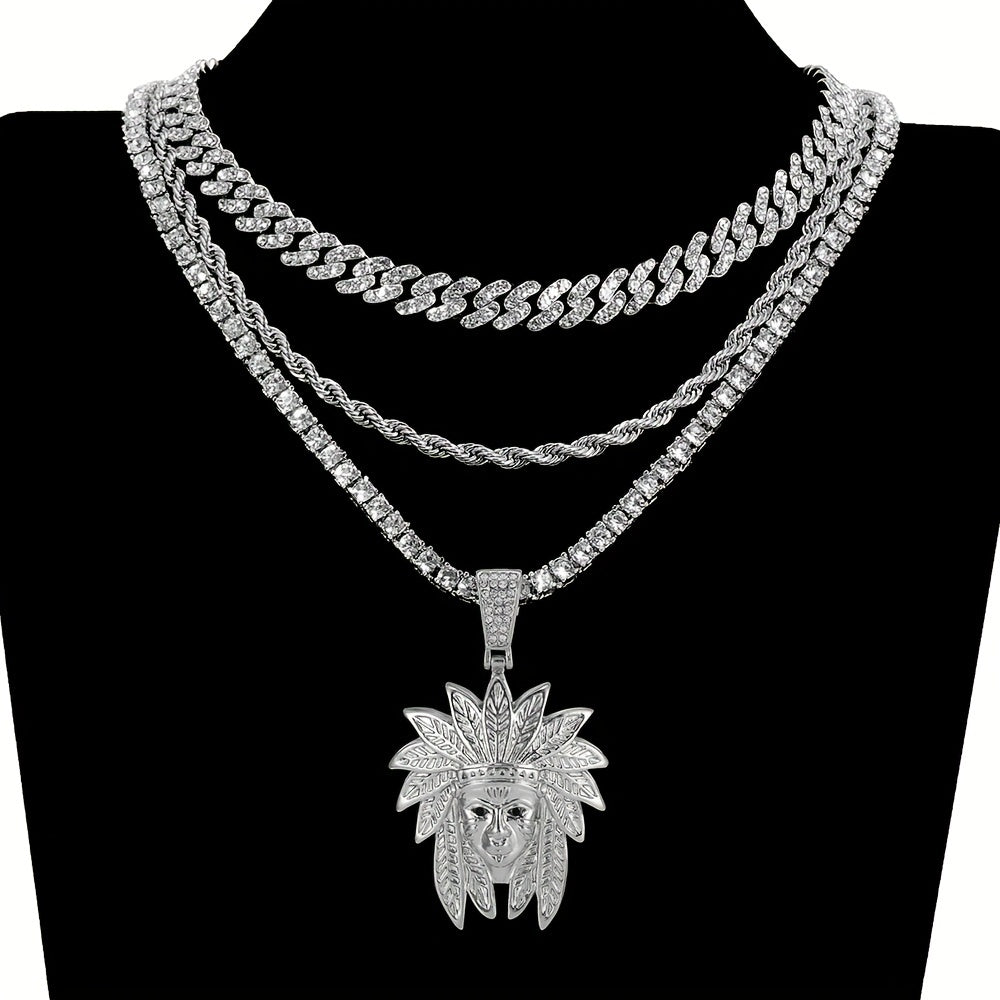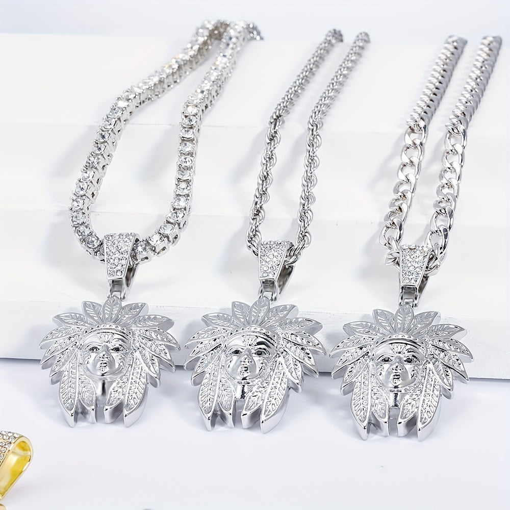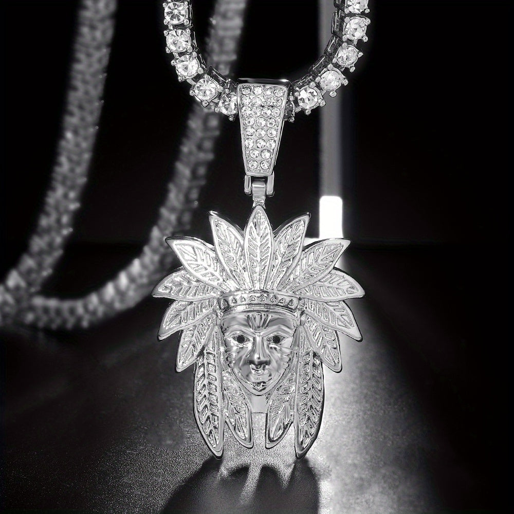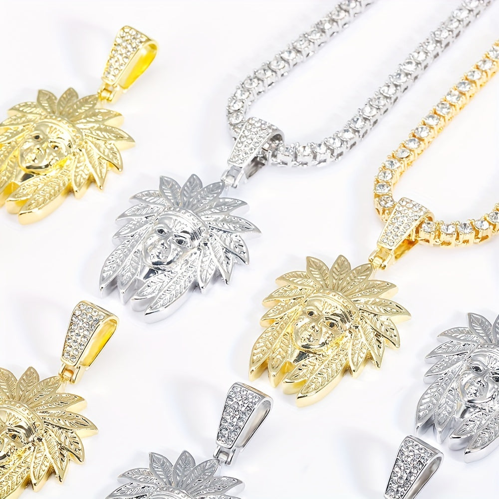 This hip hop jewelry features an Indian chief head pendant with zircon stones on a golden Cuban chain. A perfect gift for men who love bold and stylish accessories.