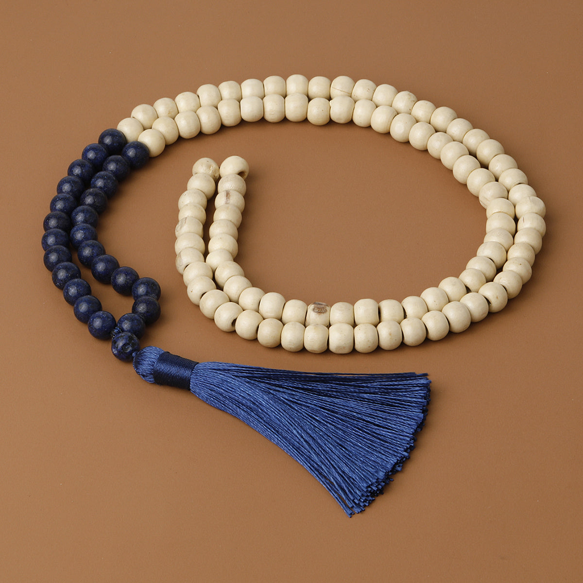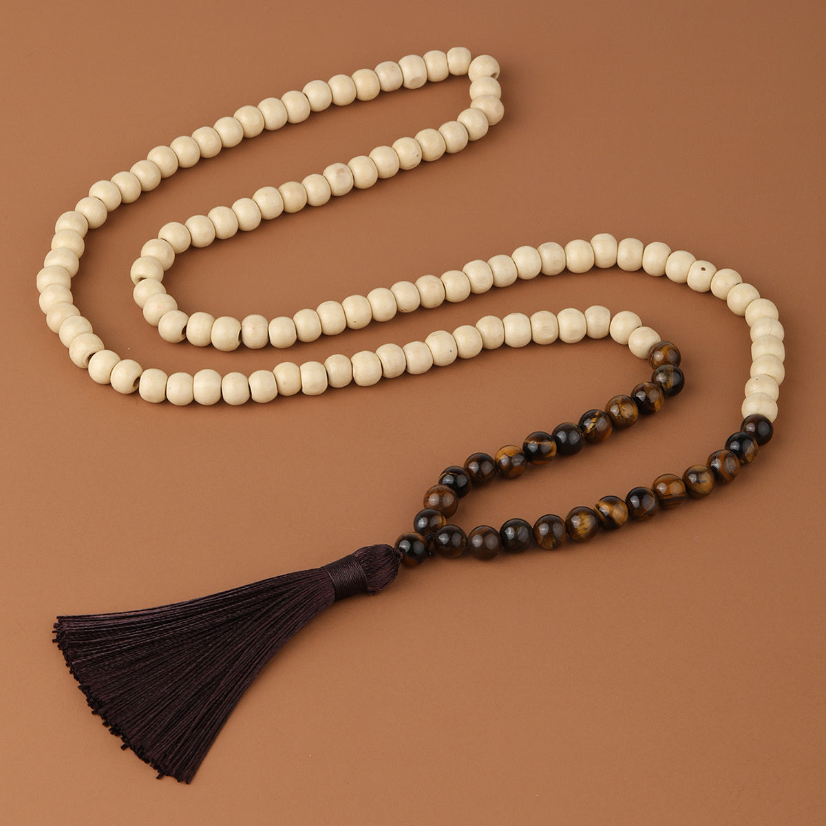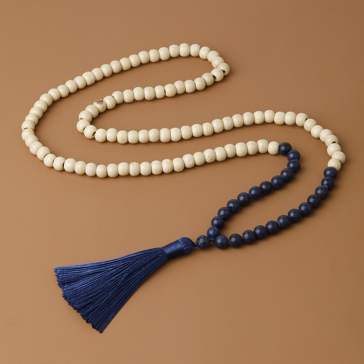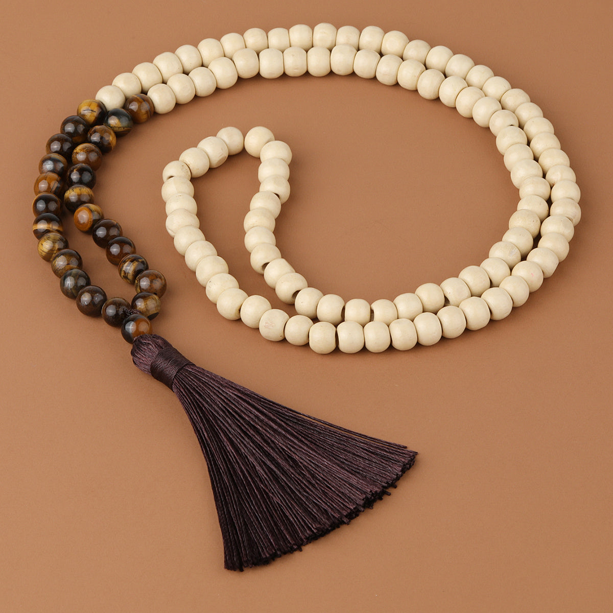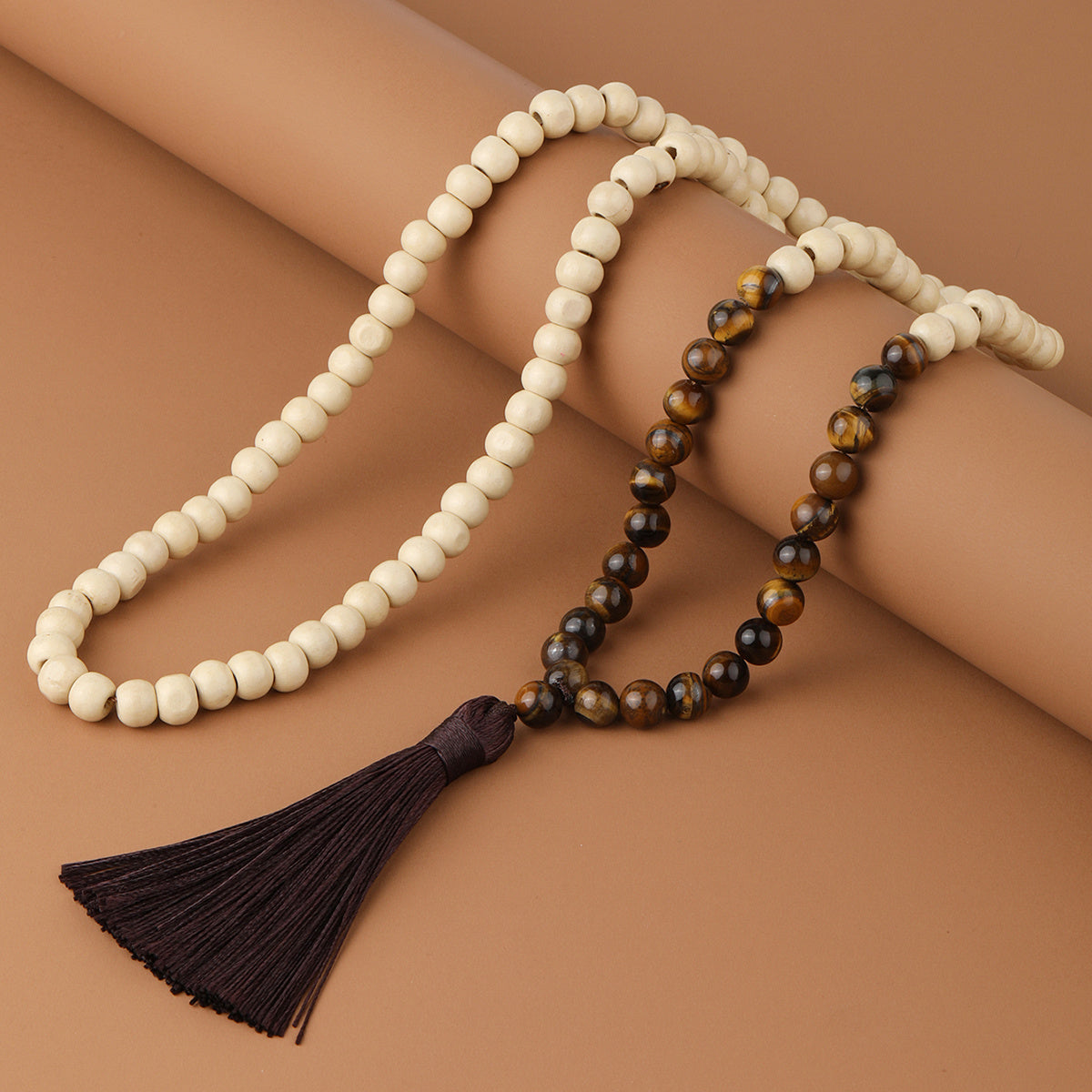 Elevate your style with this fashionable necklace featuring 8mm natural stone and wood beads with a tassel. It adds a touch of sophistication to your look.