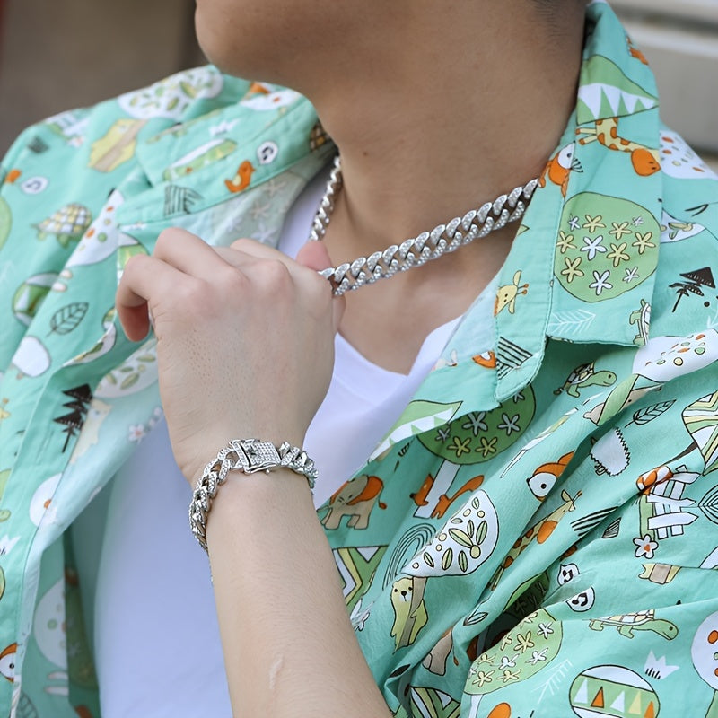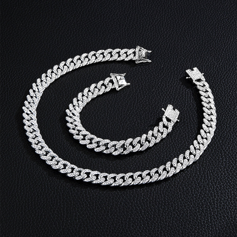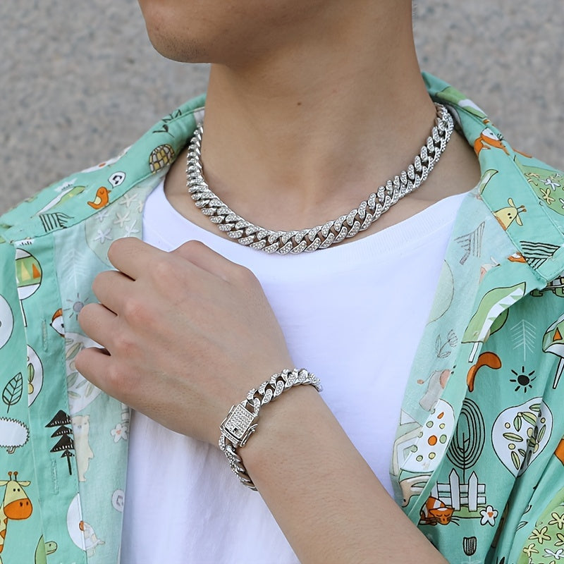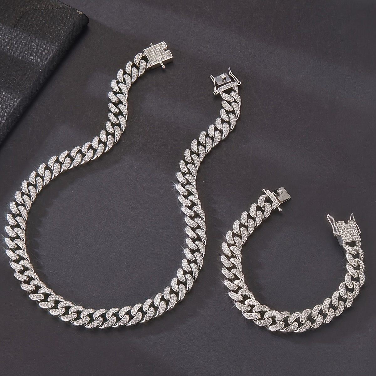 Enhance your style with this stunning 2-piece set featuring a rhinestone hiphop chain necklace and bracelet. Perfect for a bold and fashionable look.