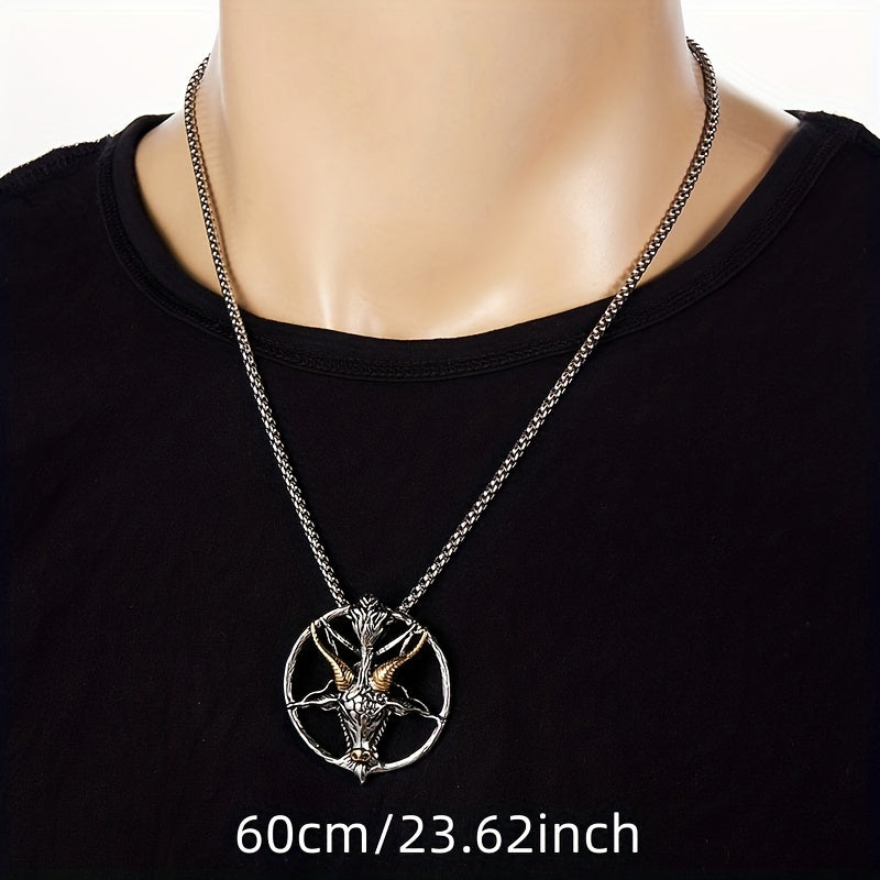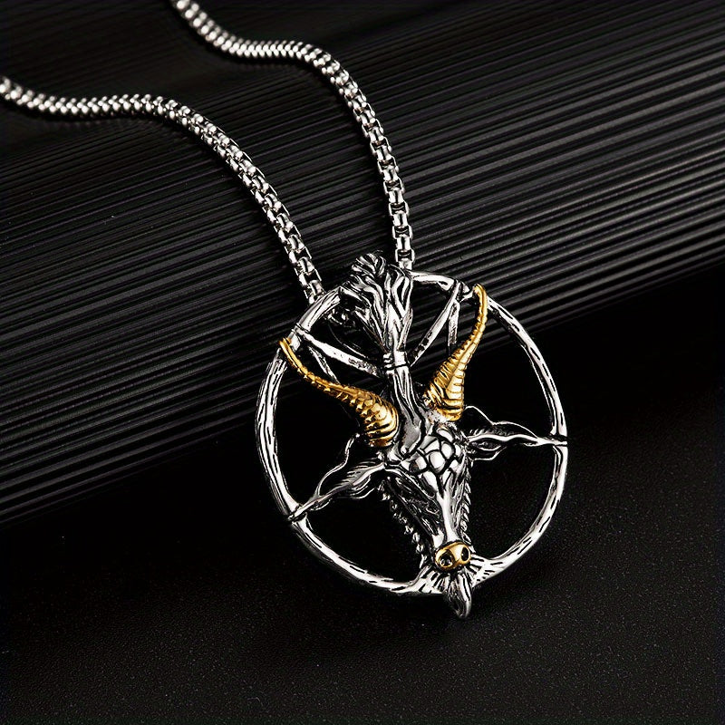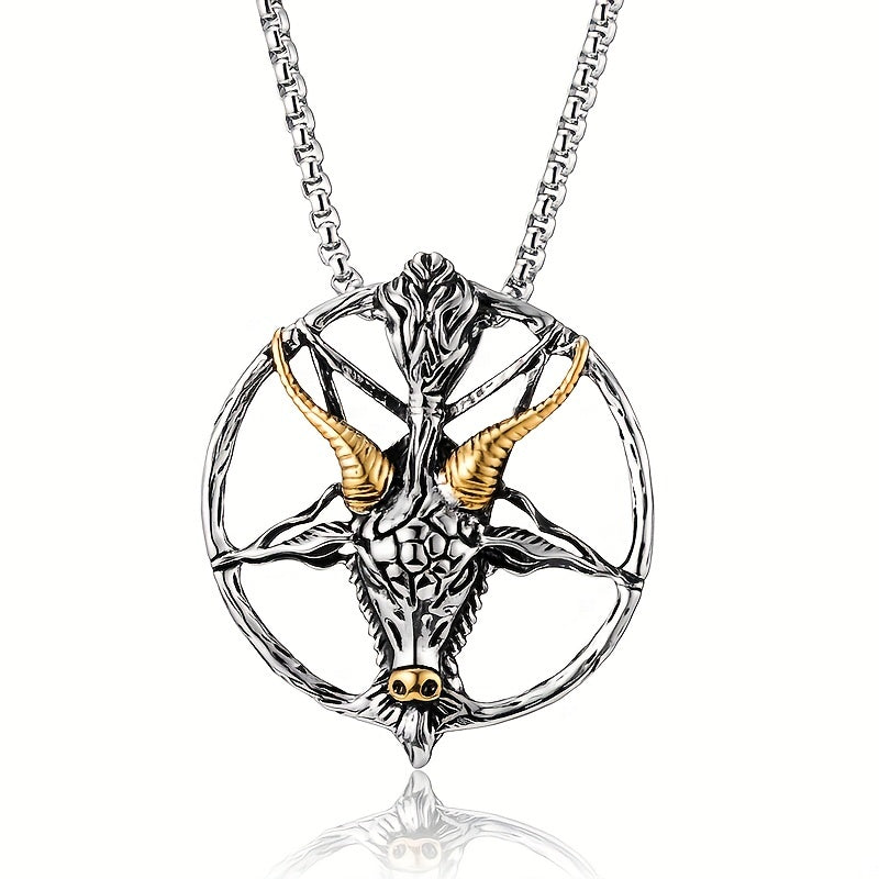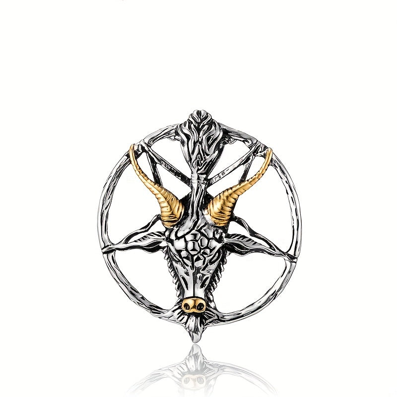 Embrace a gothic style with this silver pendant featuring a satanic goat within an inverted pentagram design.